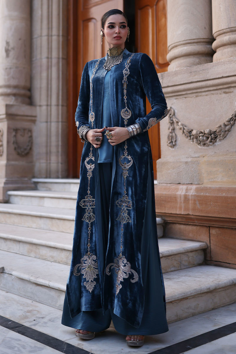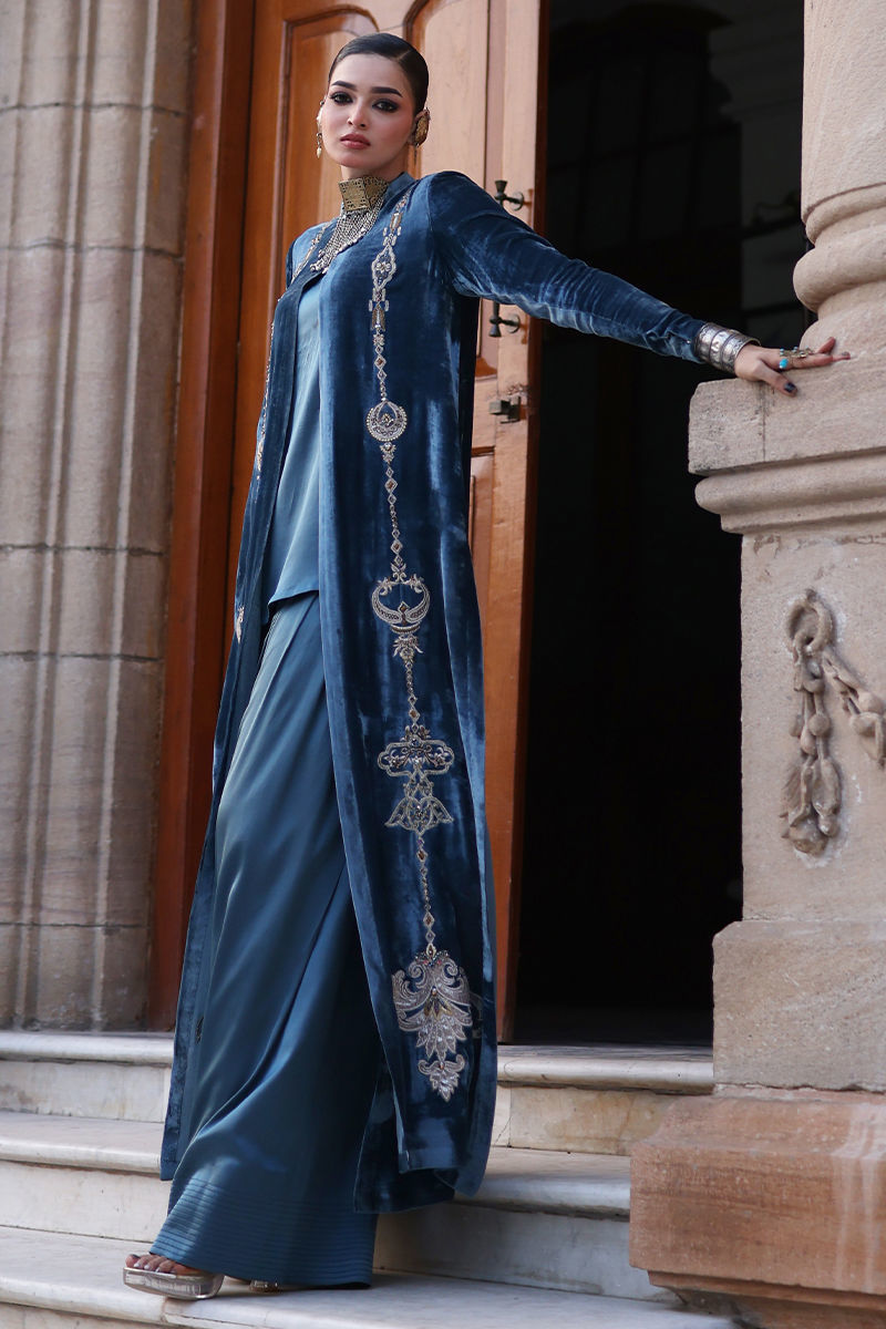 A front-open pure velvet jacket in a serene Copen Blue hue, paired with a matching inner and farshi culottes crafted from cotton charmeuse. The jacket features exquisite silver appliqué work, complemented by gold, antique, and silver zari embroidery. Heavy zardozi embellishments — including imported crystals, dabka, nakshi, stones, cutdana, and moti — adorn the front and sleeves, creating a striking interplay of texture and light. This ensemble captures the essence of timeless luxury and refined craftsmanship.