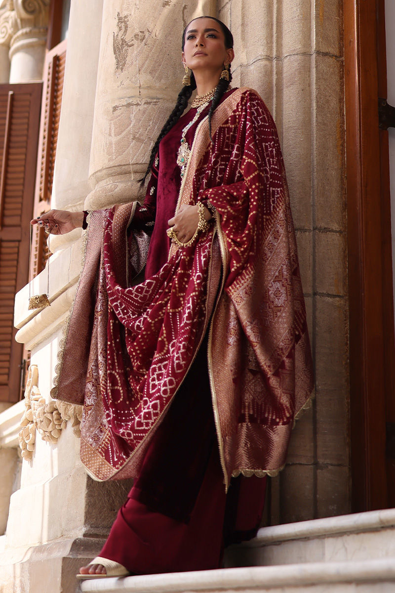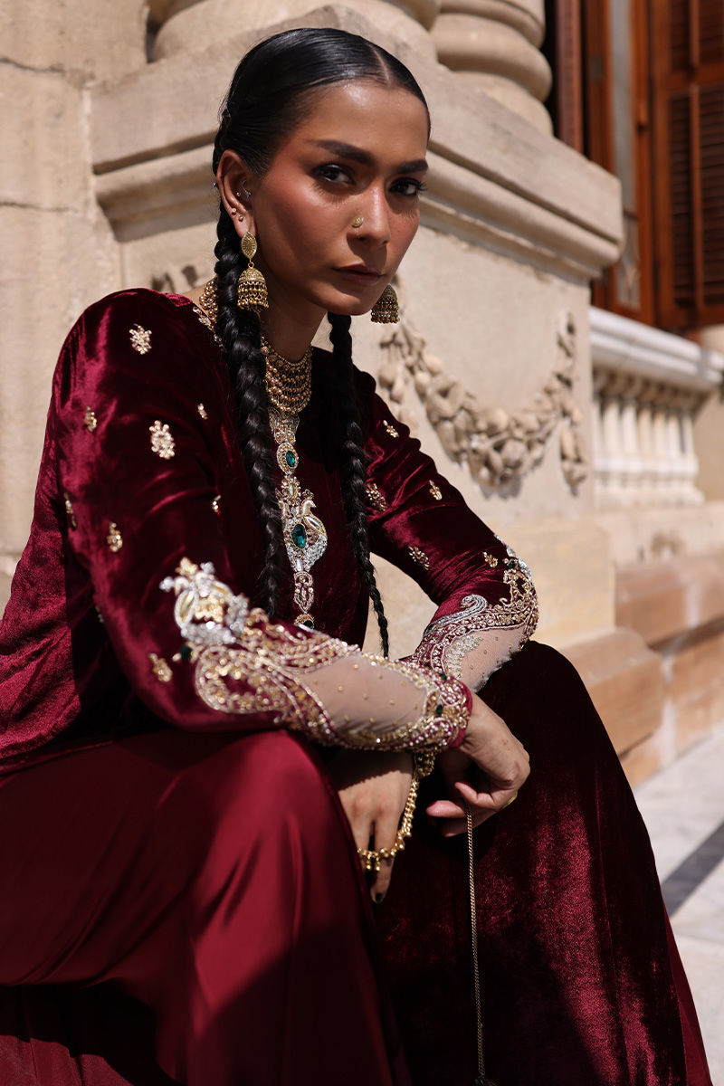 A straight-cut pure velvet shirt in a deep Ruby Wine hue, adorned with gold, silver, and antique heavy zardozi embroidery. The intricate handwork features dabka, nakshi, pearls, stones, cutdana, sequins, moti, and kaamdani across the front and sleeves, reflecting exceptional craftsmanship. Paired with cotton charmeuse culottes and a pure banarsi chiffon dupatta, this ensemble epitomizes timeless elegance and regal sophistication.