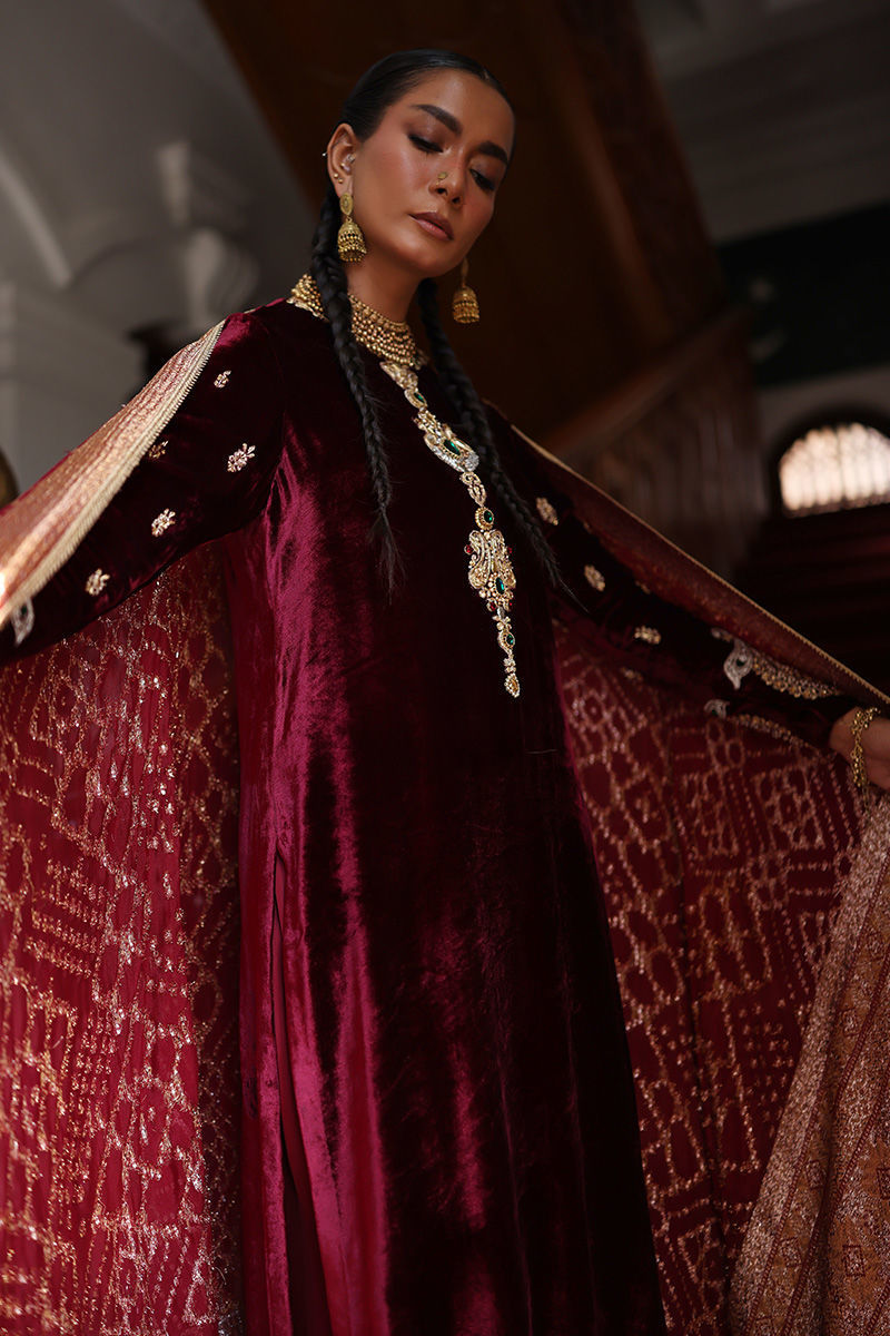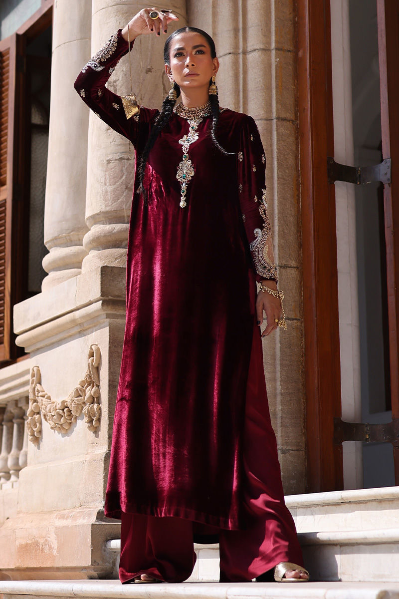 A straight-cut pure velvet shirt in a deep Ruby Wine hue, adorned with gold, silver, and antique heavy zardozi embroidery. The intricate handwork features dabka, nakshi, pearls, stones, cutdana, sequins, moti, and kaamdani across the front and sleeves, reflecting exceptional craftsmanship. Paired with cotton charmeuse culottes and a pure banarsi chiffon dupatta, this ensemble epitomizes timeless elegance and regal sophistication.