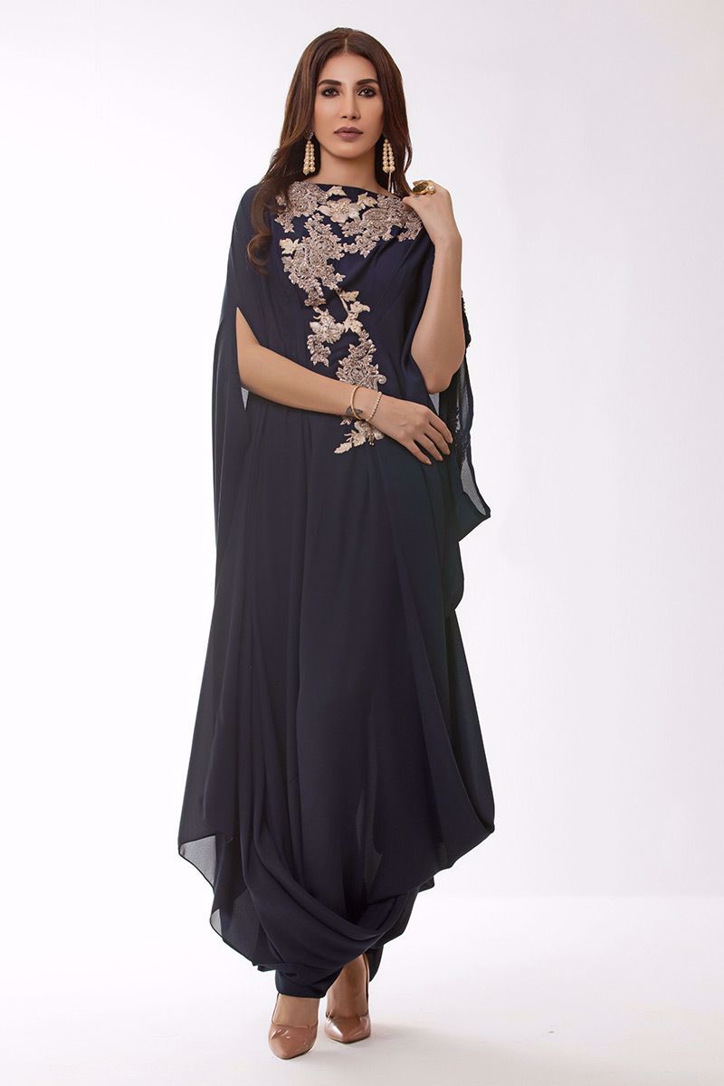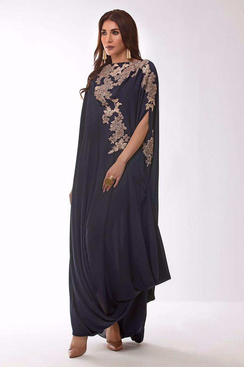 Navy blue georgette pleated Kaftan with resham and pearls embroidery.