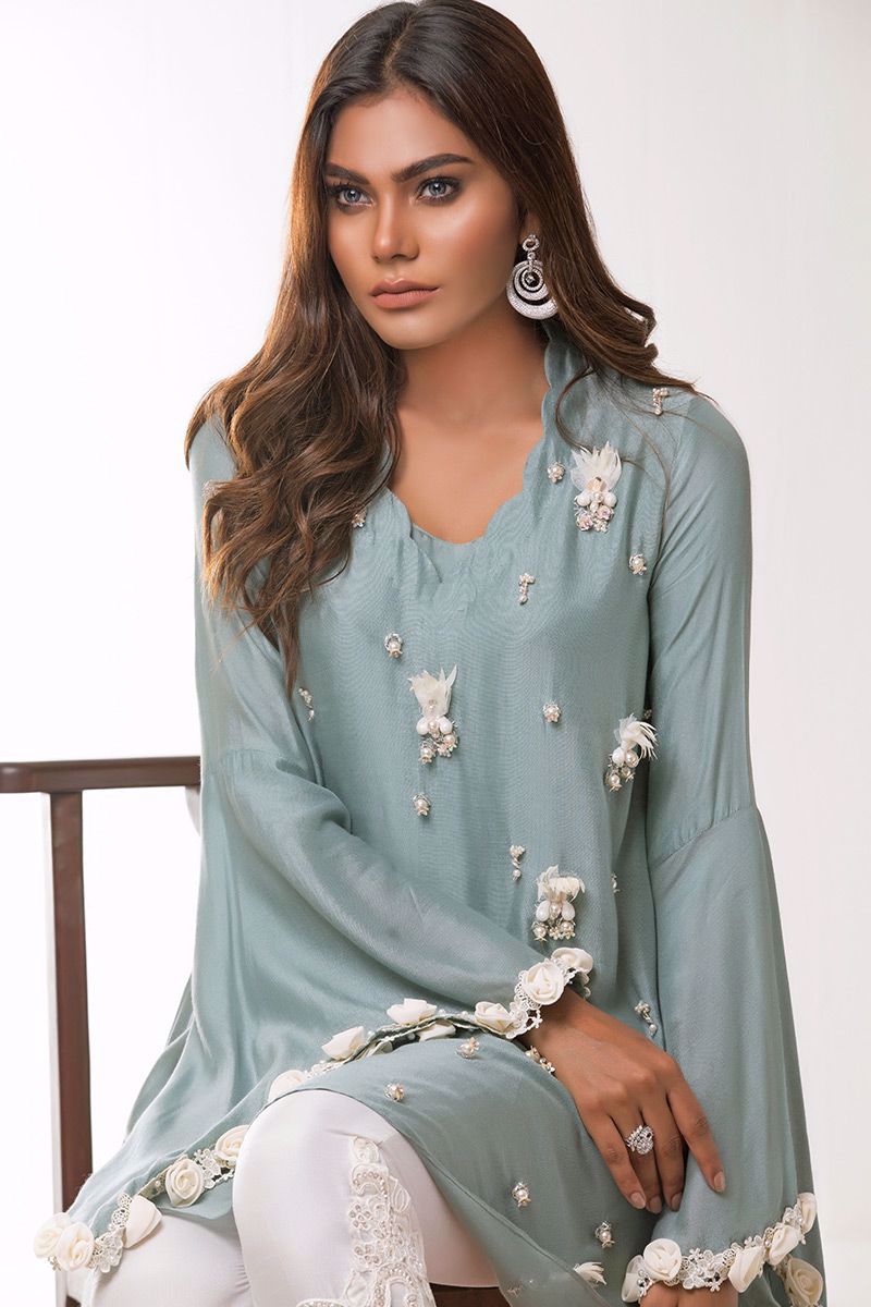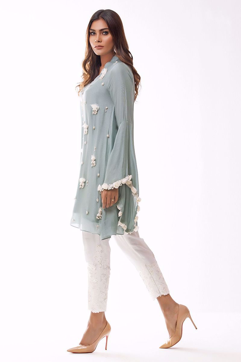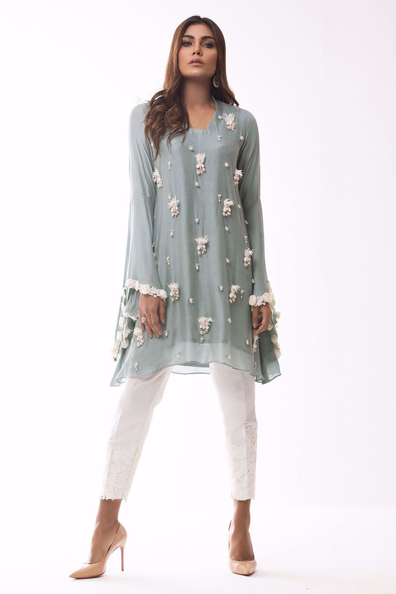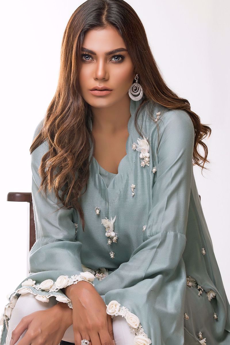 Greyish blue khadi net Shirt hand worked with different materials such as pearls, cut dana, sequins, moti and 3D flowers etc.