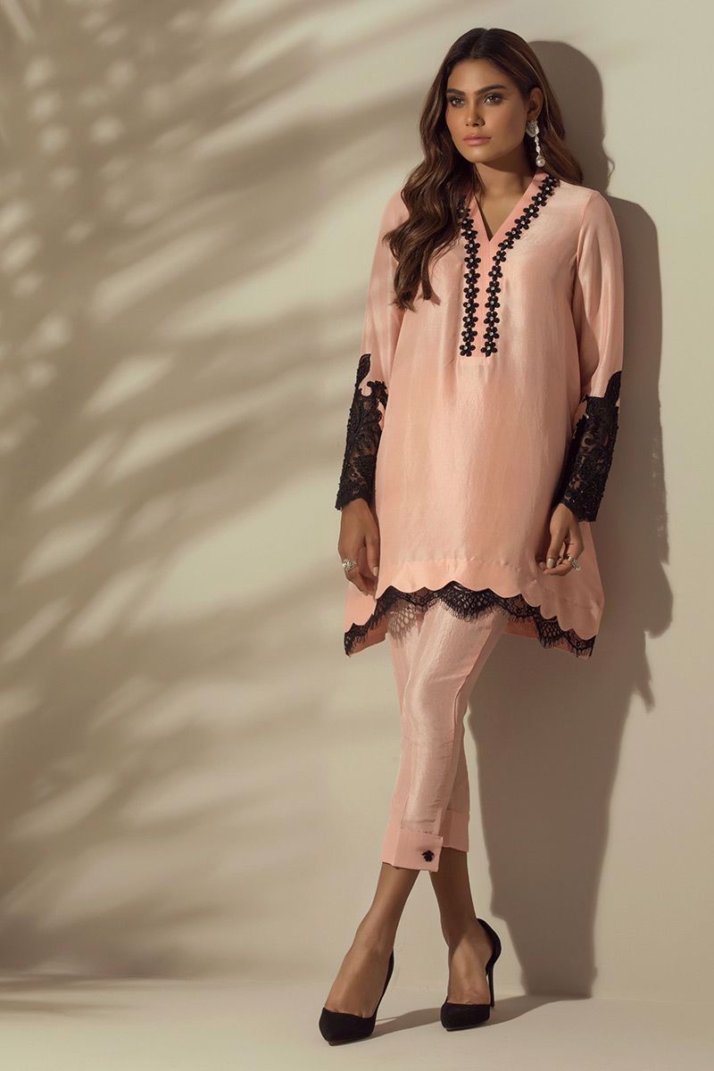 Gorgeous Peach colored pure raw silk Top embellished with black laces, nets and Chantilly border, handwork of stones and beads has been added to enhance the look.