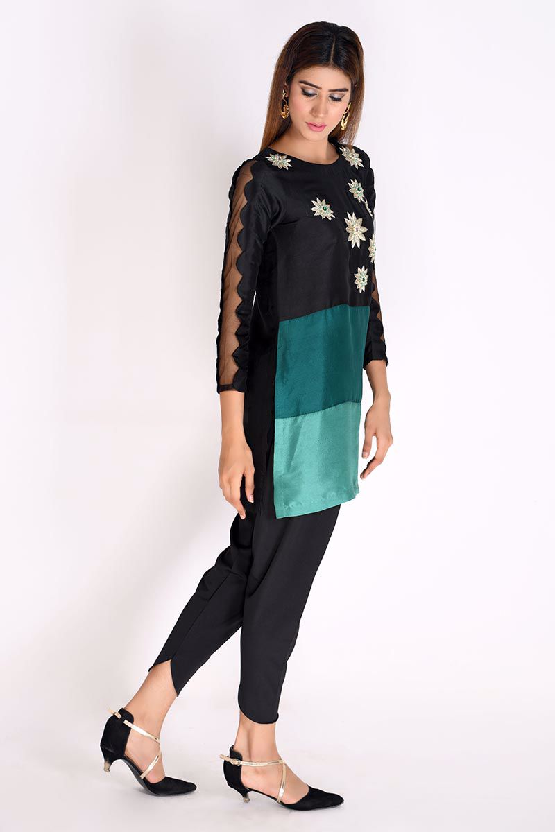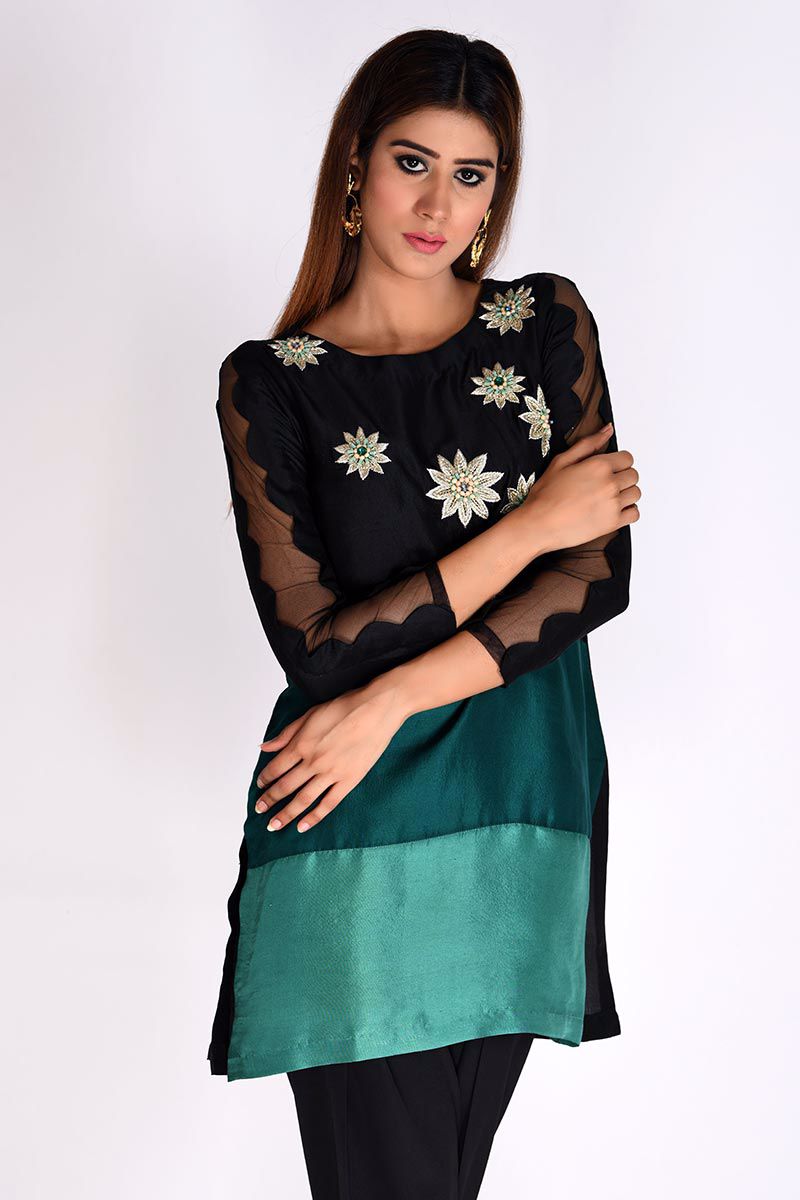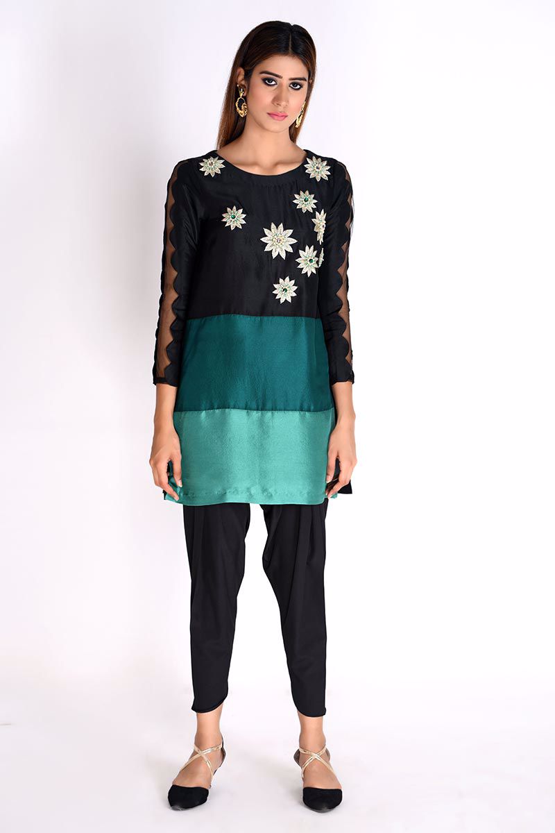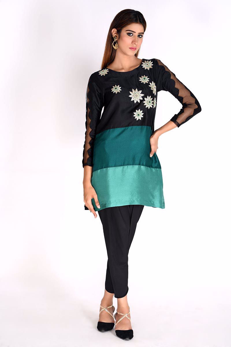 Bespoke handcrafted black pure raw silk Top with color blocking of green hues, detailed with handwork of zari, stones, crystals, and beads. Khari shalwar with a slit can be bought separately to complete the look.