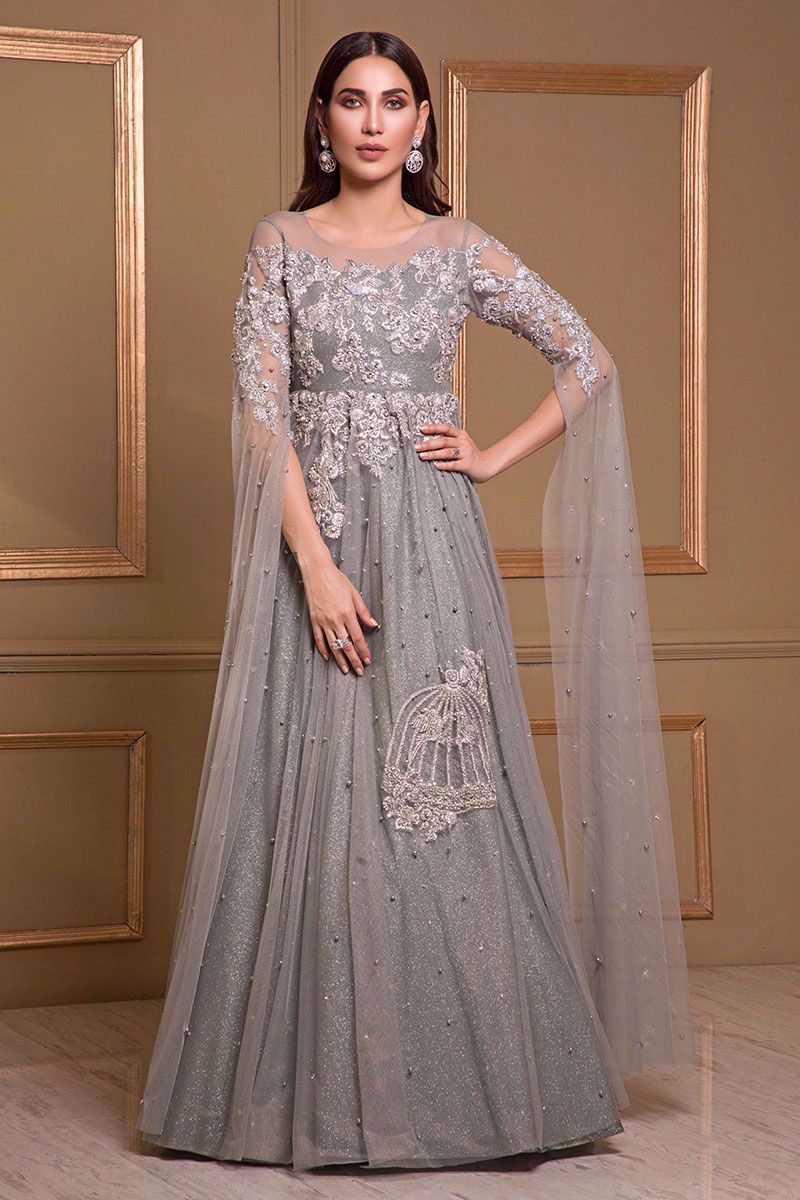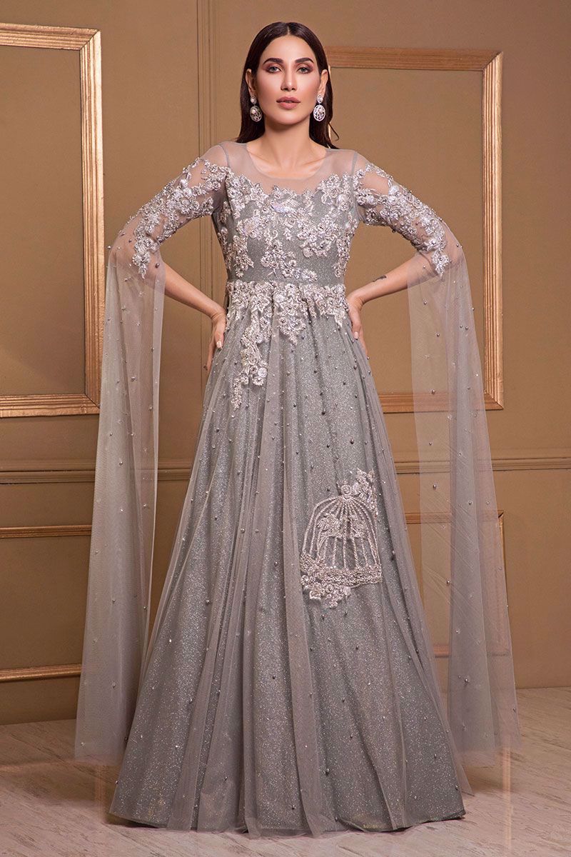 A breathtaking aqua grey net gown with aqua moonlight shimmer under layer tailored with beautiful dramatic sleeves embellished with silver stones, sequins, cut dana, tikki stones complimented with dabka and zardozi handwork all over the gown.