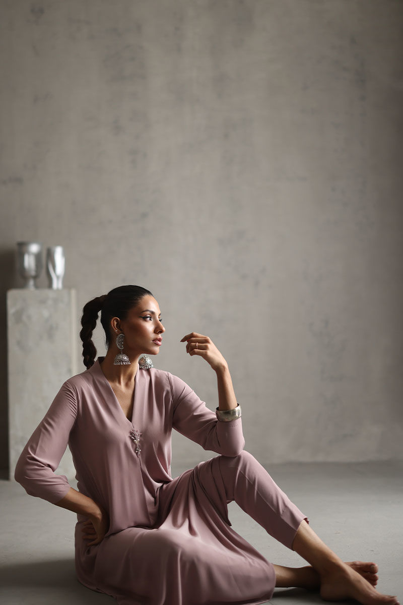 Embrace the ethereal charm of our Dusty Pink Georgette ensemble, a testament to modern elegance. The free fall georgette material gracefully cascades into a box-pleated A-line shirt, adorned with intricate details. Slits on the sides add a contemporary touch. The delicate interplay of pearls, organza, tiki stones, sequence, and crystals on the button patti elevates this ensemble to a work of art. Paired with straight pants in the matching dusty pink shade. Make a memorable statement at your special event with this exquisite ensemble. The model's Shirt length is 50.