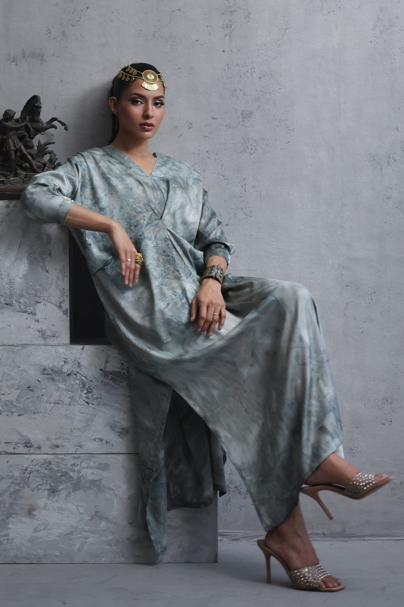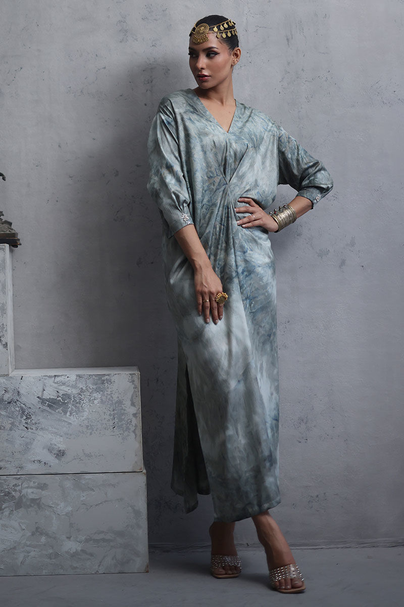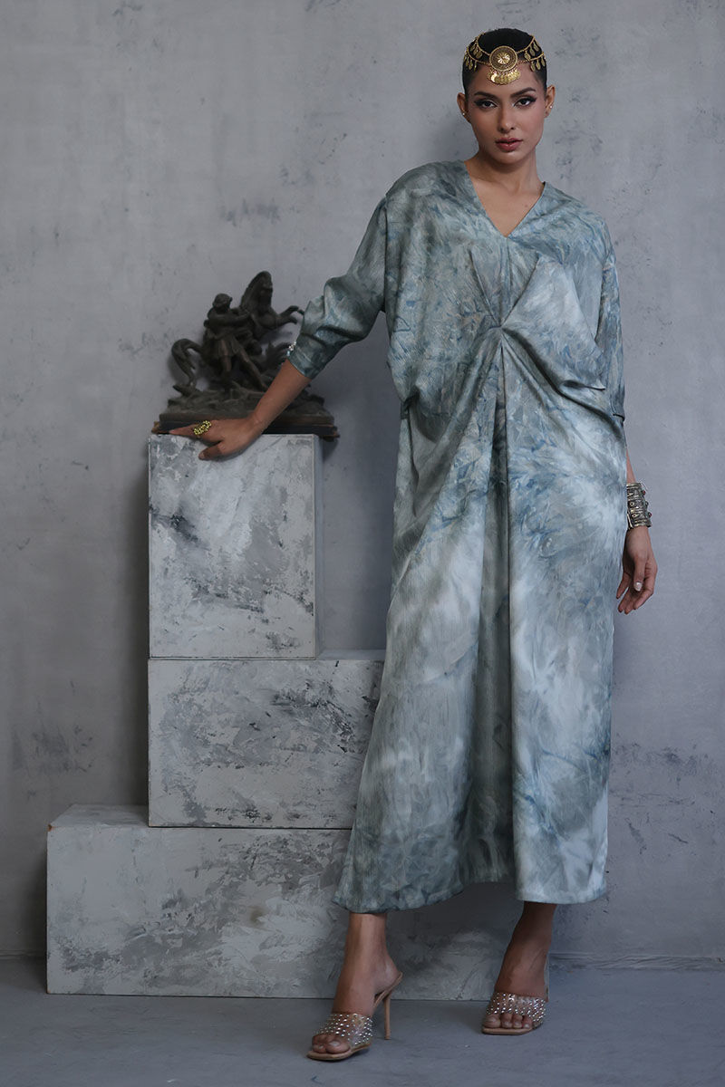 Elevate your style with our mint blue shimmer silk tie and dye Kaftan. Crafted for comfort and elegance, intricate hand worked bootis on the sleeves, adding a touch of sophistication. Perfect for a relaxed yet stylish look, make a statement with this effortlessly chic ensemble. The model's kaftan length is 52.