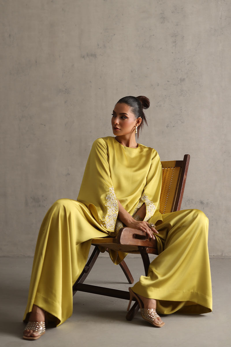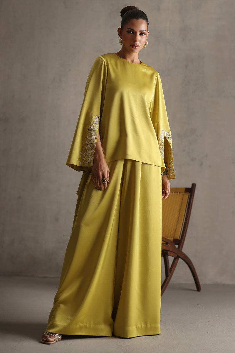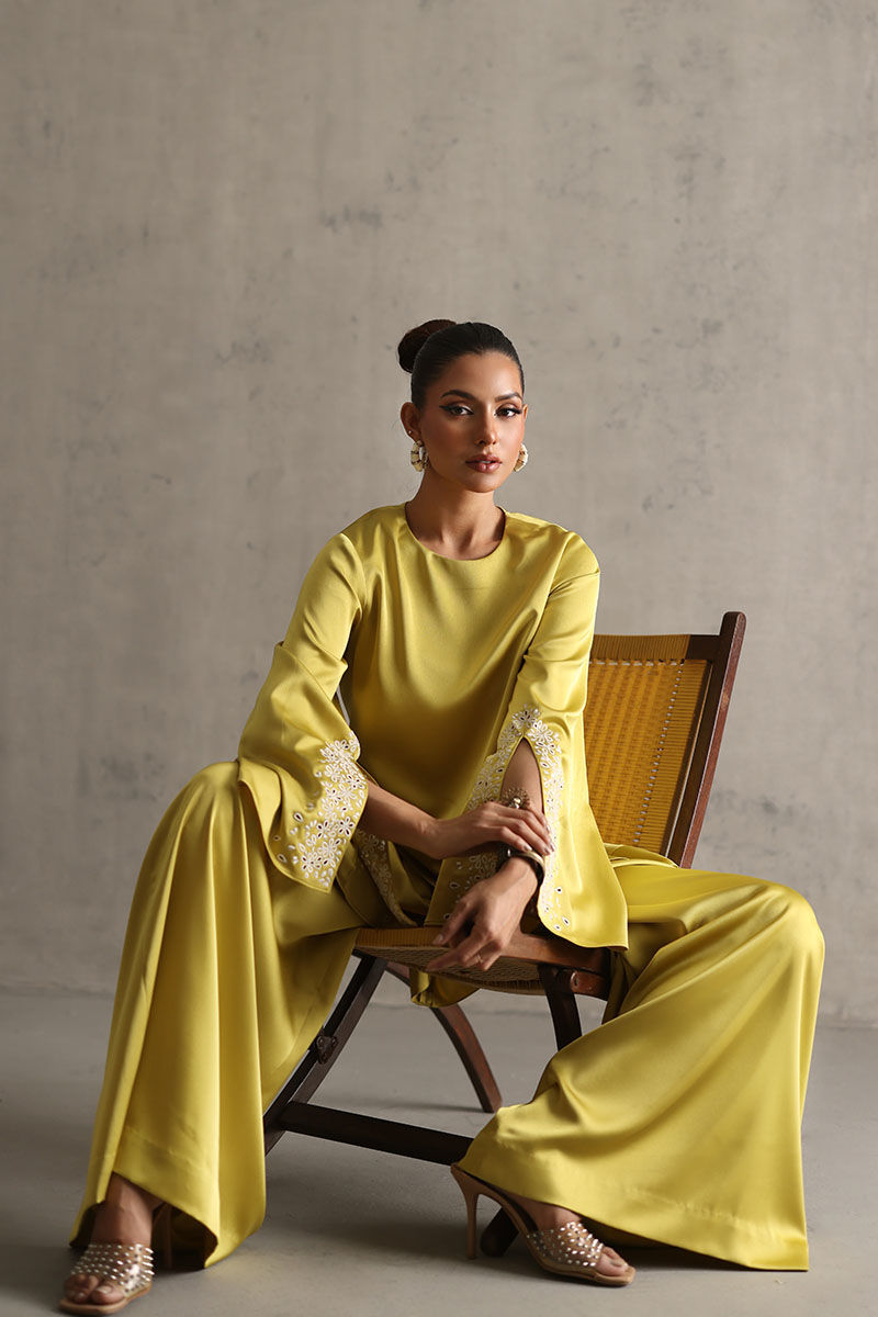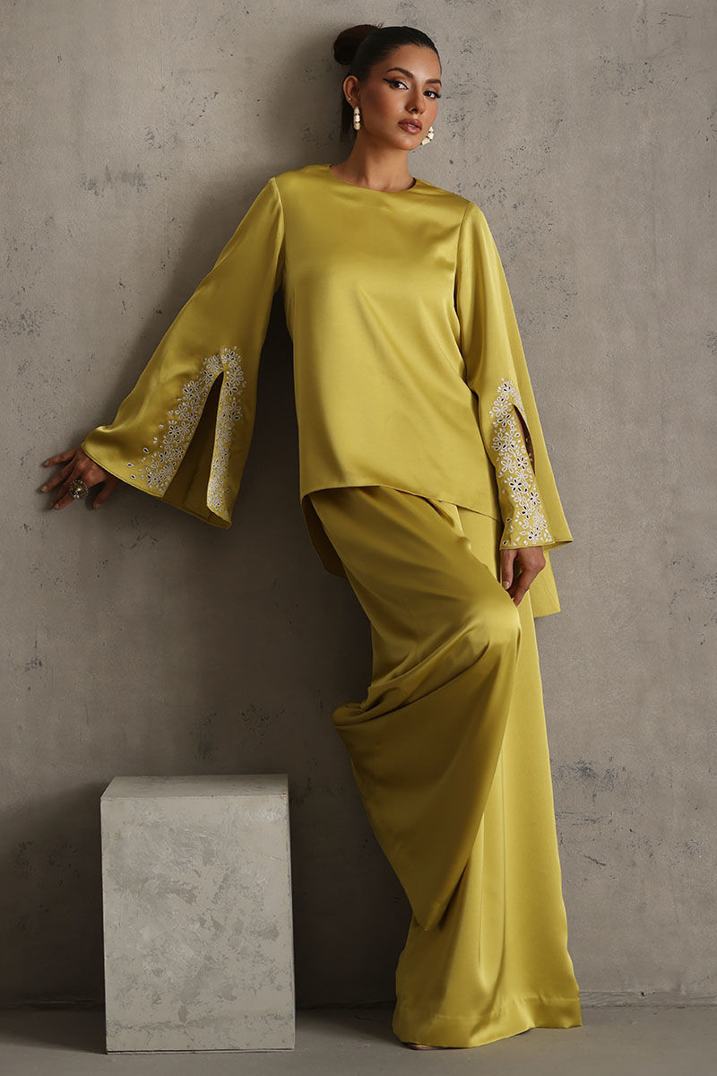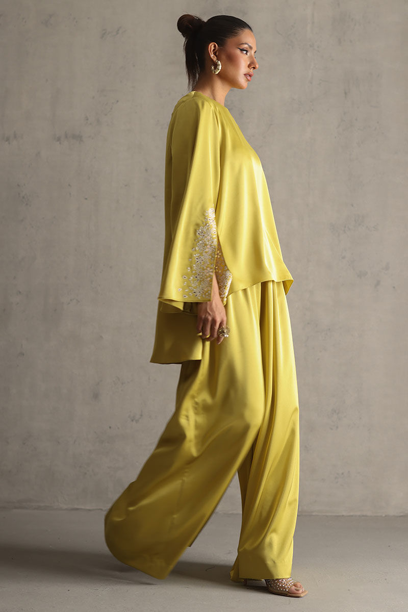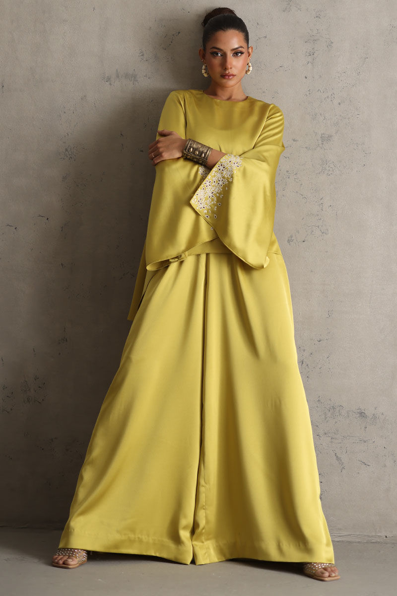Step into style with our dhani green shimmer western crepe ensemble. The top, with a dynamic silhouette and cutwork embroidery on sleeves slits, pairs seamlessly with loose pants for comfort and flair. Embrace the vibrant dhani green hue for a refreshing and effortlessly chic look. The model's Shirt length is front centre 25 sides length 29 back length 33.