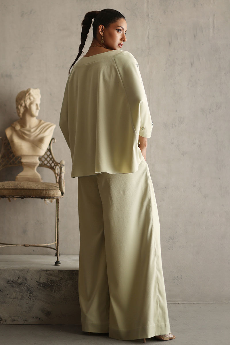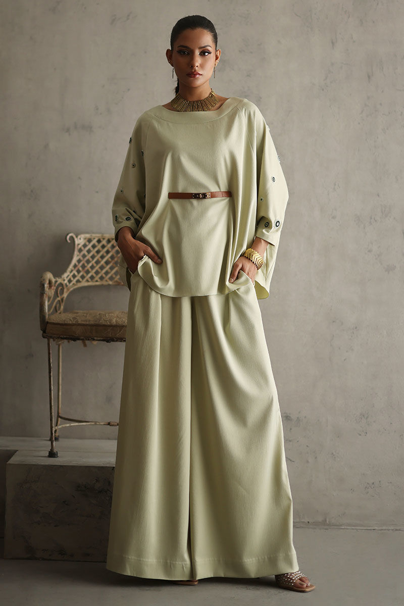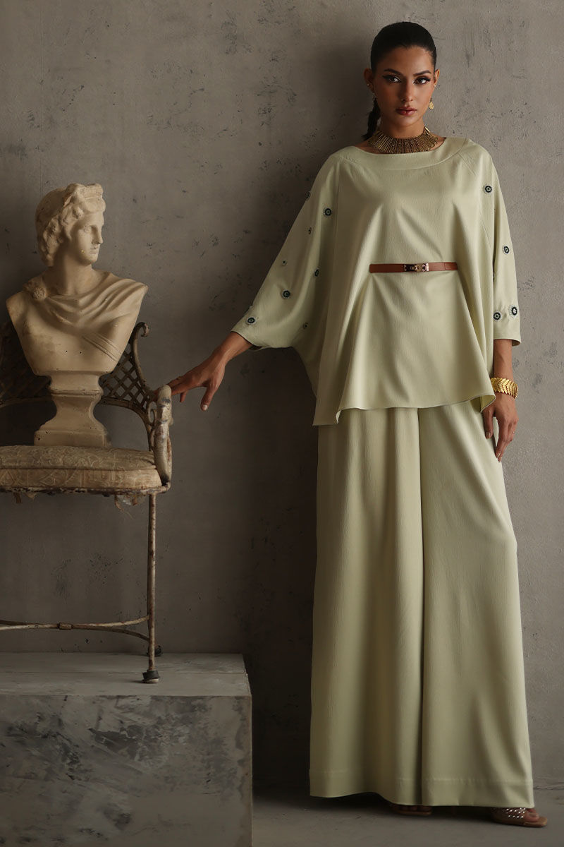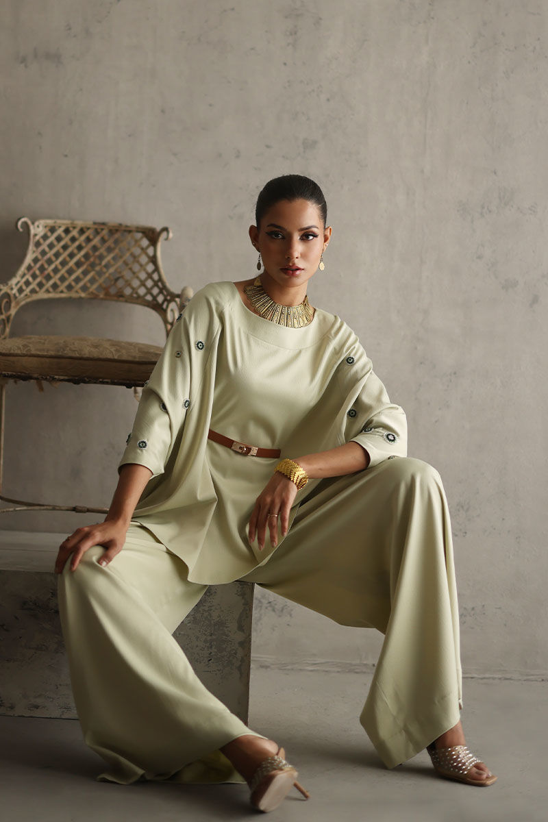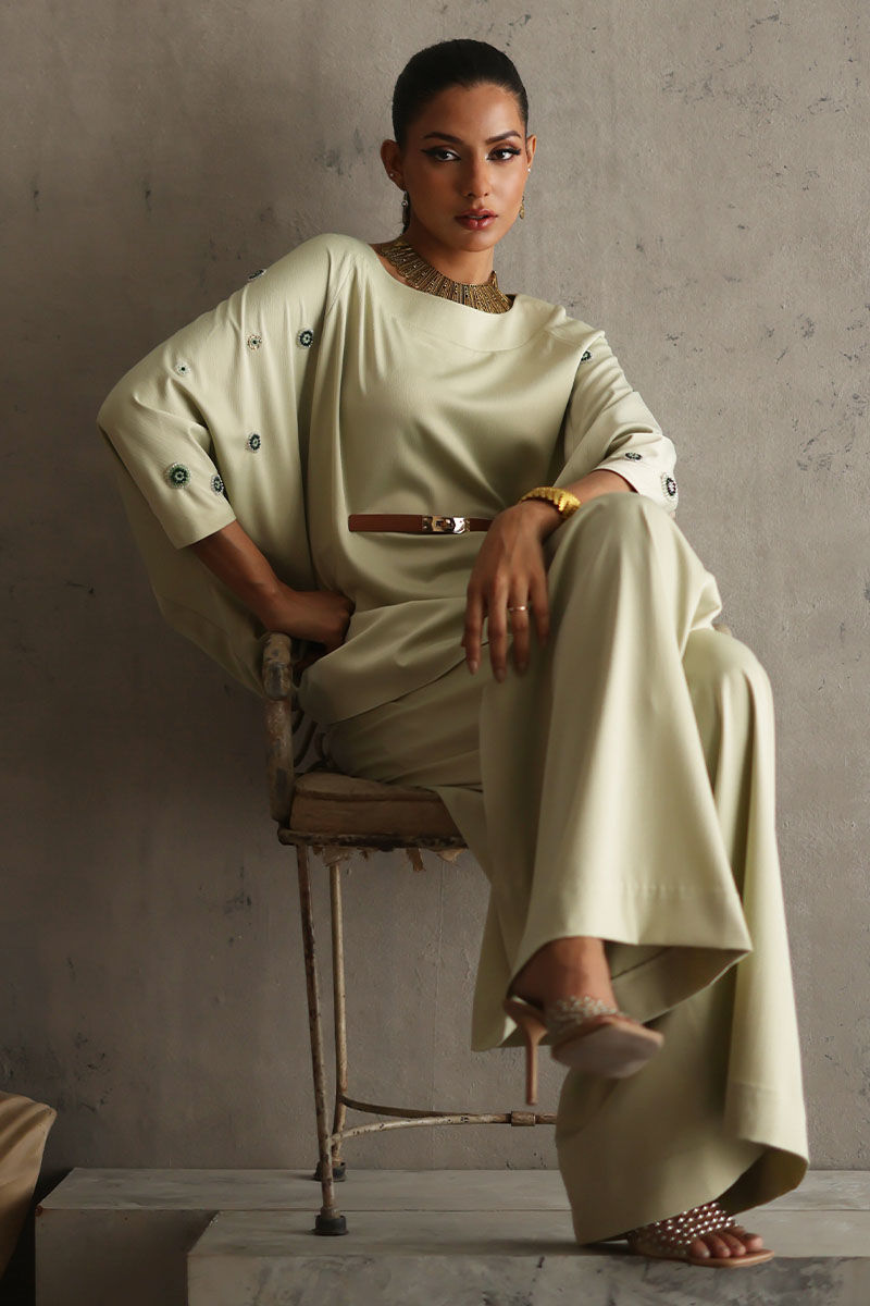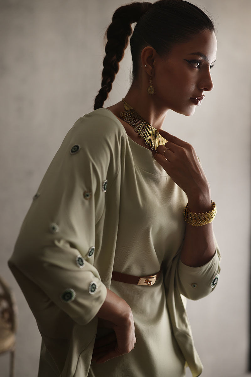 Elevate your style with our mint all-over bootis Ensemble. The sleeves, adorned with crystal beads, create a captivating pattern in a refreshing mint color. The ensemble is completed with a stylish leather belt featuring a gold clip, adding a modern edge to your look. Simple yet sophisticated, perfect for a chic and timeless appearance. The model's top length is 27 to 28.