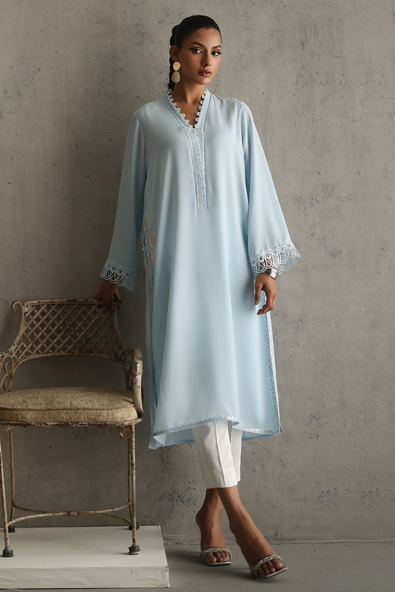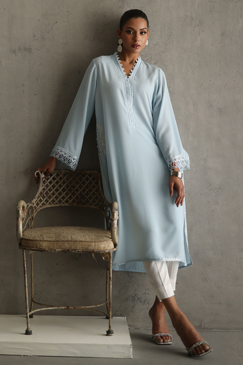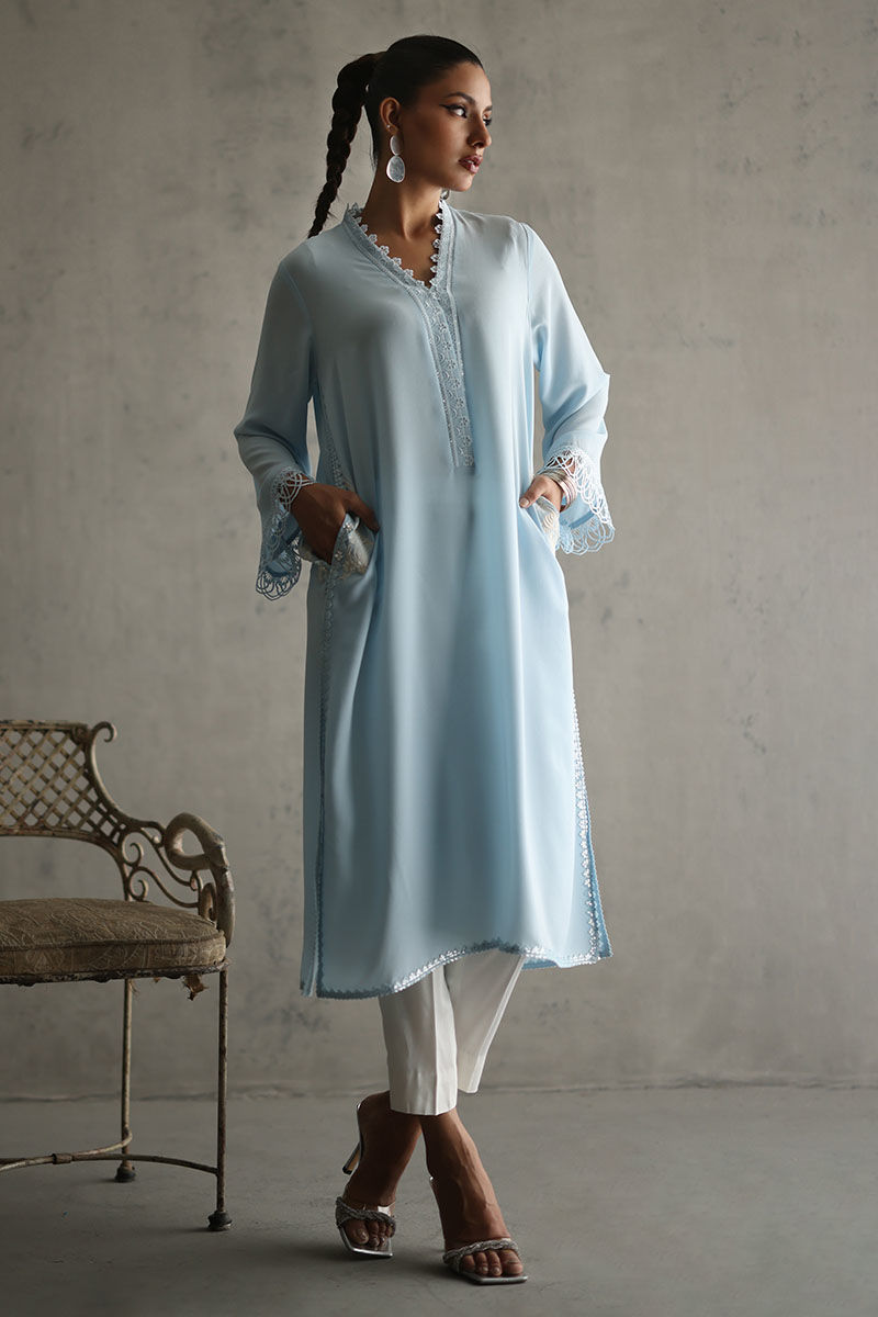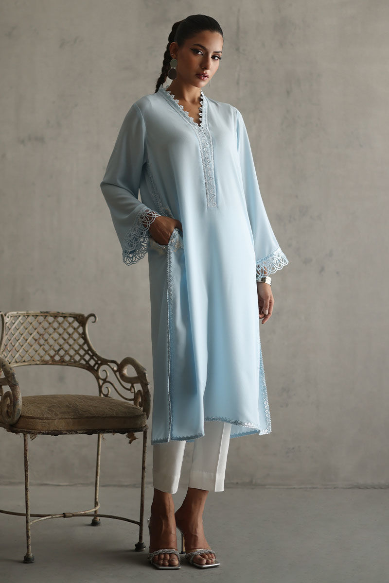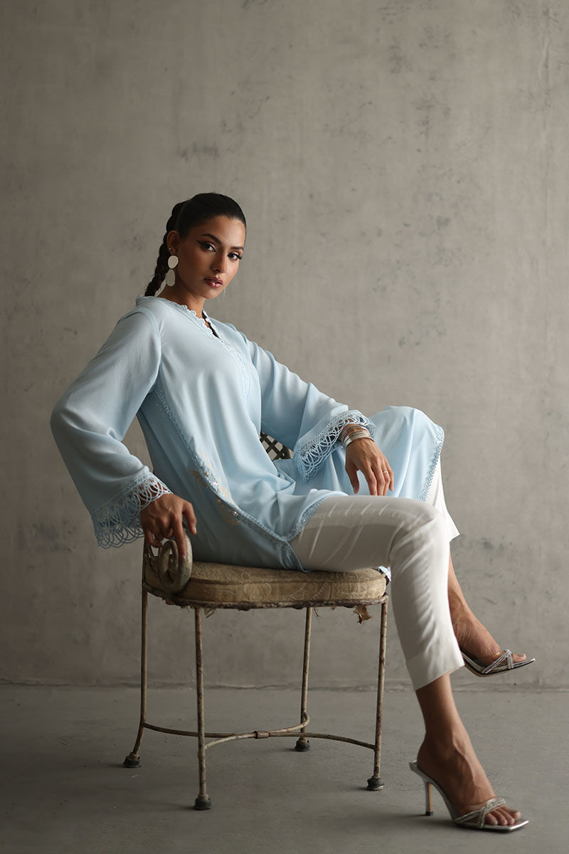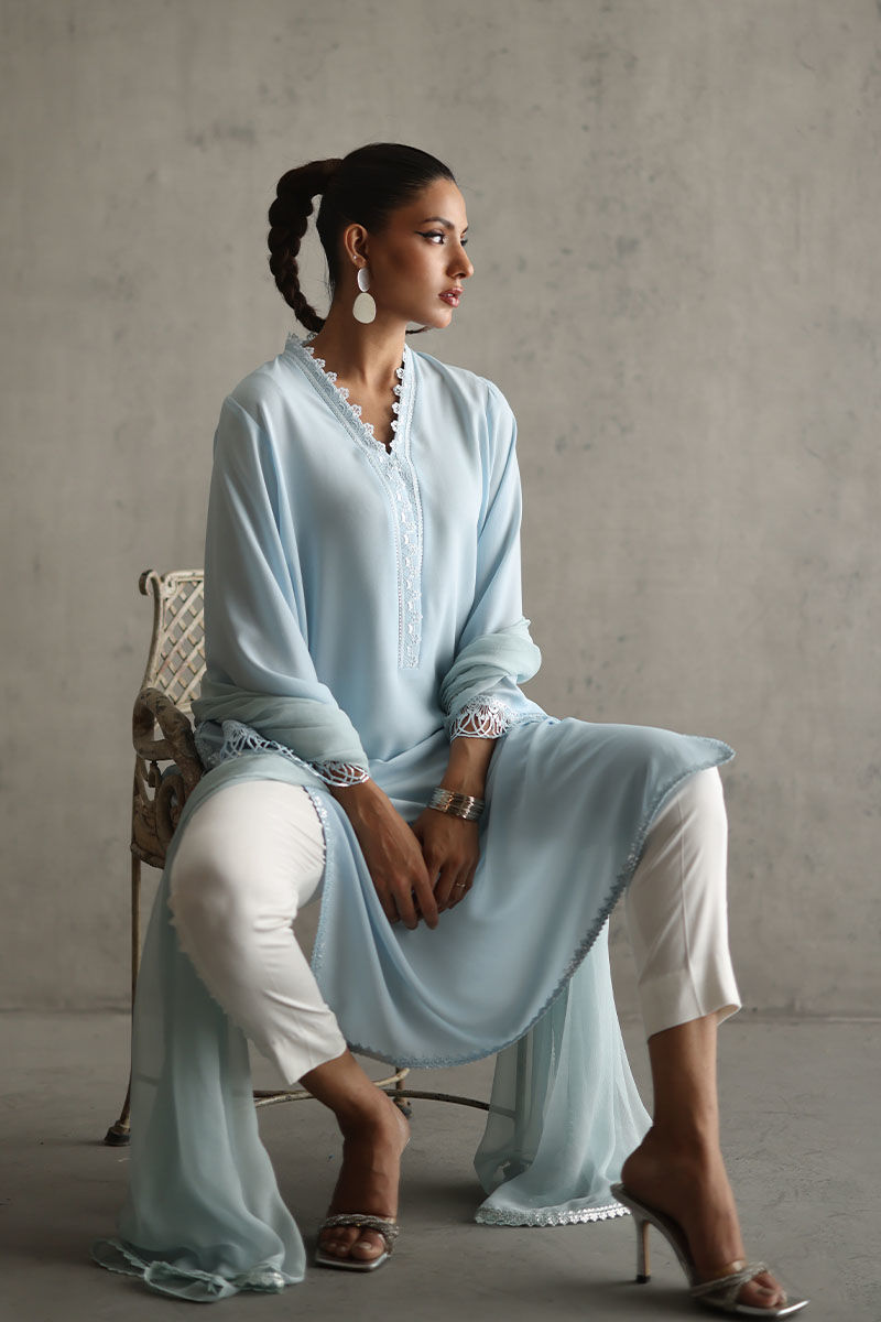 Elevate your style with our powder blue embellished shirt. The pockets, adorned with resham and pearls, add a touch of sophistication. Laces all over the powder blue fabric create a captivating design. The ensemble is completed with a chiffon dupatta featuring laces, paired with white rayon cotton silk pants for a chic and timeless look. The model's shirt length is 45.