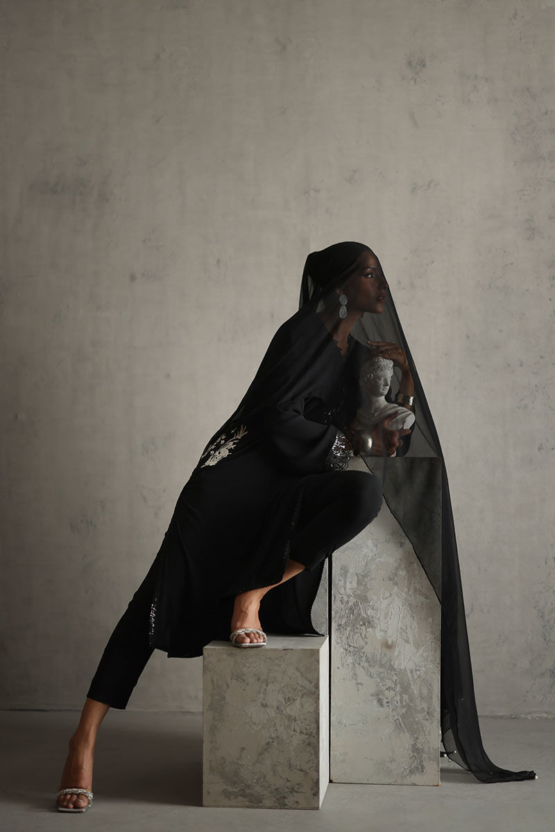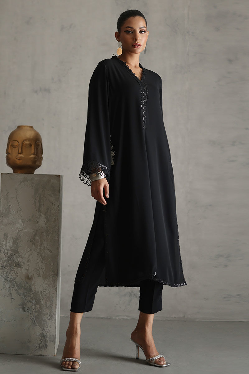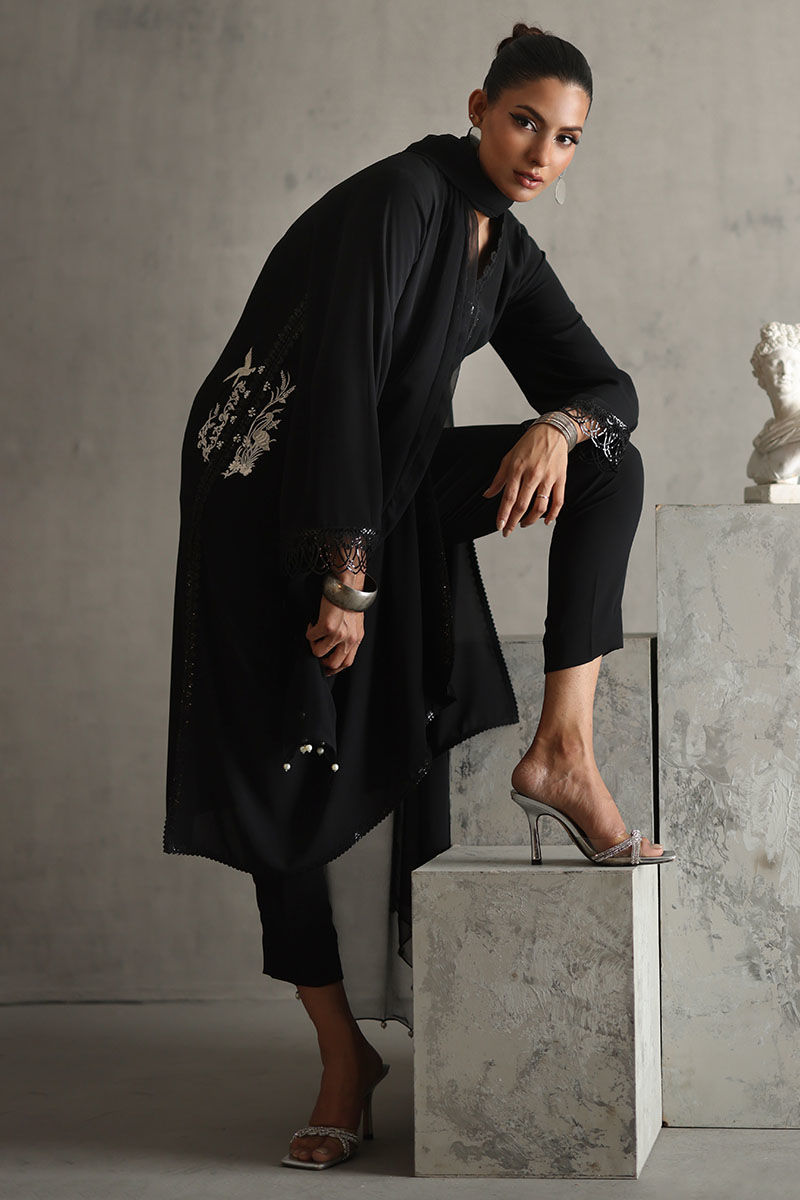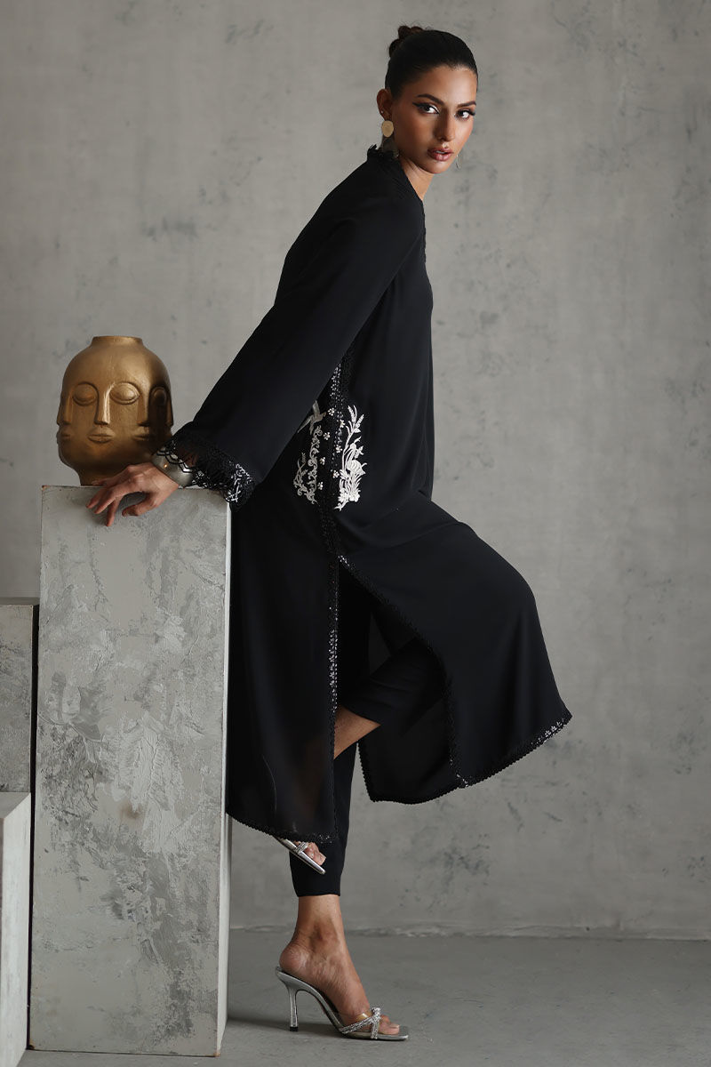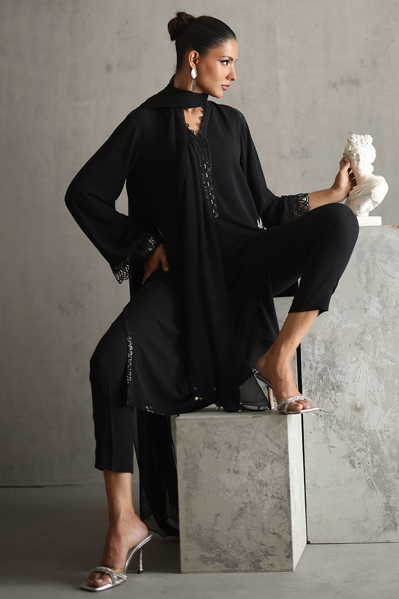 Elevate your style with our timeless black embellished shirt. The pockets, adorned with resham and pearls, exude sophistication. Featuring laces all over, this black ensemble is both classic and charming. Complete the look with a chiffon dupatta embellished with pearls, creating a timeless and elegant aesthetic. The model's shirt length is 45.