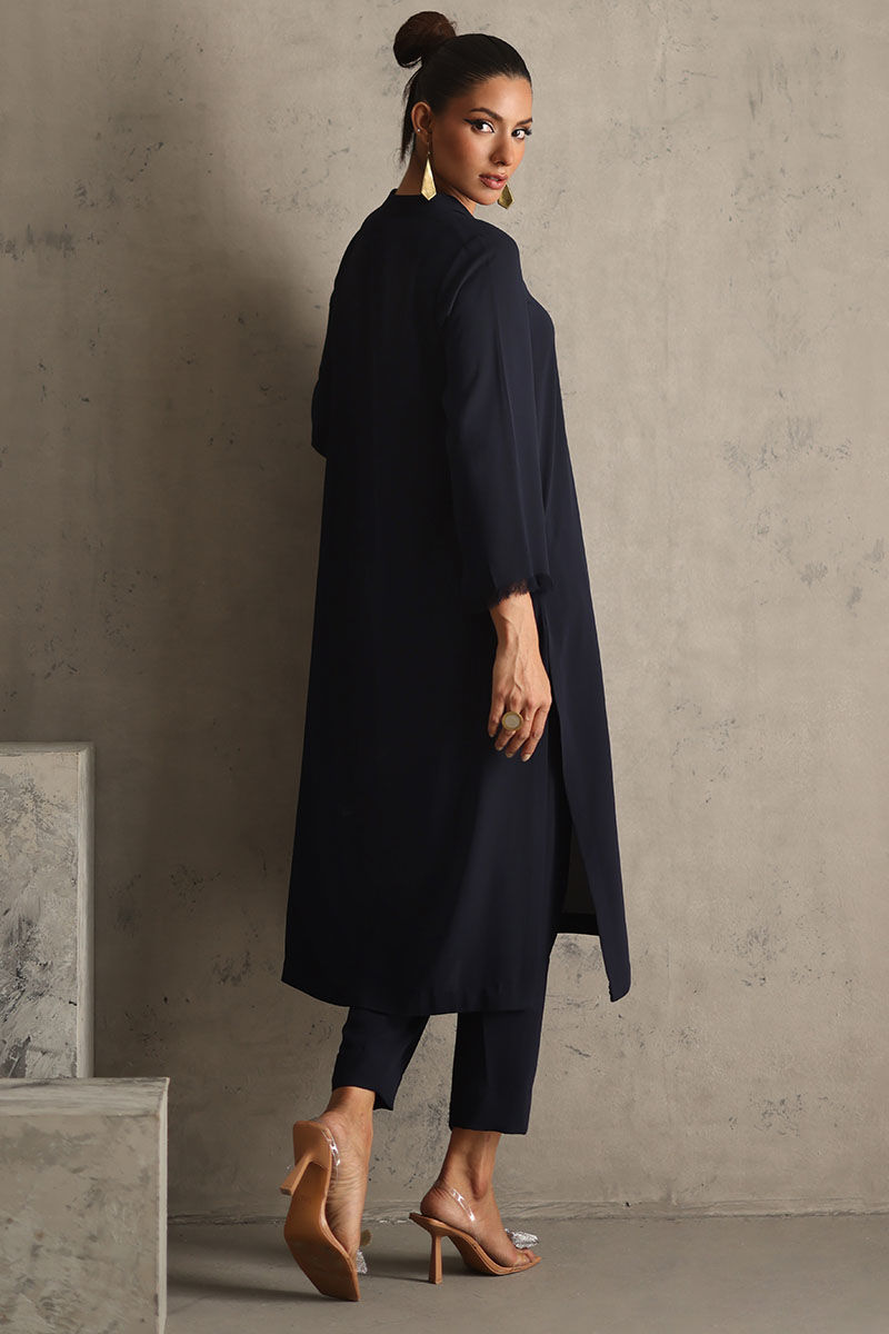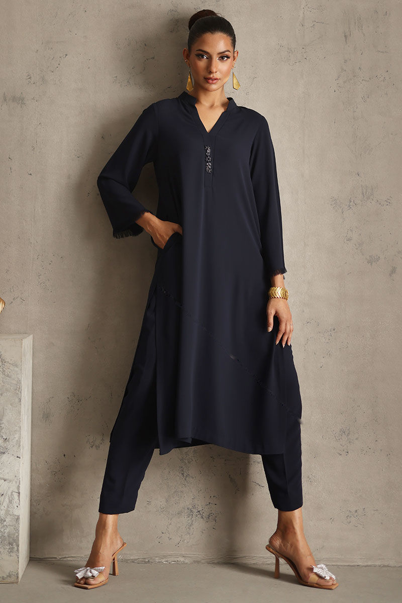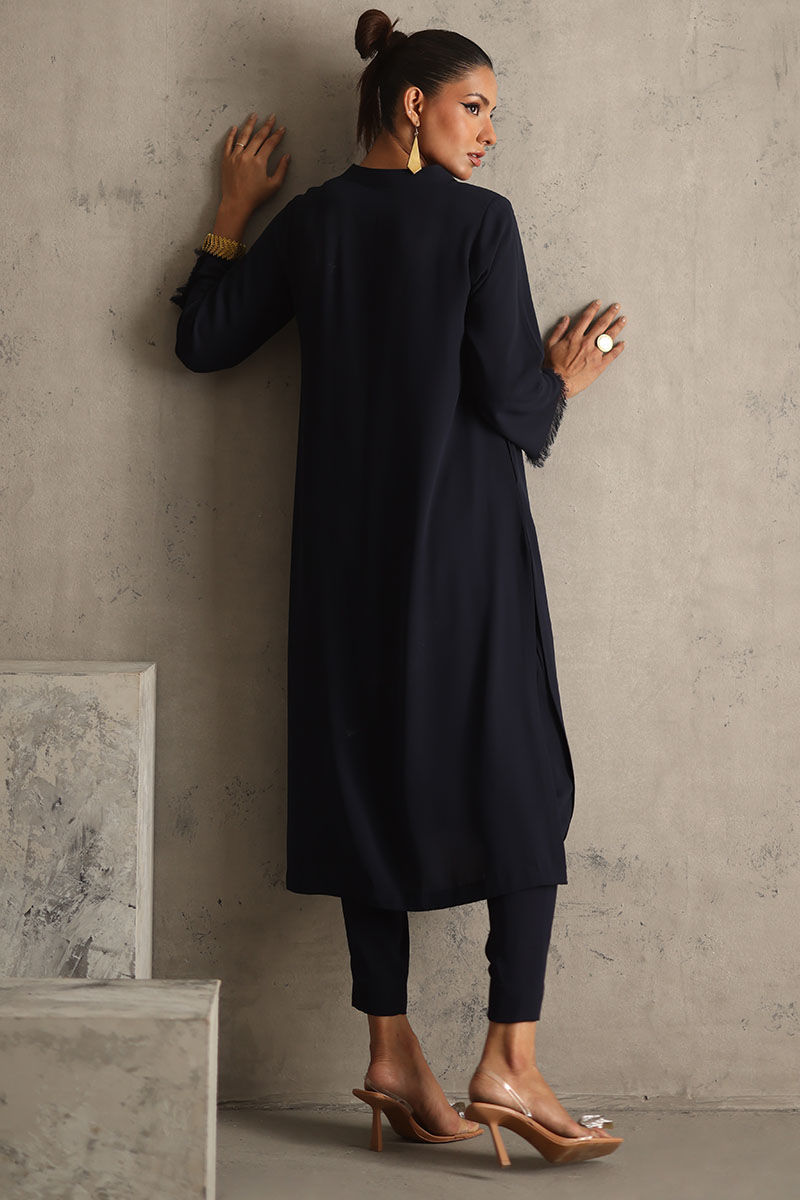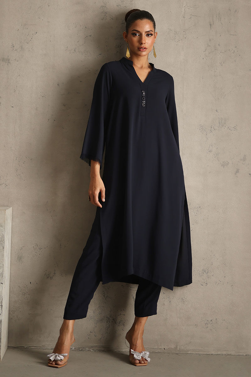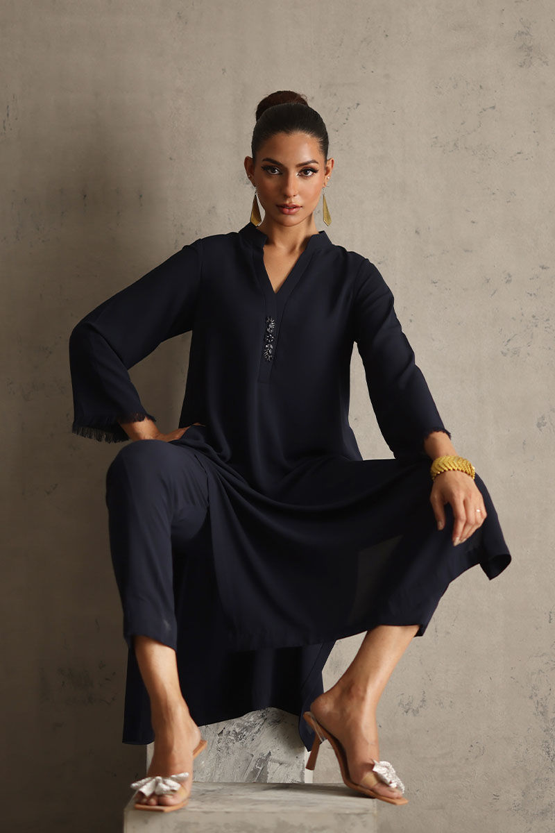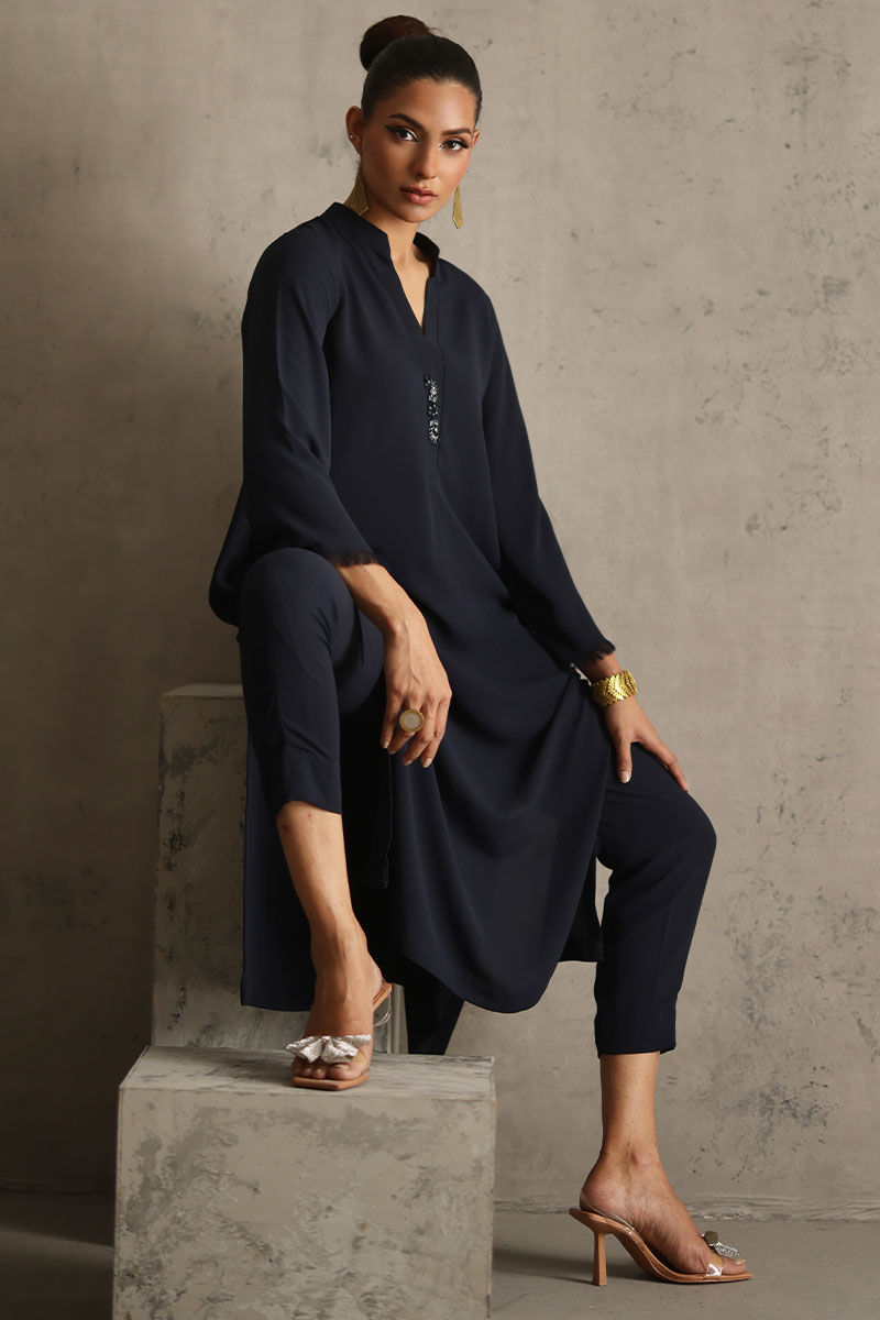 Elevate your elegance with our navy blue georgette ensemble, a fusion of timeless style and modern allure. The free fall georgette shirt. The straight design is complemented by exquisite details, including organza, tiki stones, sequence, and crystals adorning the button patti. The rich navy blue hue adds a touch of sophistication to the ensemble. Paired with straight pants, this ensemble is a statement of refined simplicity with a contemporary twist. The model's Shirt length is 45.