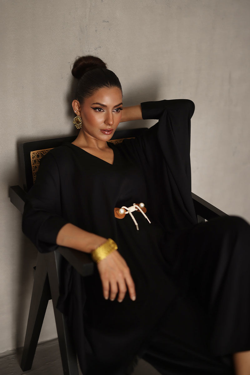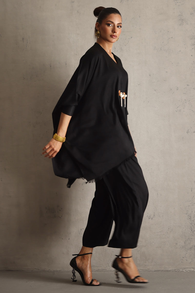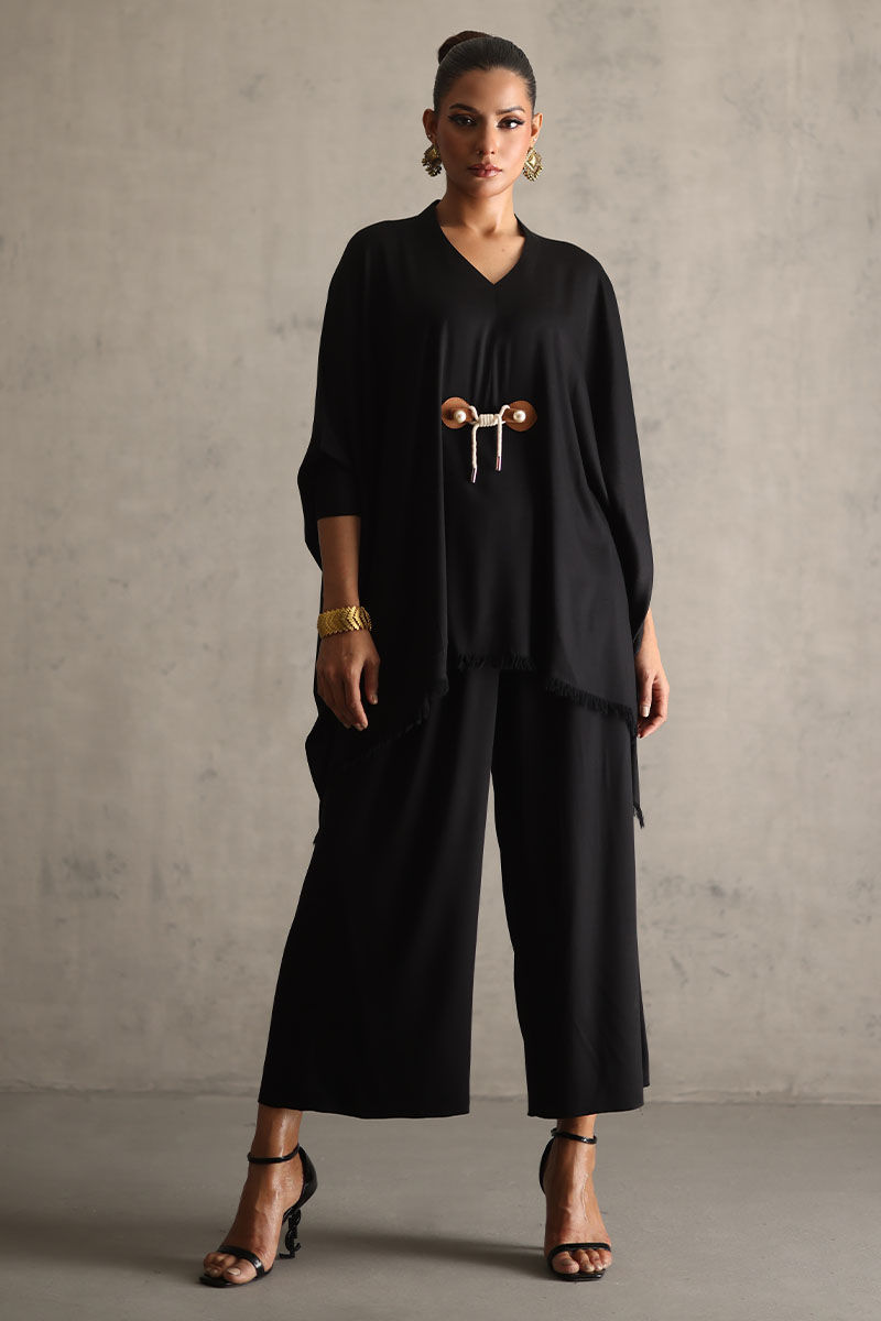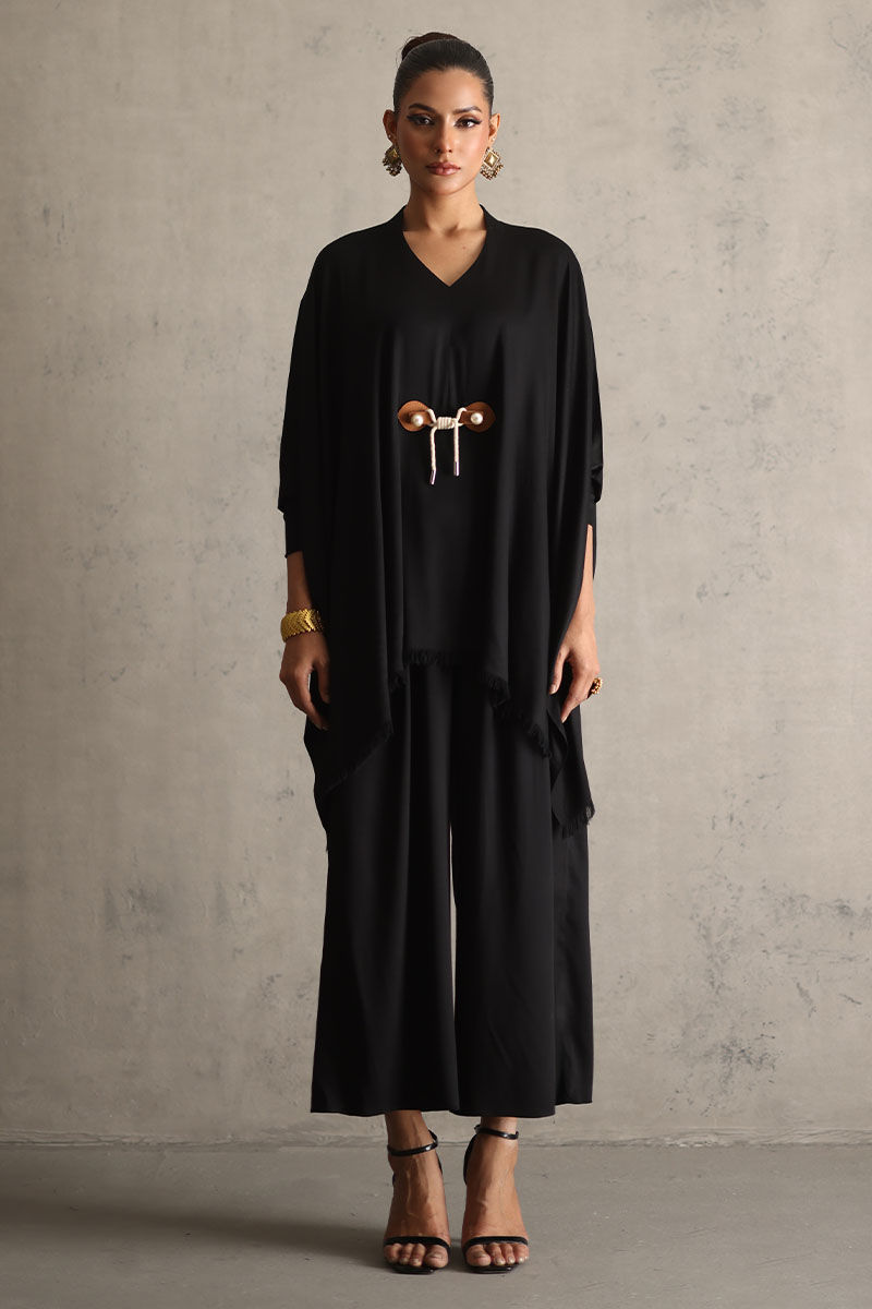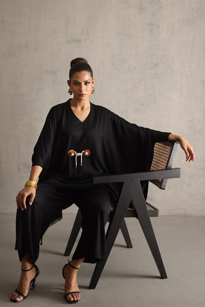 Dress in effortless elegance with our black rayon cotton Silk ensemble. The shirt, made from luxurious rayon cotton silk, offers comfort with a touch of style, complemented by the vibrant black shade. Paired with matching 3-quarter cullottes, this ensemble strikes the perfect balance between chic and relaxed. The defining feature, a leather and pearl belt buckle, adds a touch of sophistication, making it an ideal choice for occasions where style meets comfort. The model's Shirt length is 29 to 31.
