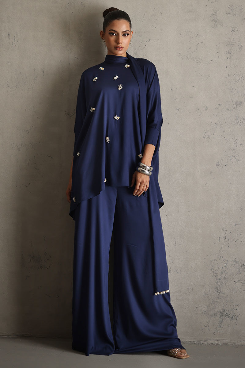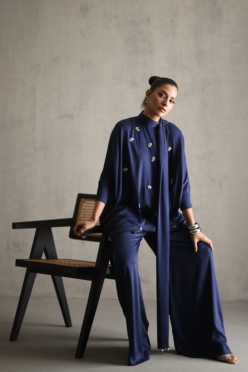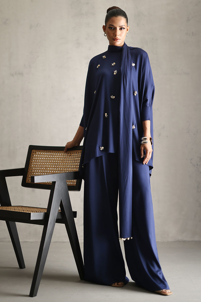 Drape yourself in elegance with our navy blue rayon cotton silk ensemble. The shirt, in a flattering length, pairs effortlessly with loose bootlegs for a touch of modernity. Adorned with intricate detailing, including bootis, sequence, tiki stones, crystals, cutdana stones, and pearls, it's a symphony of sophistication. The ensemble is completed with an attached stole for an extra layer of grace. This navy blue ensemble is simplicity meets opulence, perfect for making a statement at any special occasion.