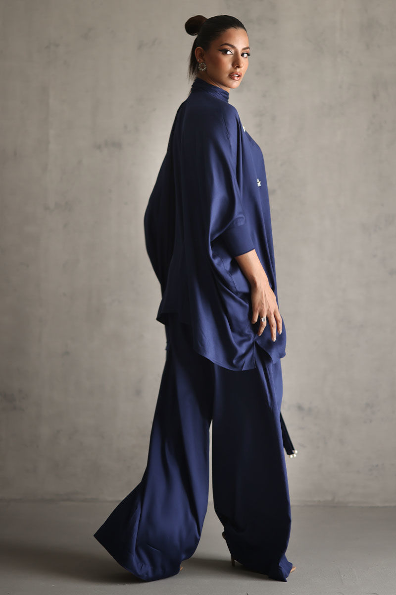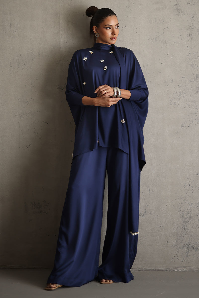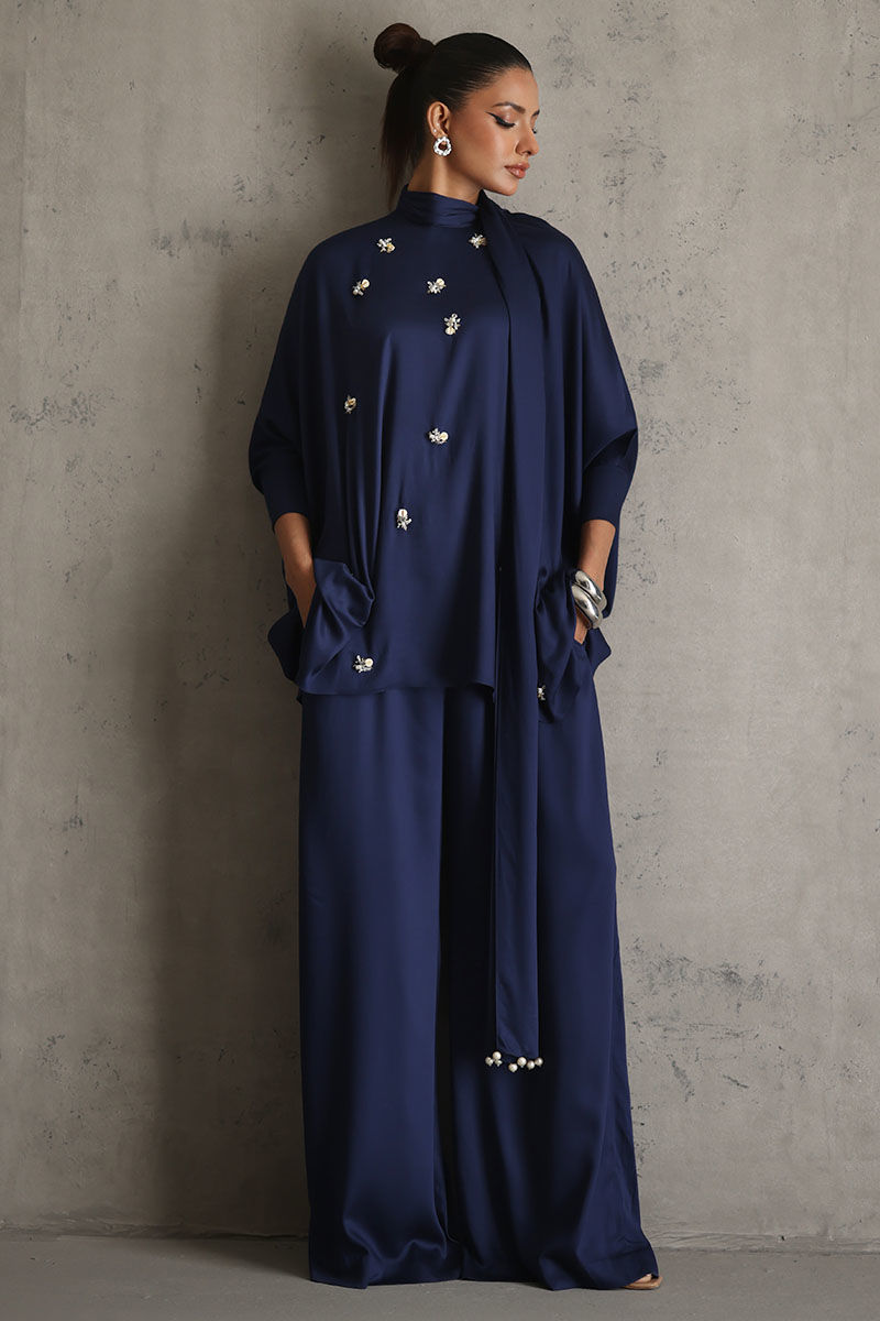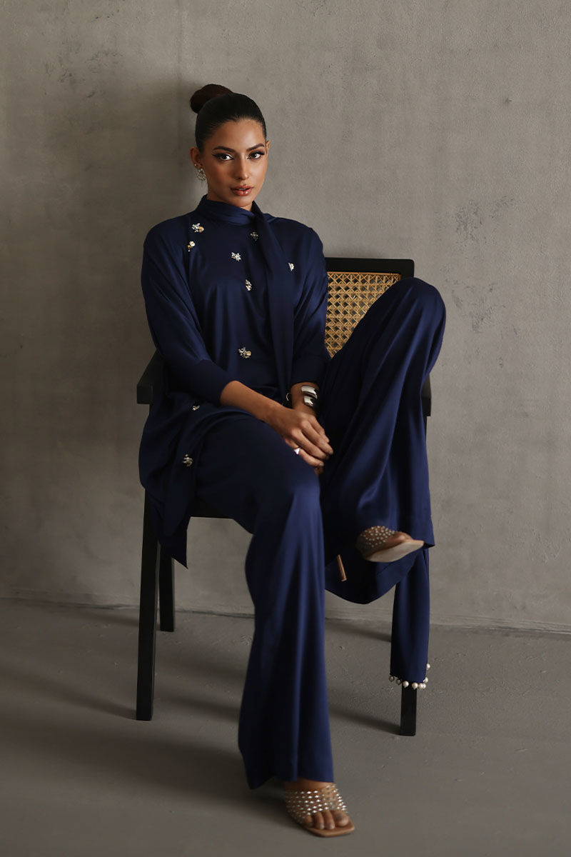 Drape yourself in elegance with our navy blue rayon cotton silk ensemble. The shirt, in a flattering length, pairs effortlessly with loose bootlegs for a touch of modernity. Adorned with intricate detailing, including bootis, sequence, tiki stones, crystals, cutdana stones, and pearls, it's a symphony of sophistication. The ensemble is completed with an attached stole for an extra layer of grace. This navy blue ensemble is simplicity meets opulence, perfect for making a statement at any special occasion.