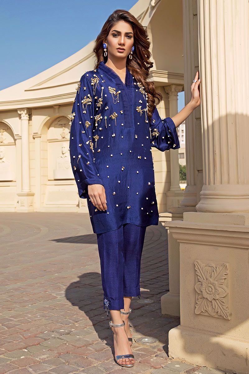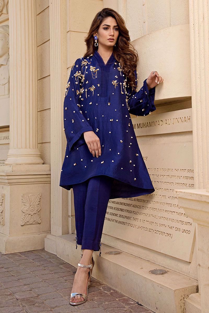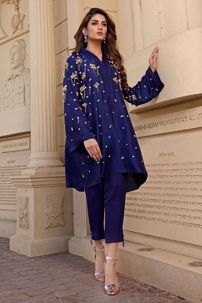 Iridescent and luminous navy blue Top in pure raw silk beautifully crafted with metallic embellishments, pearls, stones, cut dana, beads and metallic chains finished with organza detailing's on the neckline. Navy blue Pants can be bought separately to complete the look.