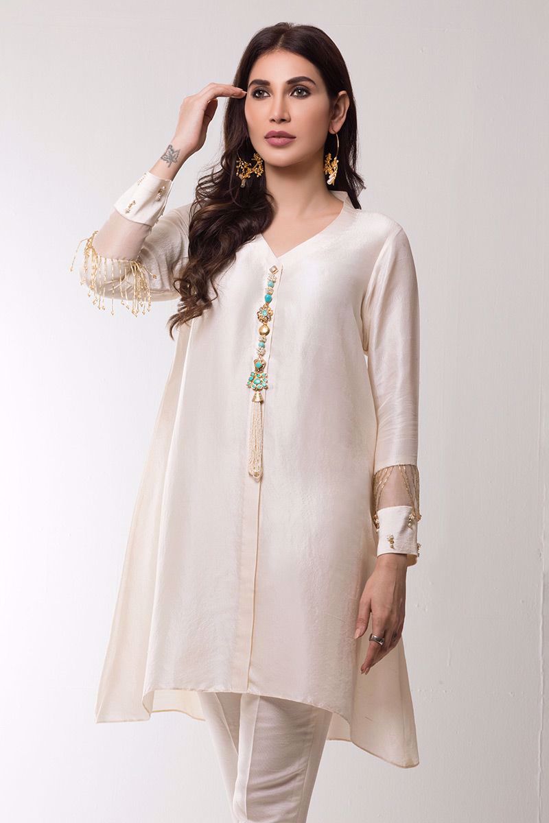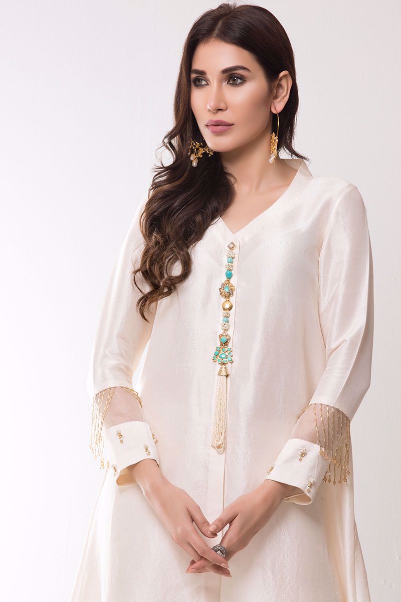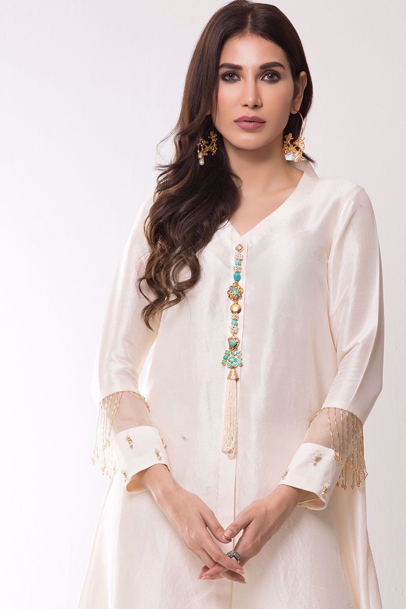 Ivory pure raw silk Kurta beautifully embellished with Indian jeweled motifs on front and trendy handwork on sleeves.