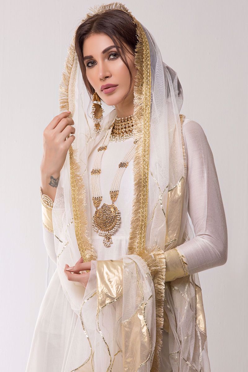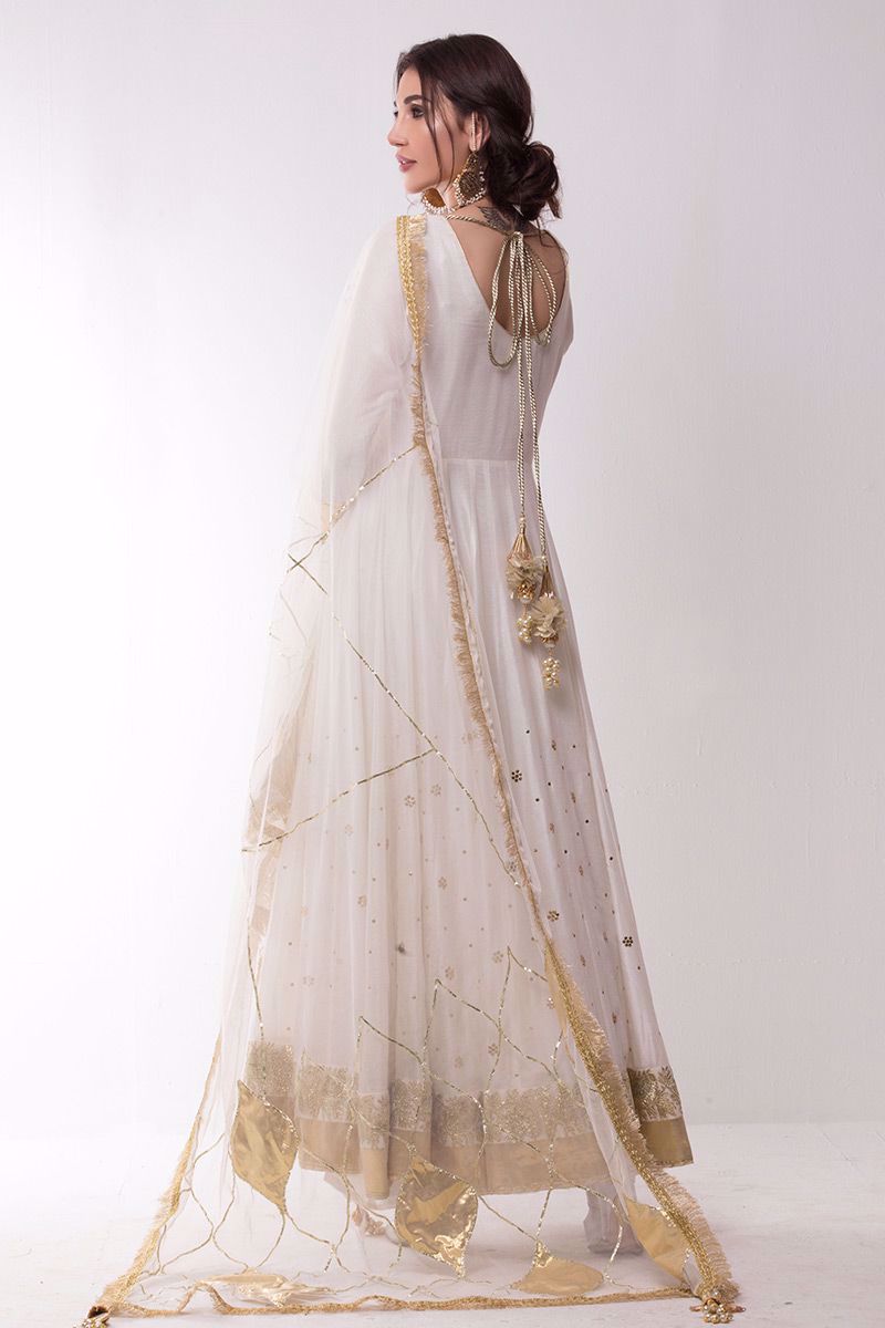 An Ivory colored khadi net Pishwas embellished with gold kamdani and gota border along with beautiful net Dupatta of gota work with hangings, tassels and Churidar Pajama is the perfect pick for your festive occasion.