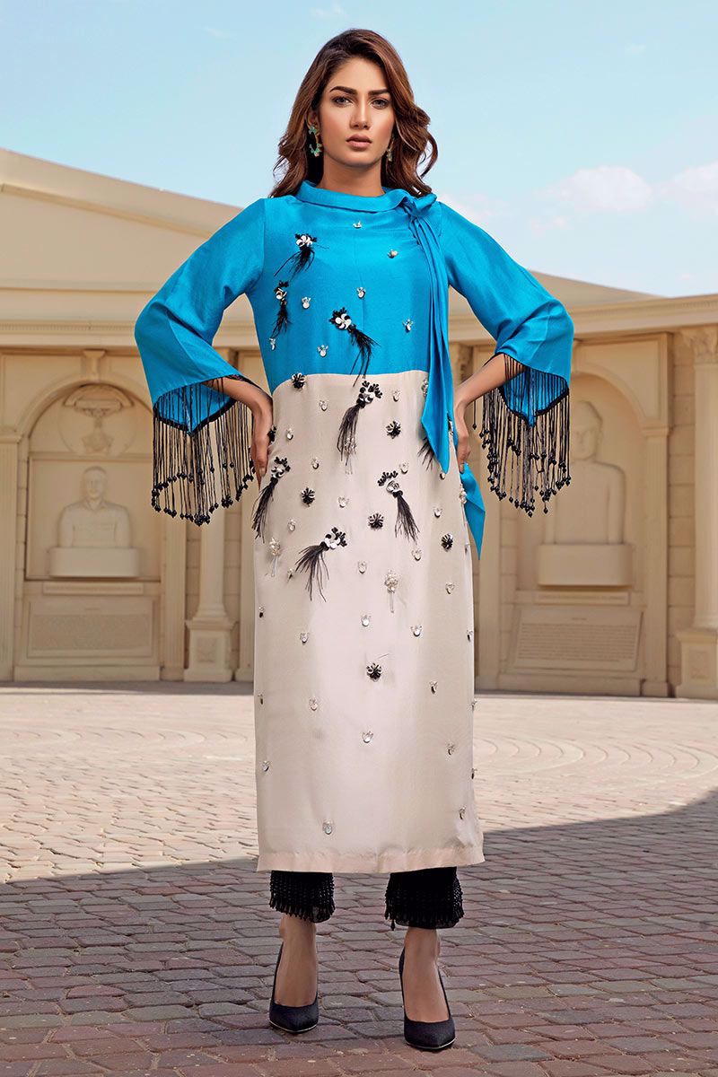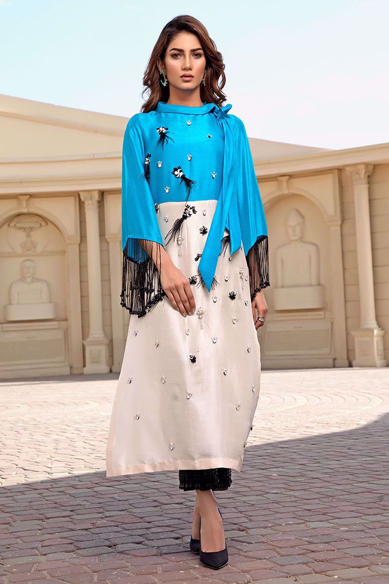 The irresistible color blocking of turquoise blue and ivory on pure raw silk styled with tie neck, embellished with feathers, stones, pearls, beads and 3D flowers along with long cut dana hangings on sleeves. Black stretchable Pants finished with black organza and pearl hangings can be bought separately to complete the look.