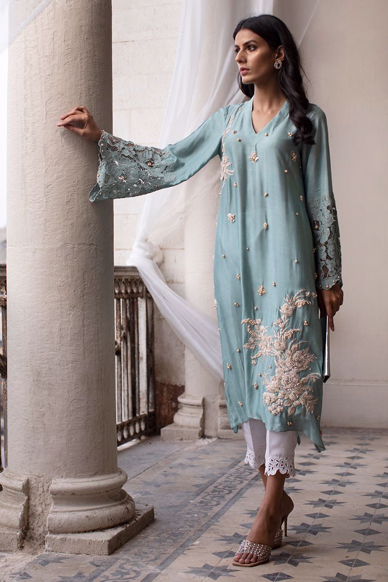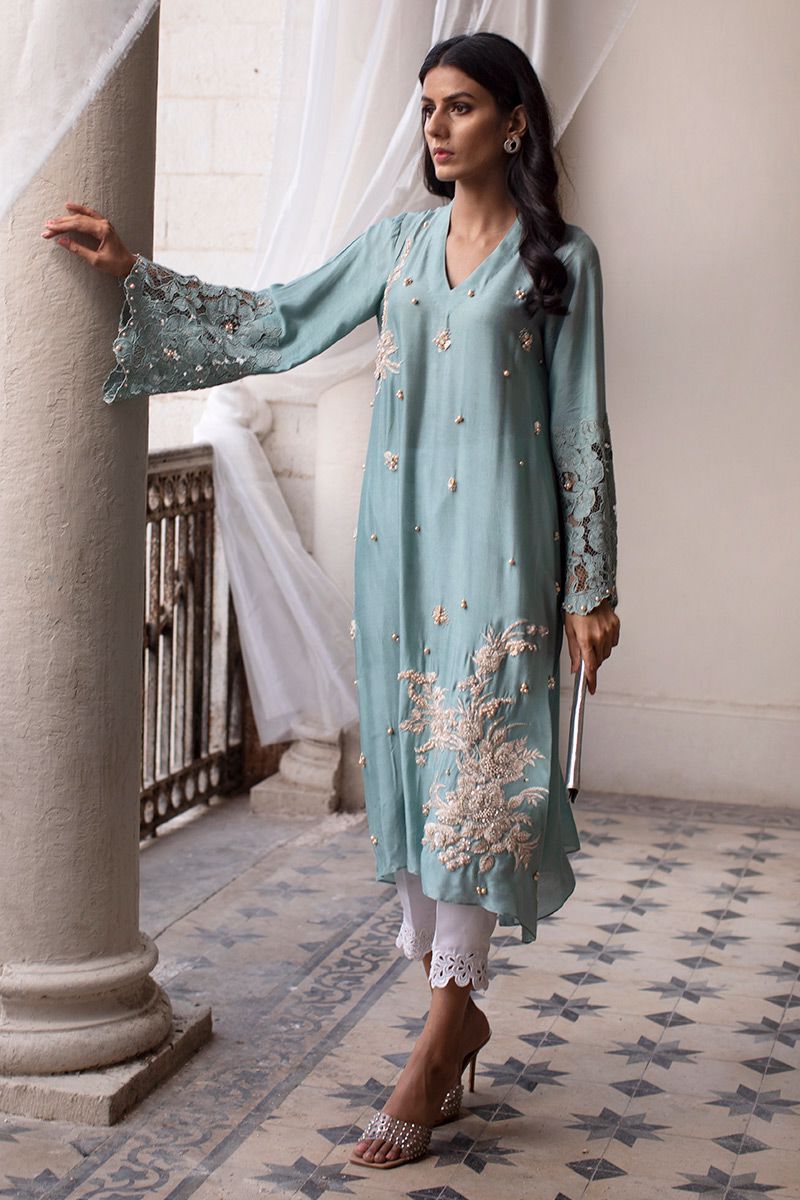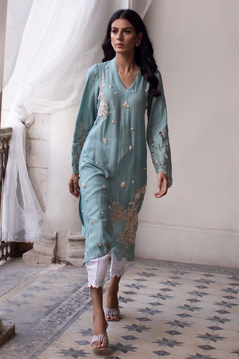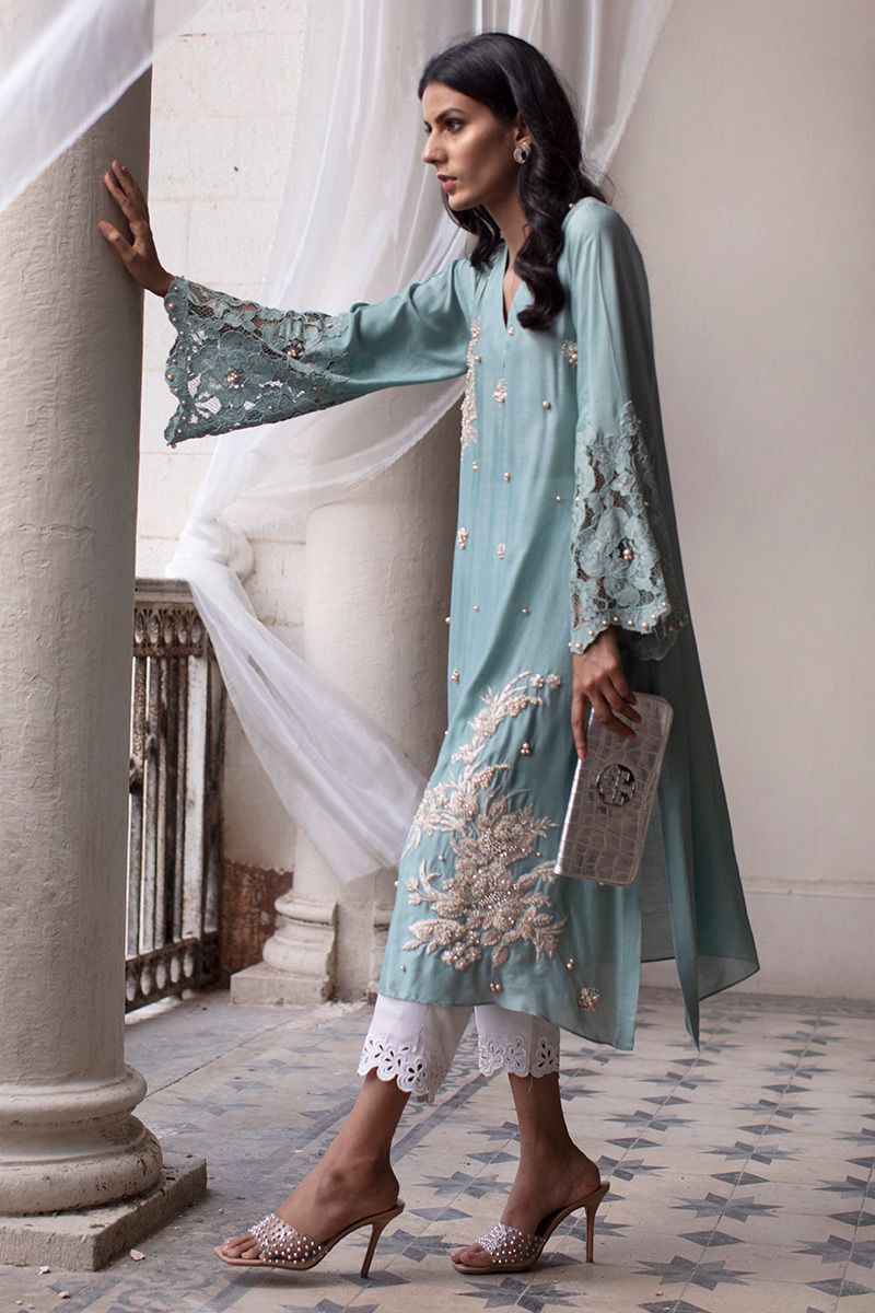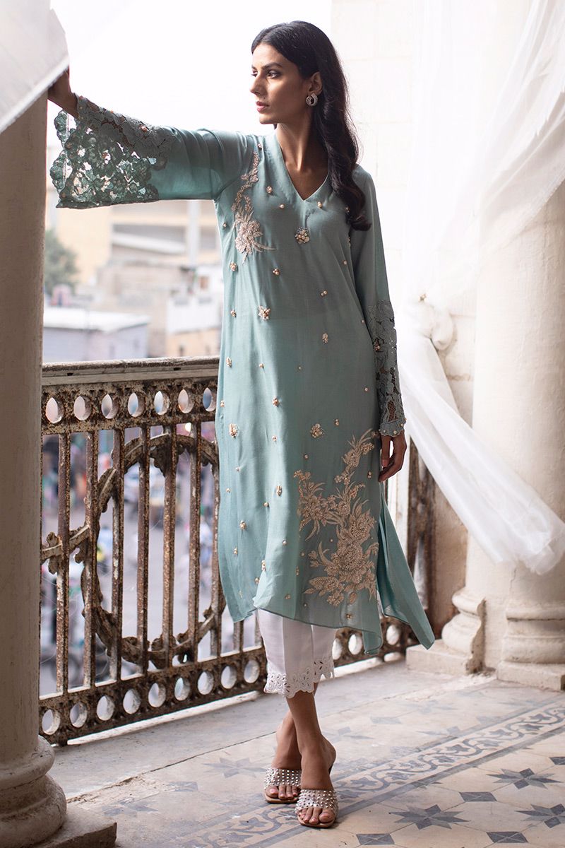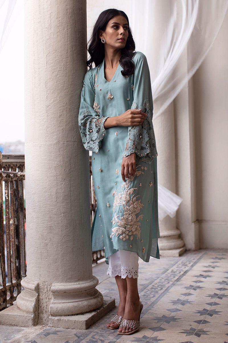 A classic Pure Raw Silk weave in color blue haze features an A-line silhouette with floral motifs comprising pearl, cutdana, and beads scattered on the front. The chantley fabric manipulation draws a statement. Ivory semi pure cutwork pants are paired and can be purchased separately.
