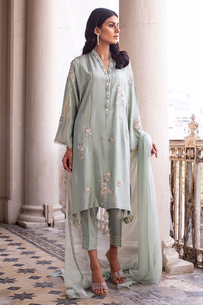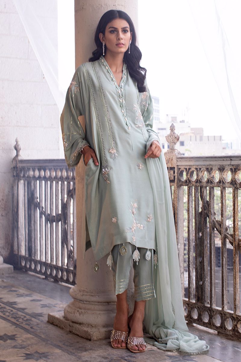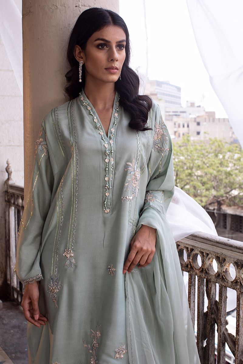Dessert sage Pure Raw Silk shirt features great blend of floral and symmetrical embroidery alignments made up with pearl, resham, sequins and gota. The hem of the shirt features custom made hanging. Same color semi pure pant and chiffon dupatta with edging is paired to be purchased at additional cost.
