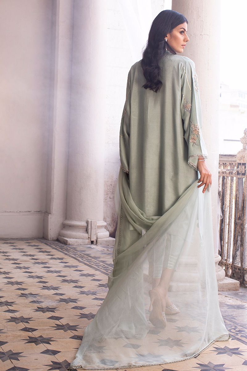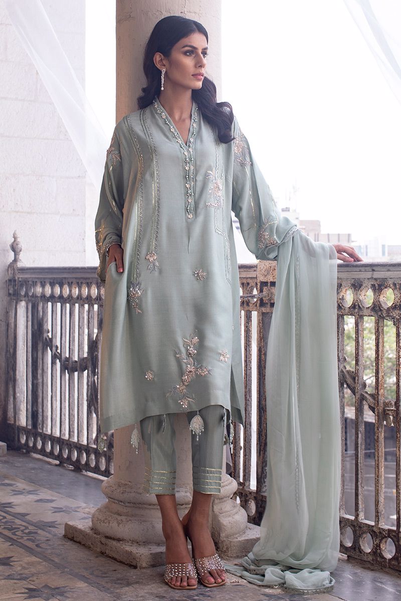 Color: Smoke Green Fabric: Pure Raw Silk Work Details: Embroidered