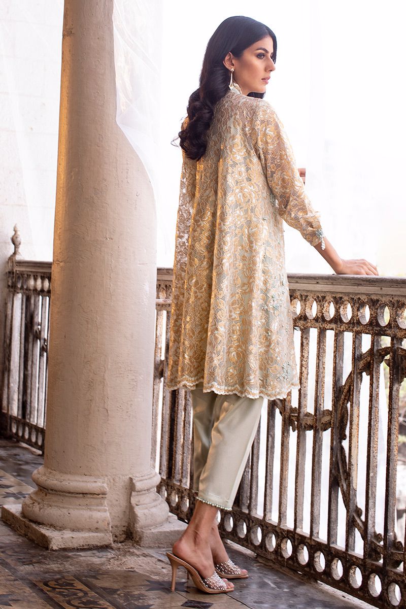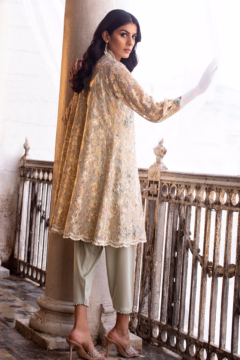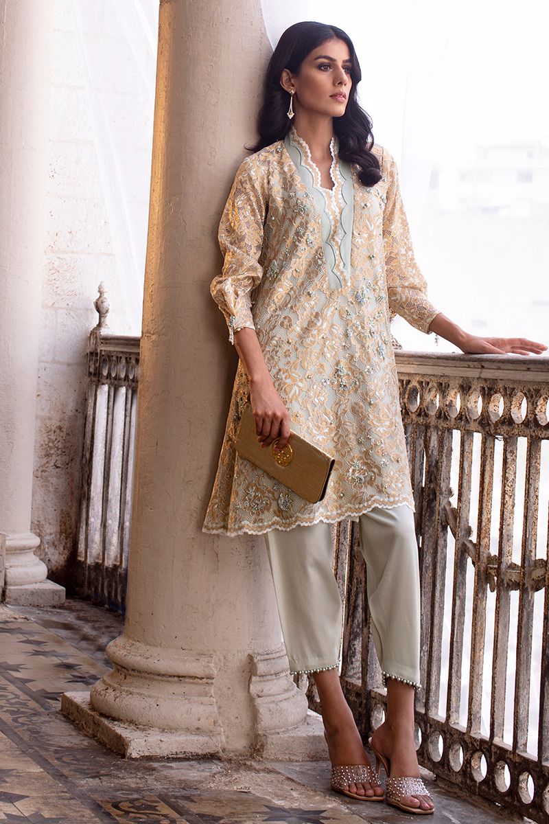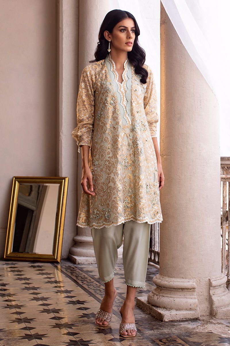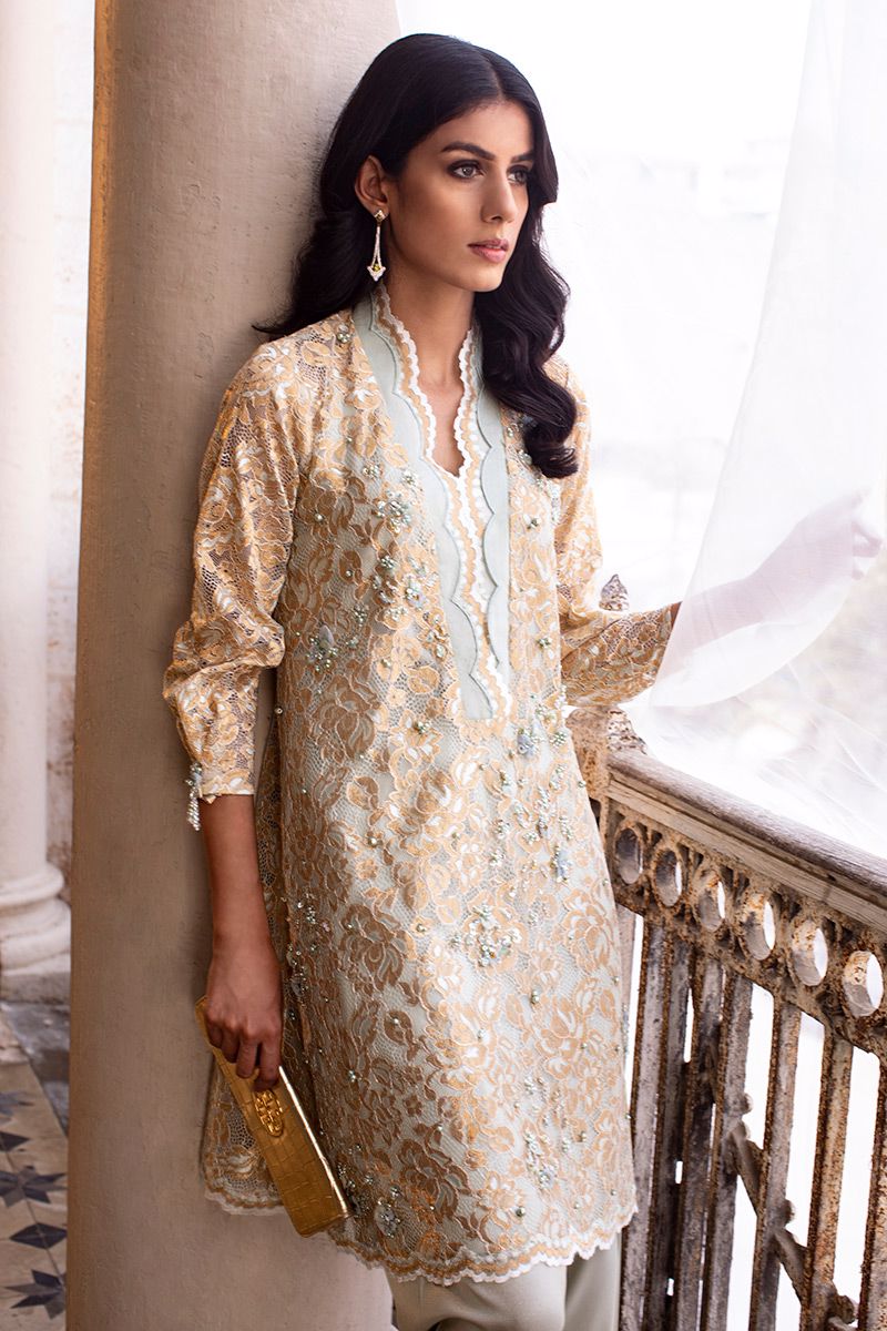 A mint green chantly short A-line shirt is bedecked with chunky embellishment of pearl, fabric petals, diamantes and cut dana. The scalloped neckline and sleeves prove to be the highlight of the shirt. Completing the look with shimmer skinny shawlar is paired, can be purchased at additional cost.