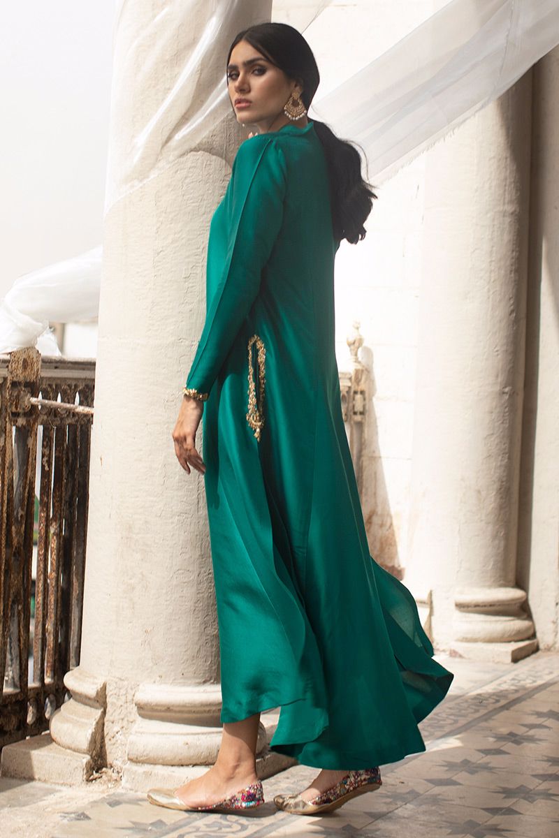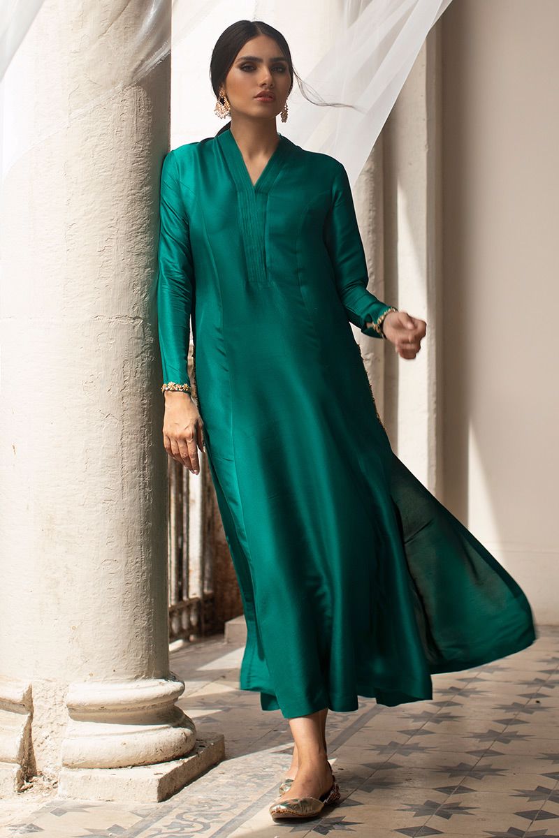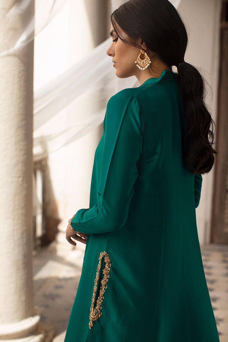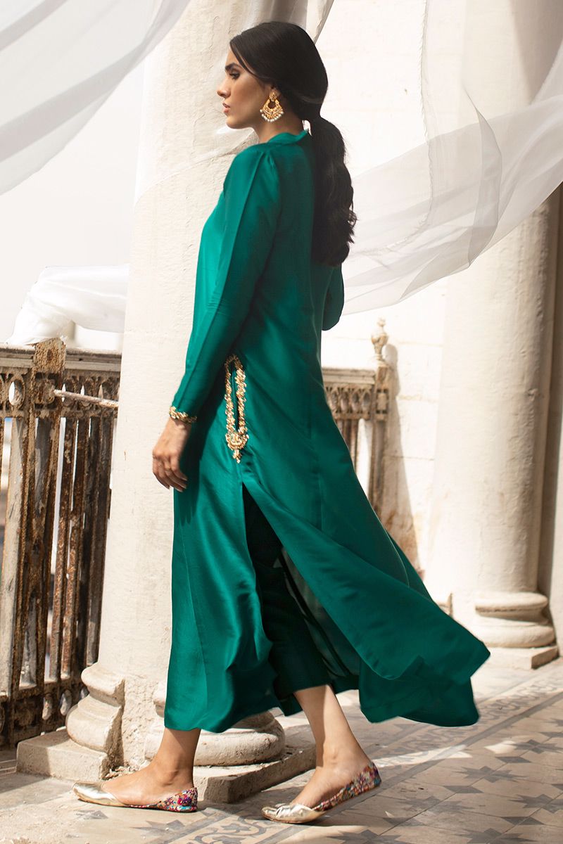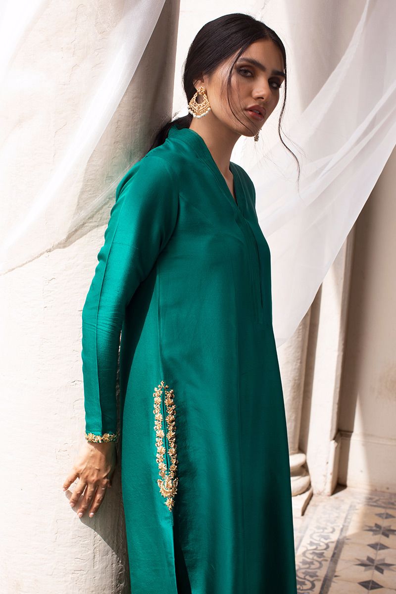 Timeless color emerald green is seen in this prince panel pure raw silk shirt. The elegant silhouette is uplifted with zardozi work on pocket and sleeves. Worn with pure raw silk same color pants, to be purchased at additional cost. Note: dupatta can be made on request