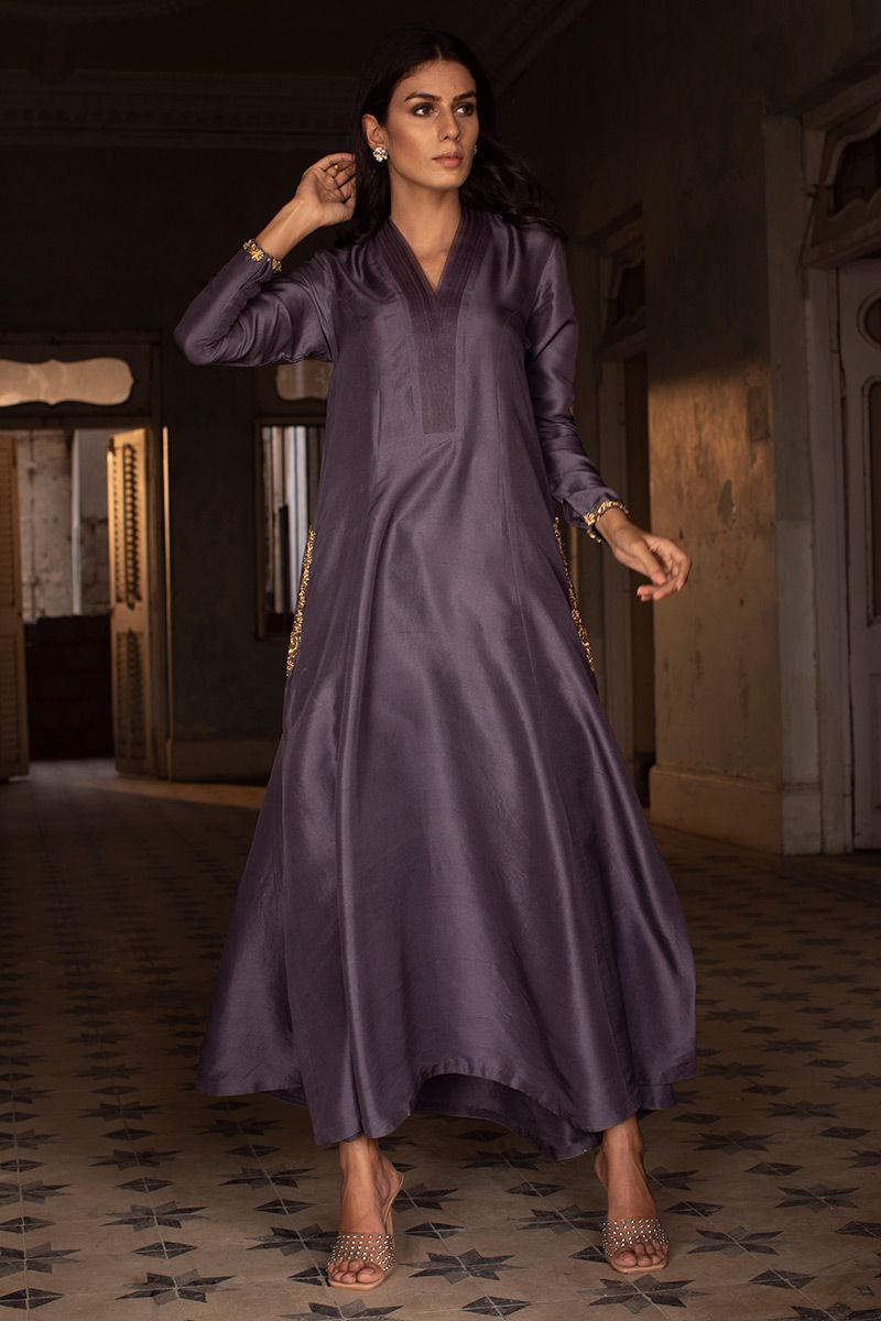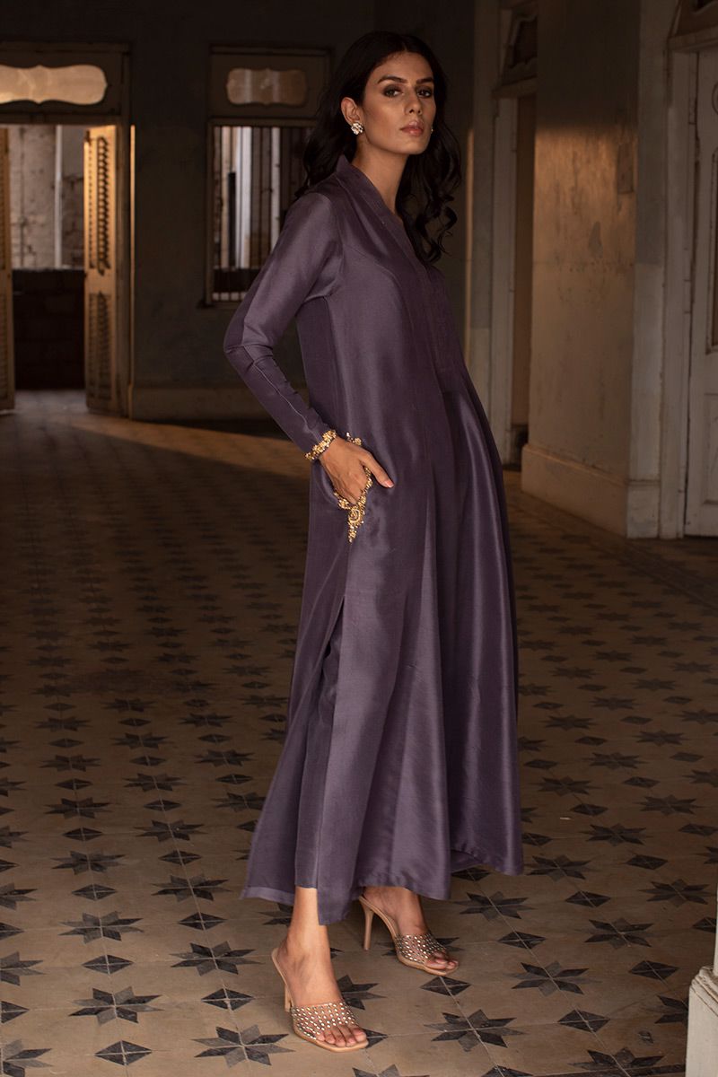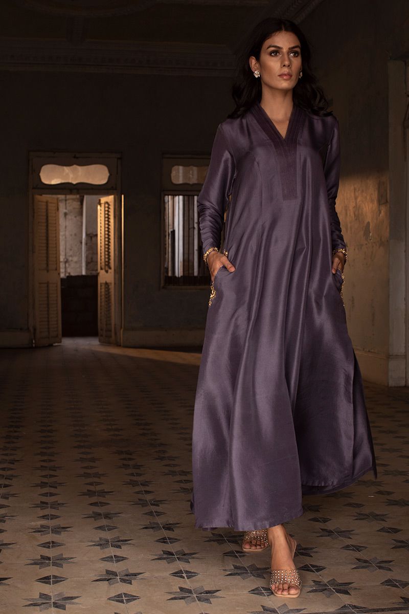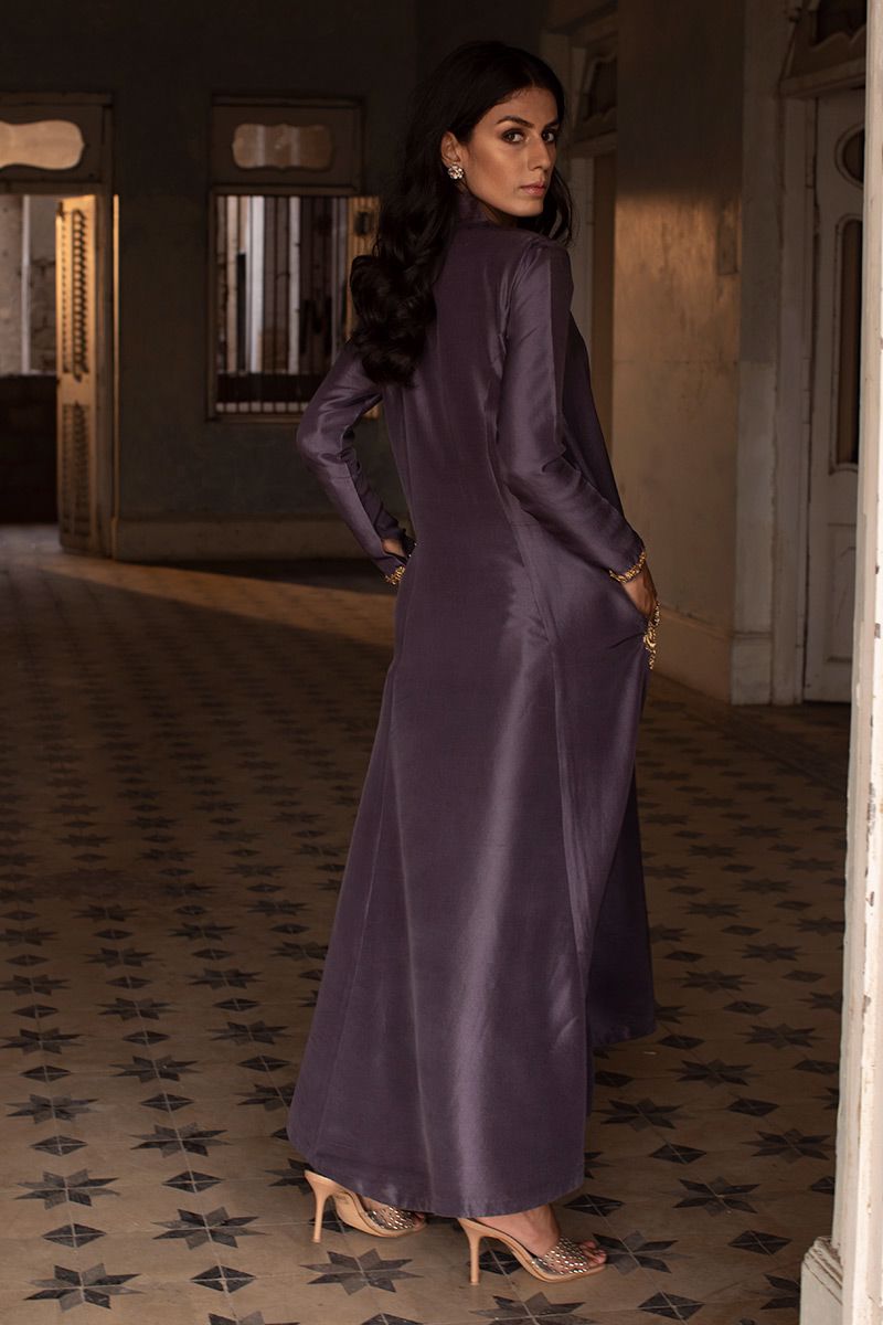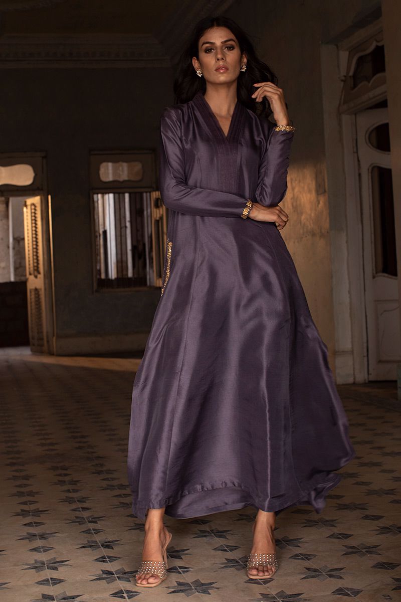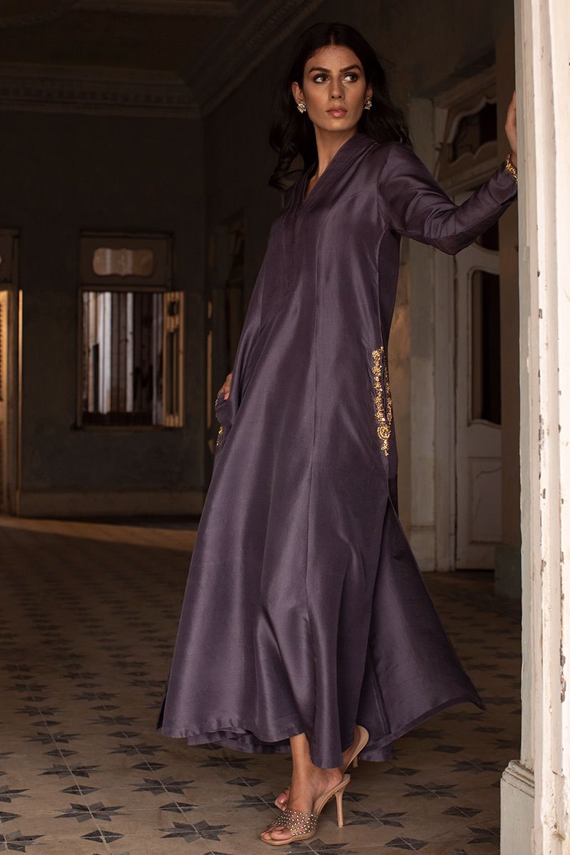 Timeless color purple sage is seen in this prince panel pure raw silk shirt. The elegant silhouette is uplifted with zardozi work on pocket and sleeves. Worn with pure raw silk same color pants, to be purchased at additional cost. Note: dupatta can be made on request