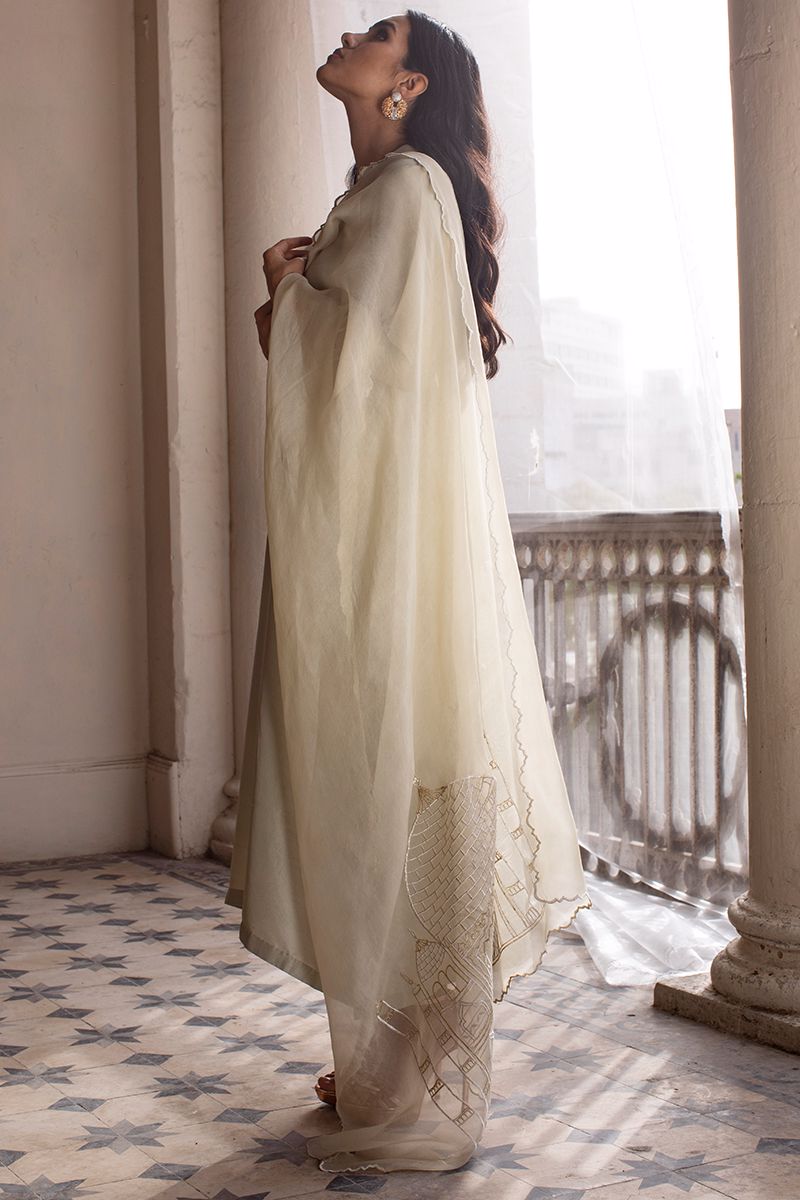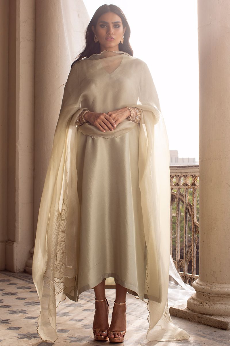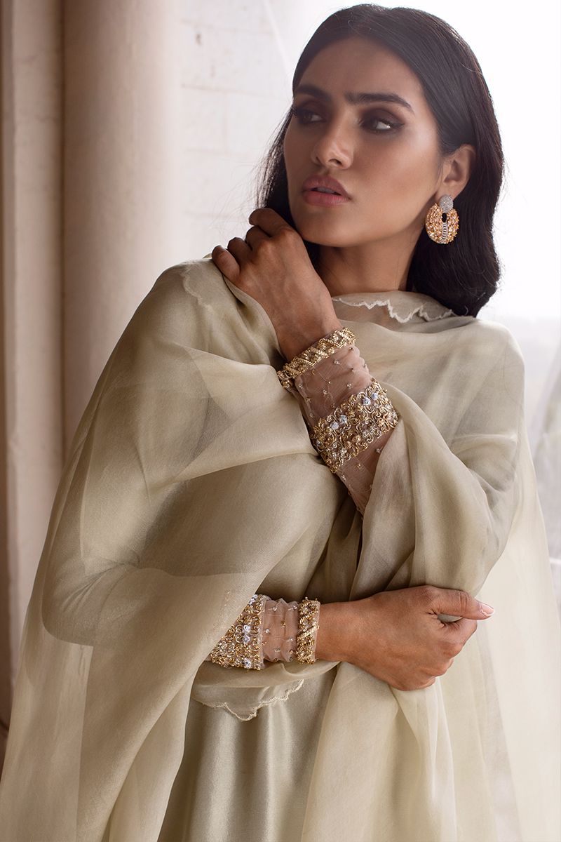 Portrayal of elegance seen in the green haze pure raw silk shirt. Antique zardozi work is well positioned with nakshi, kora, dabka and sequin detailing on the sleeves. Same color pure raw silk pants and pure organza dupatta having zari embroided taj mahal is paired, to be purchased separately