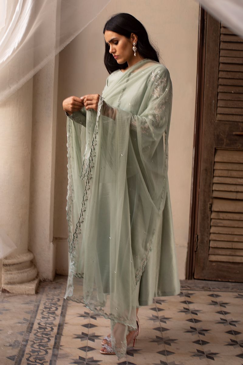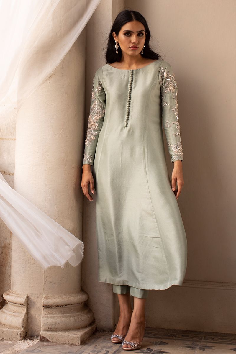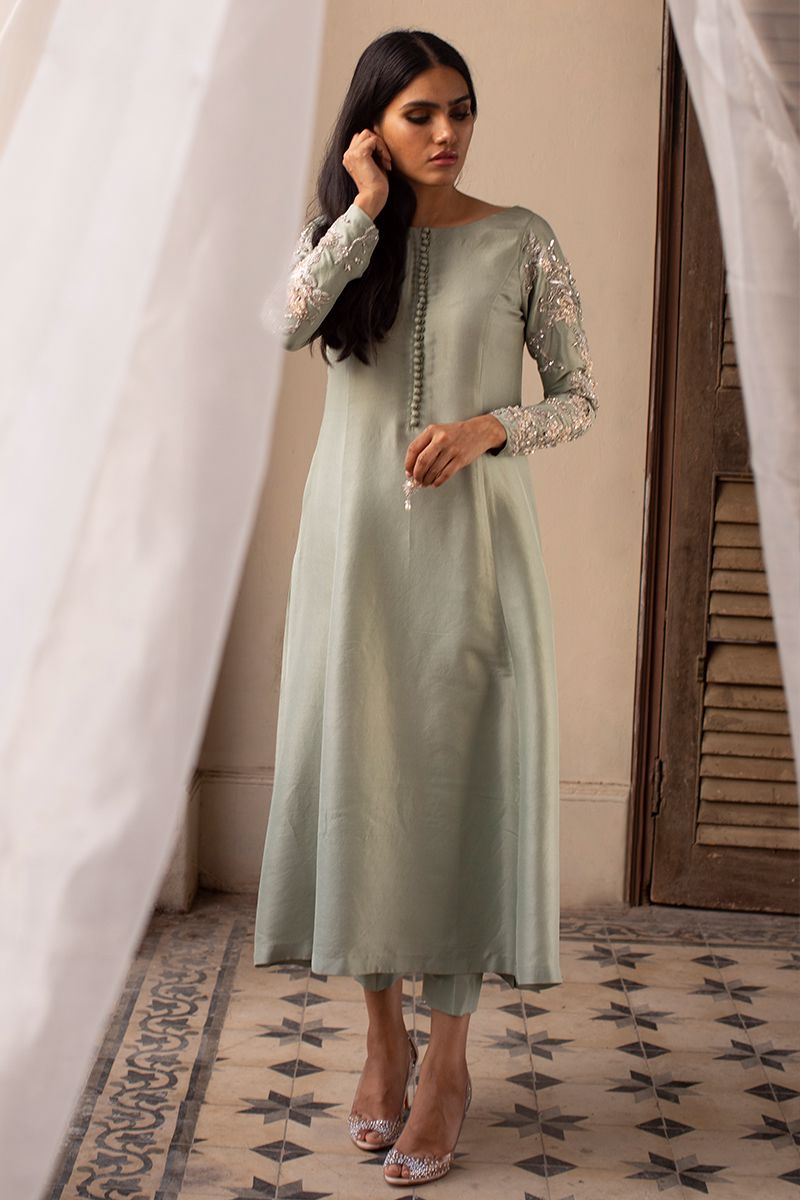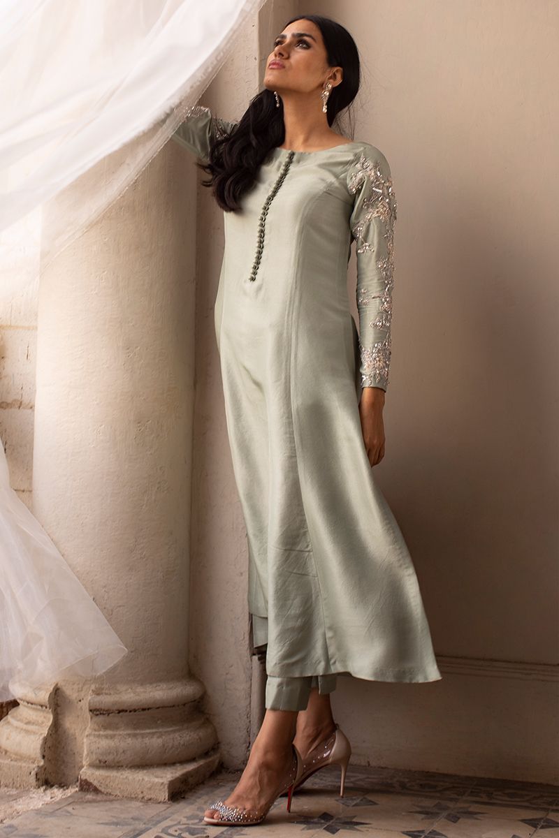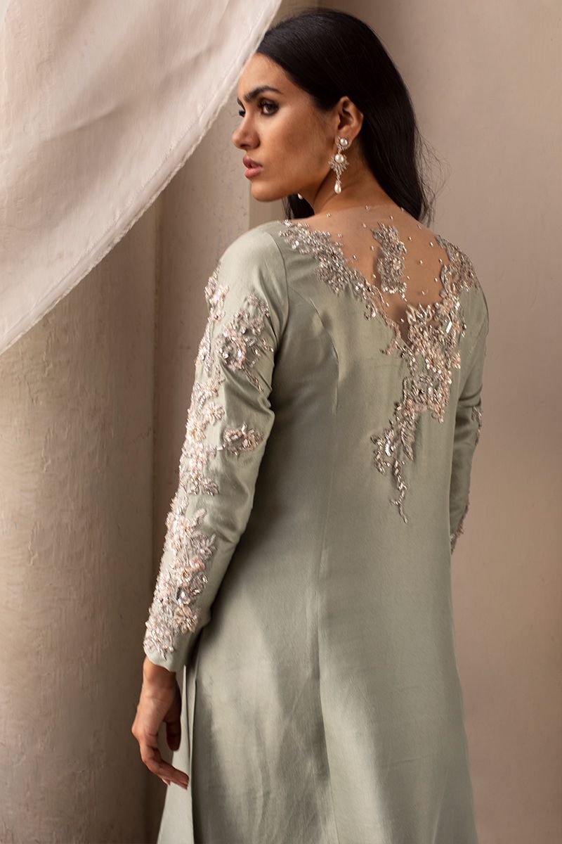 A pure raw silk statement in color dessert sage features prince panel silhouette. The unadorned shirt compliments best with beautifully embellished sleeves and back, comprising of pearls, cutdana, resham, diamantes and sequins. Same color semi pure shimmer pants and fancy embellished net is paired and can be purchased separately.