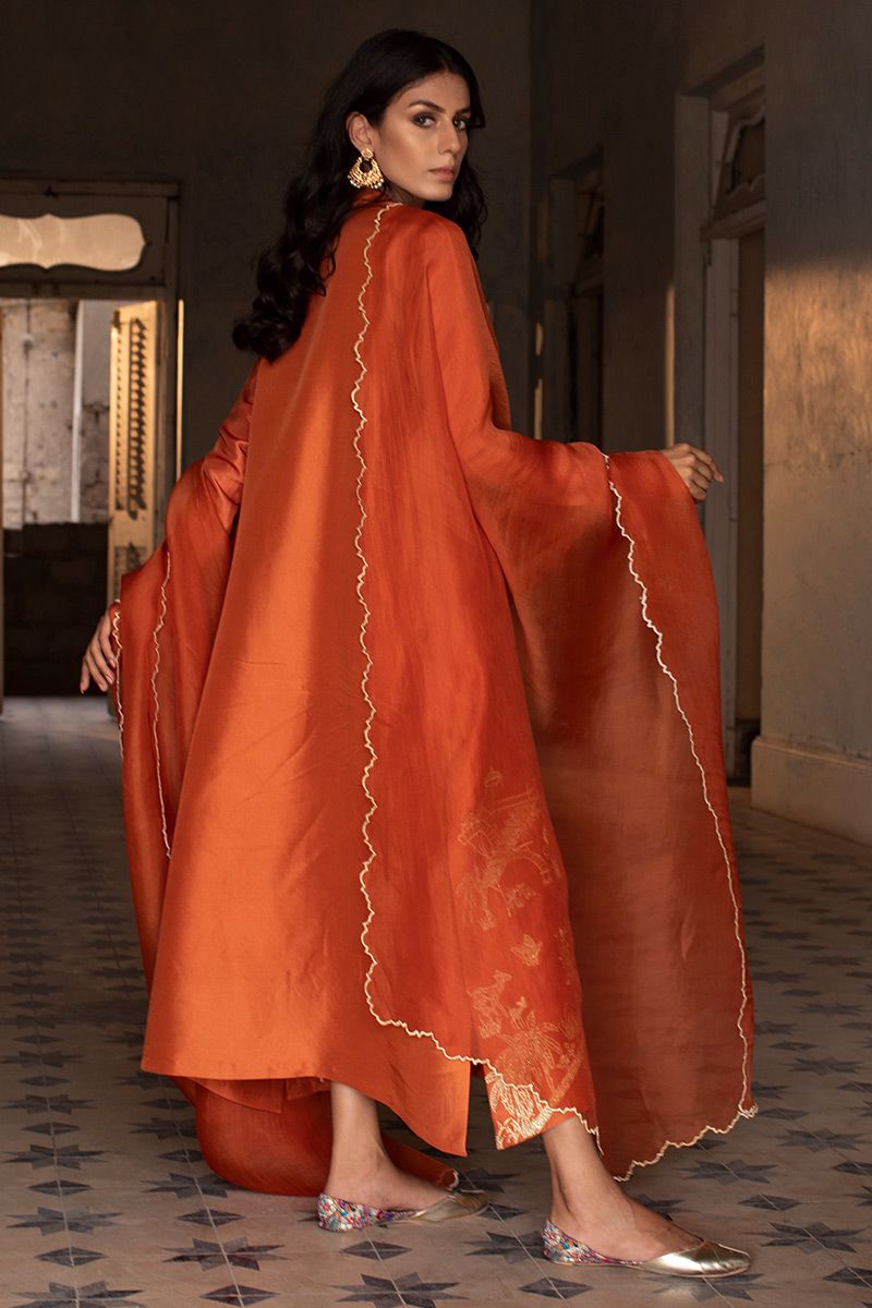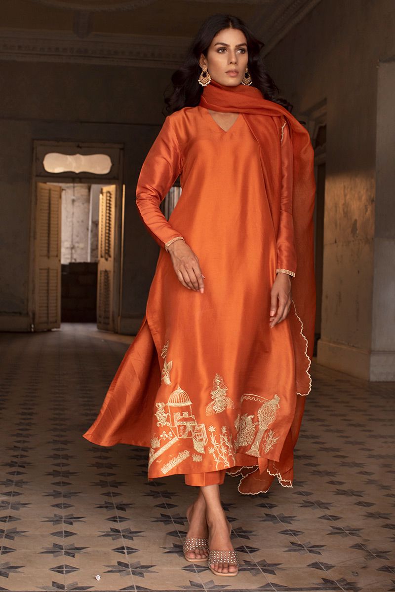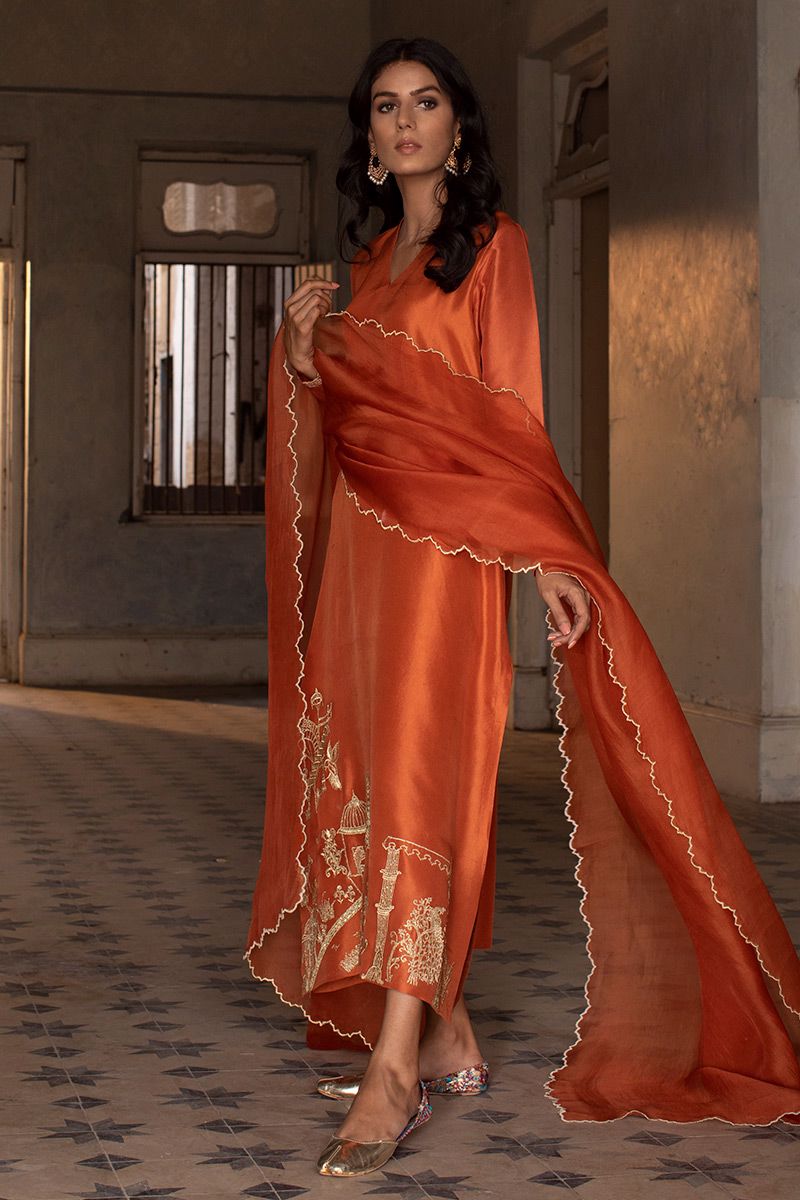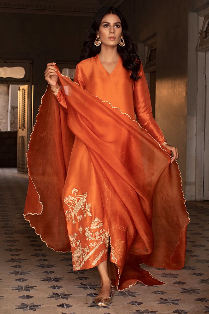 Color: Burnt Orange Fabric: Raw Silk Work Details: Embroidered