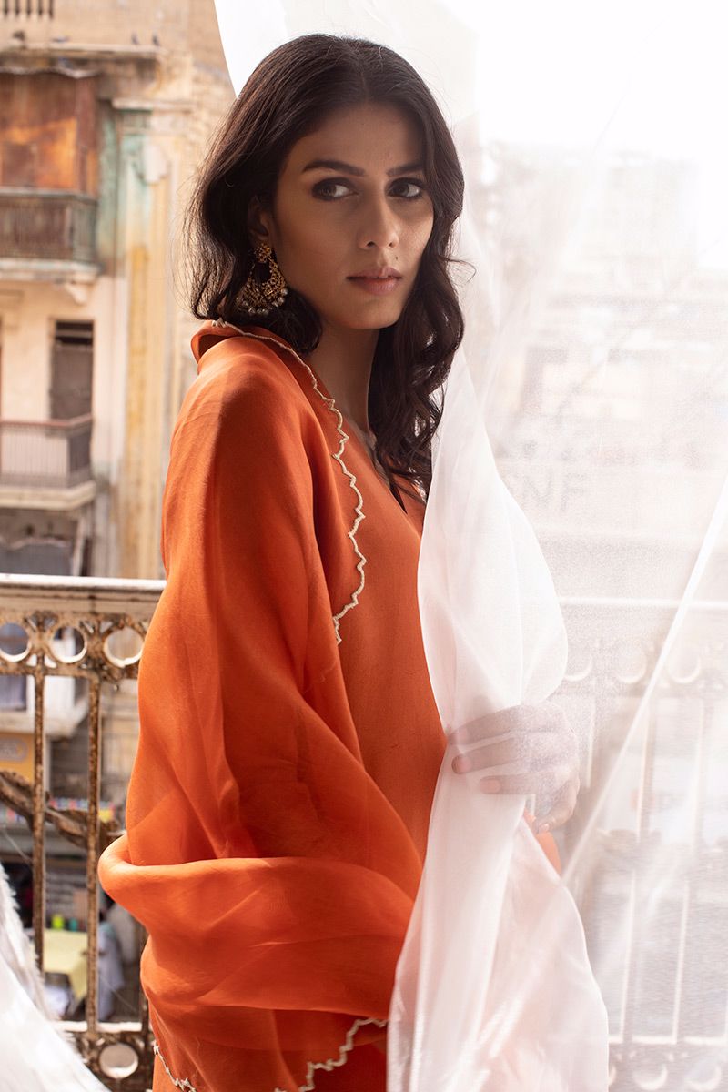From the gardens of Mughal palace, the needlework of zari catered towards the hemline of the shirt uplifts up the simple silhouette. To complete the look same color pure raw silk pants is paired along with same color pure organza fancy dupatta, to be purchased at additional cost.