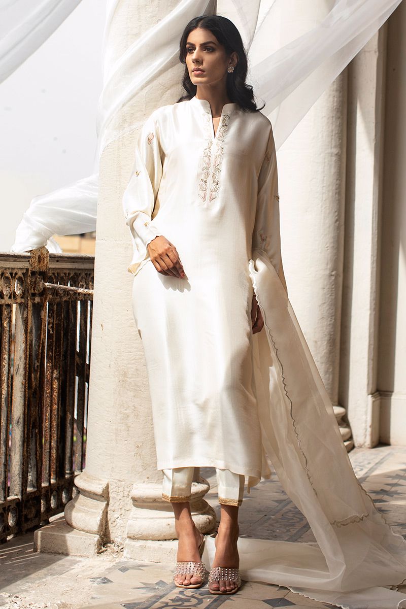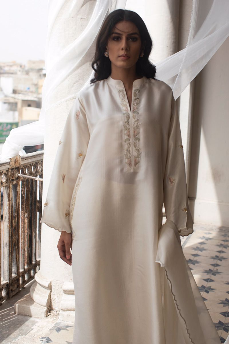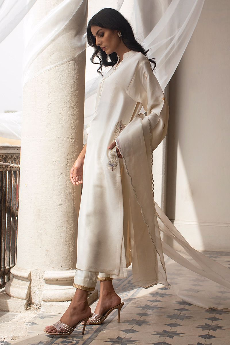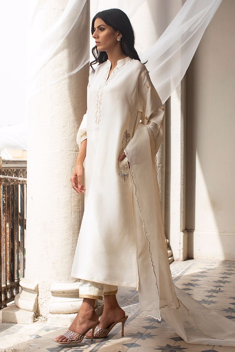 The effortlessly elegant pure raw silk ivory lengthy shirt comprises of resham and zari work highlighting the pocket and band collar along with the sleeves. Same color semi pure pants and organza dupatta with fancy edging is paired, to be purchased separately.