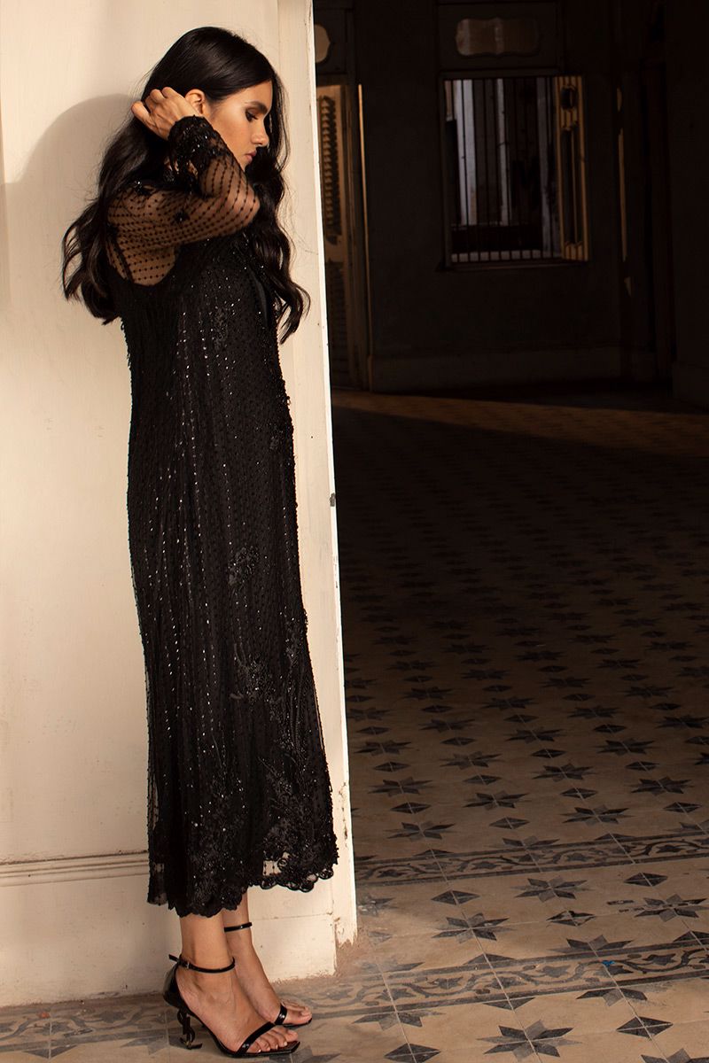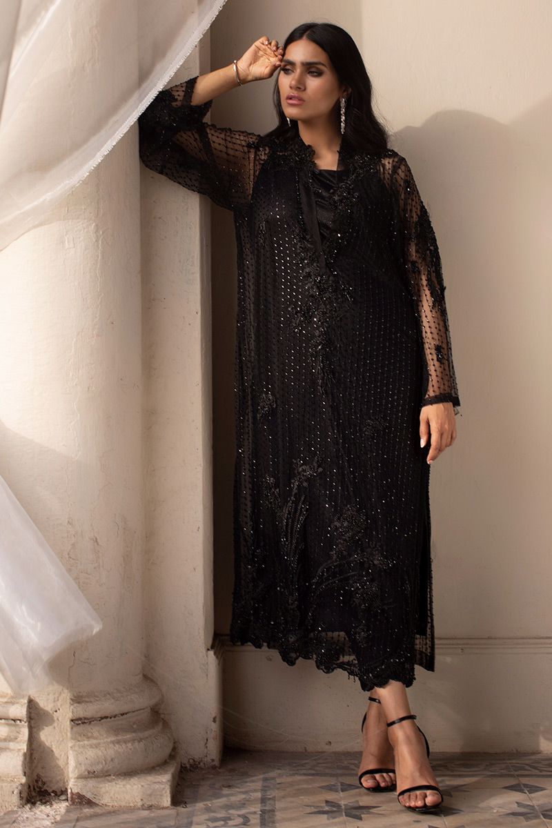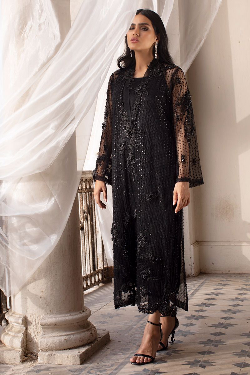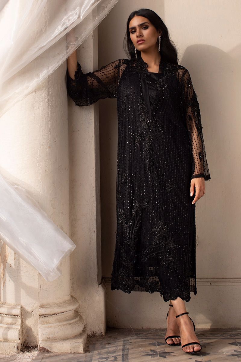 This glorifying, black net straight shirt consisting of dainty sequins. The detailed work scattered on front of the shirt represents stars shining on a dreamy night. To finish of the look same color semi pure straight pants to be purchased at additional cost.