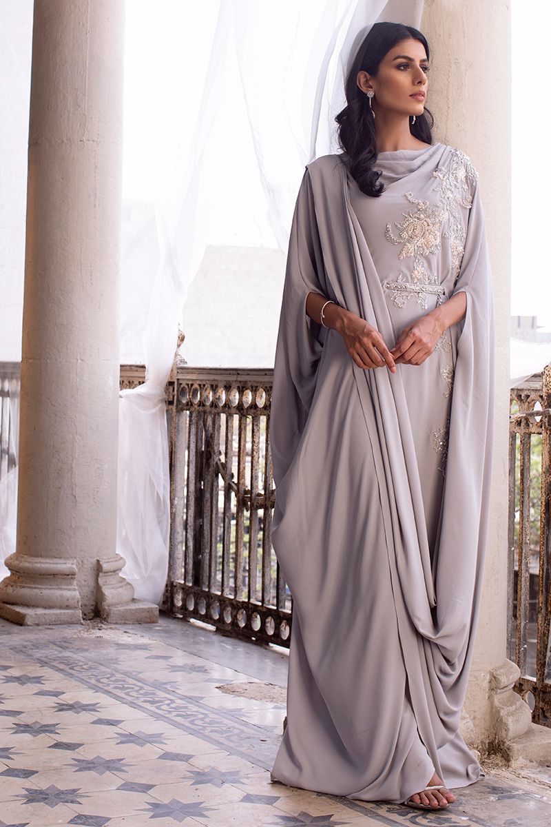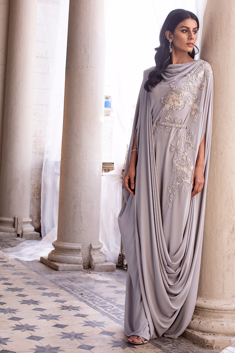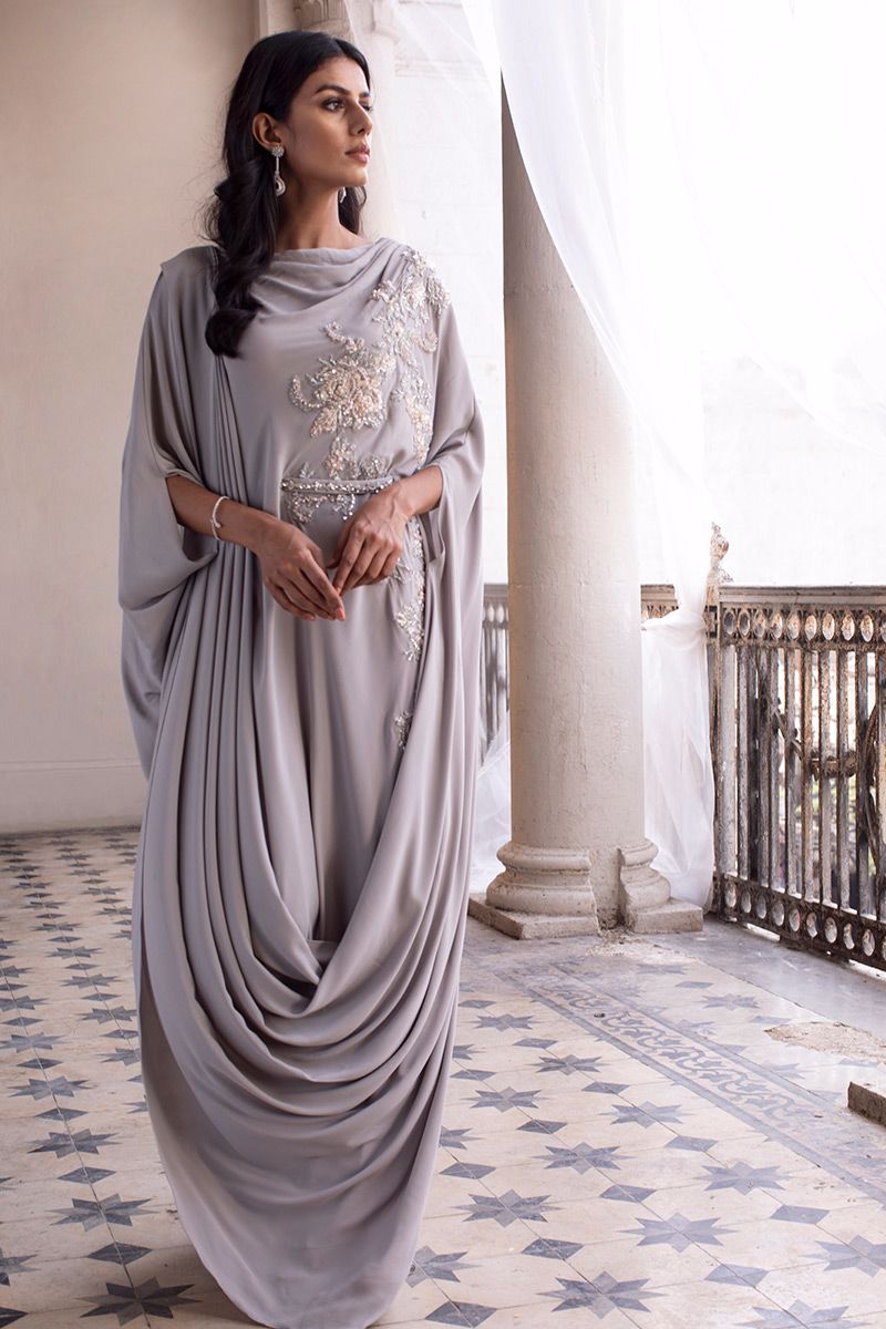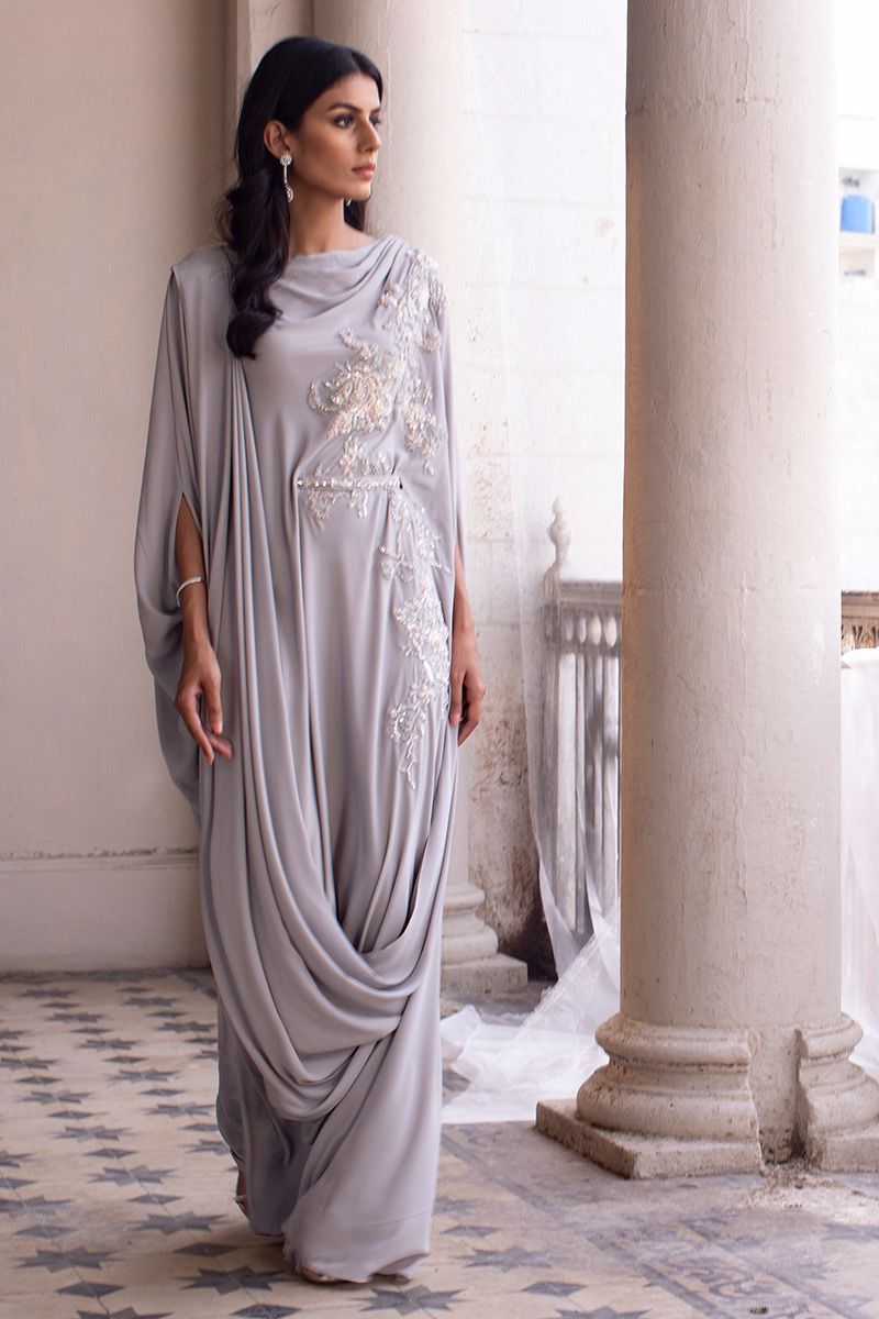 A pictographic resemblance of Greek goddess is seen in glacier grey georgette pleated kaftan. The cowls are draped towards the hem creating a soothing eye movement complimenting the embellishment comprising of resham, sequin and beads. The look of the outfit is enhanced with a handcrafted belt.
