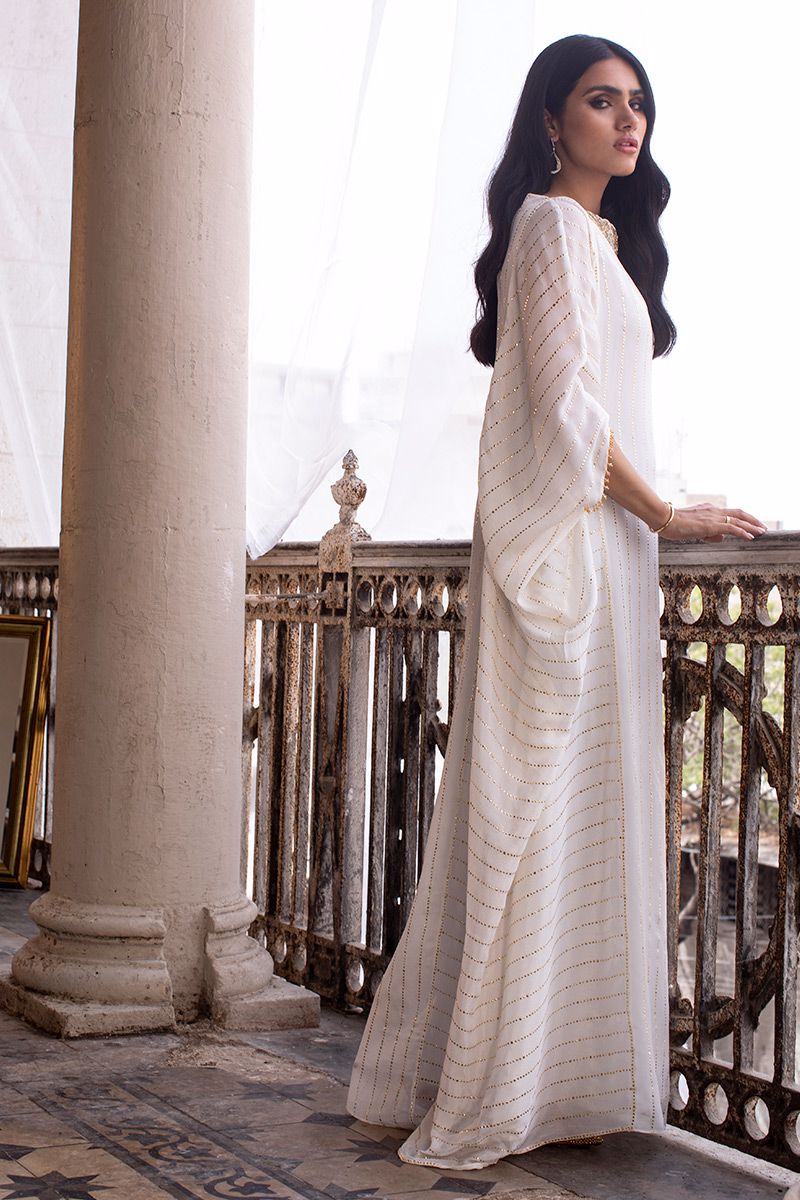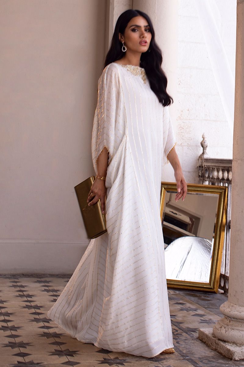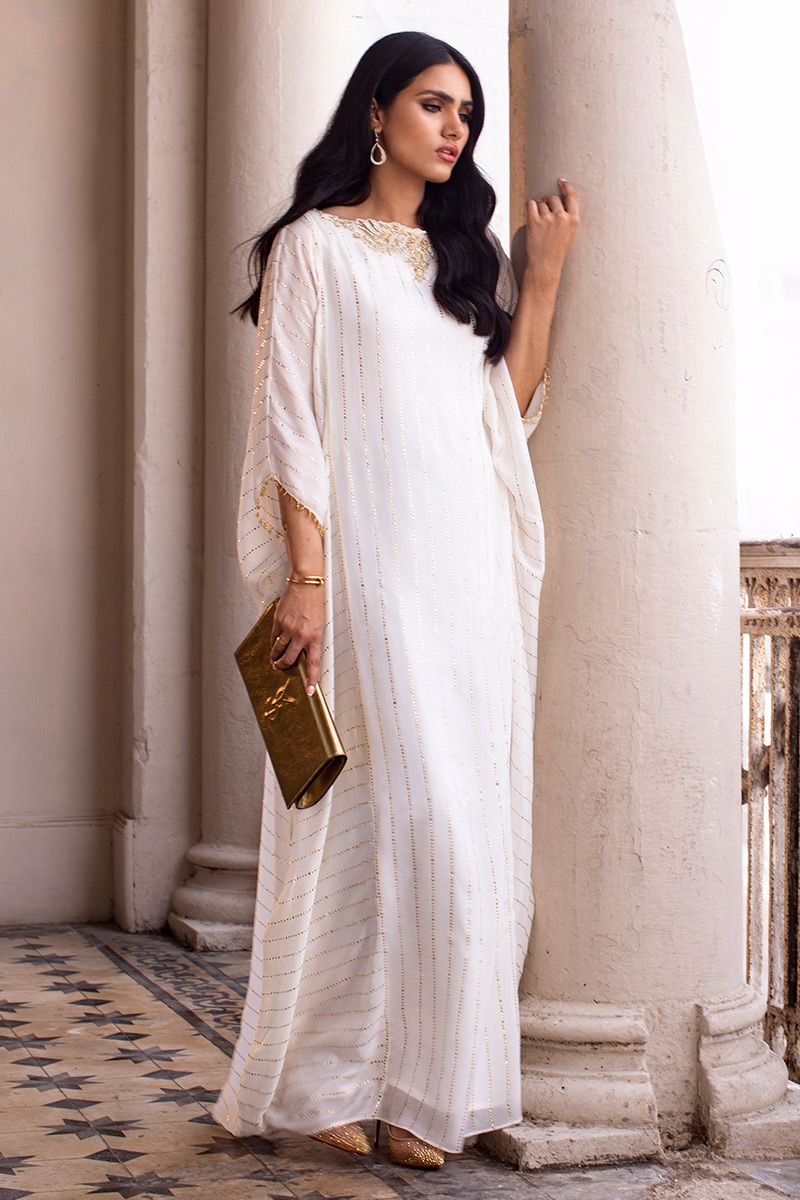 A perfect fusion of modern and traditional heritage. This ivory georgette kaftan with gold texture comprises of boat neckline crafted with gold embellishments of kora, dabka, pearls, sequins on front neckline.