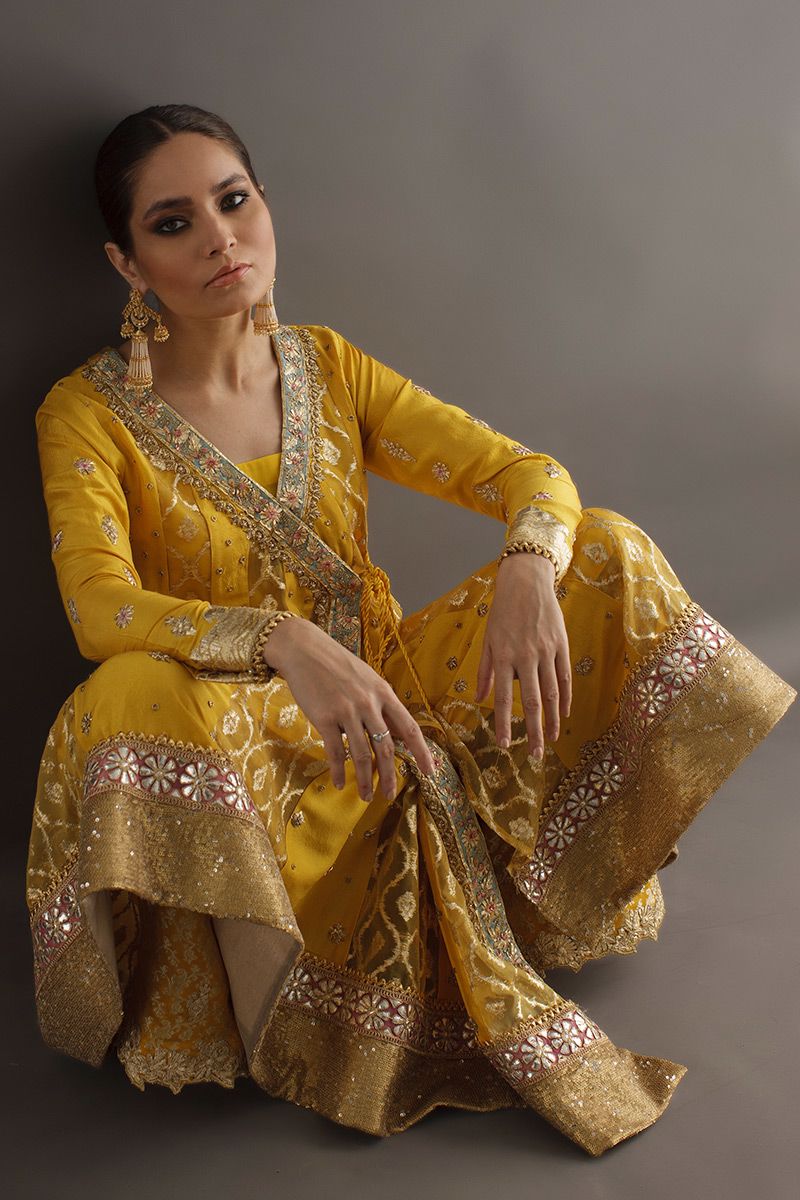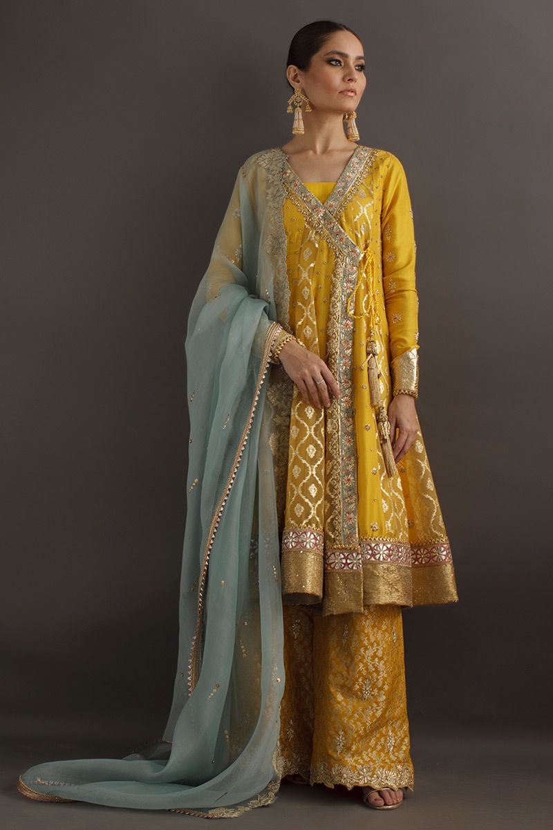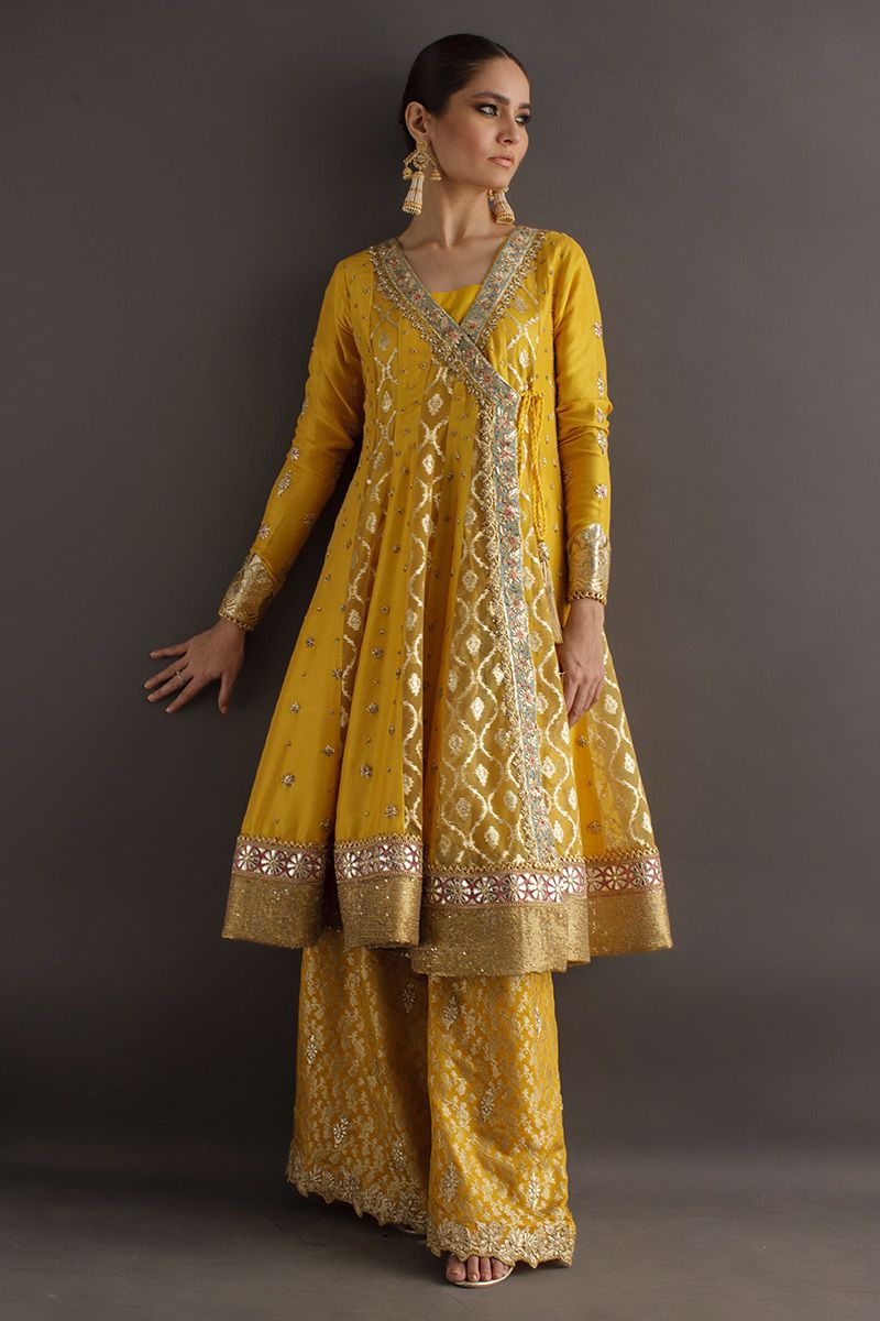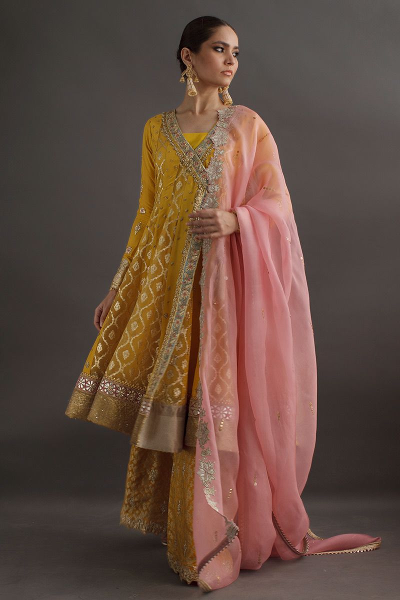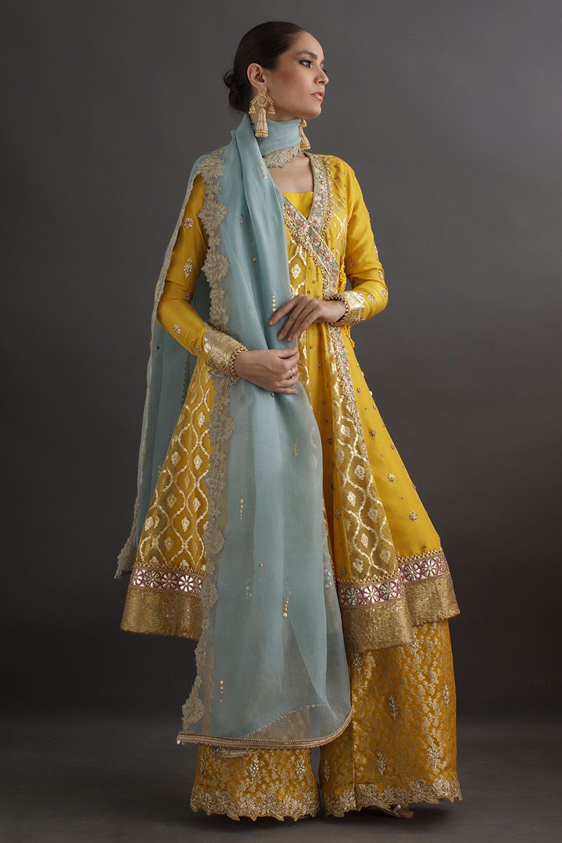Esthetically crafted chrome yellow angrakha.  A blend of gold weave and pure raw silk fabric. The kaliyan are enhanced with intricate work of zardozi, kora, sequin and pearl on all over the front. The sleeves comprises of gota and resham booti with the fancy fabric edging. This Mughal look is paired with banarsi dhaka pants and canal blue, embroidered border organza dupatta.