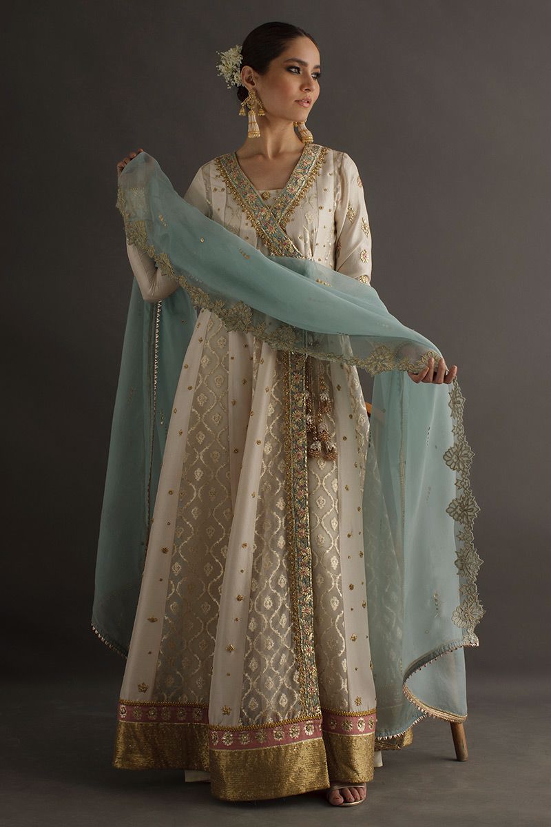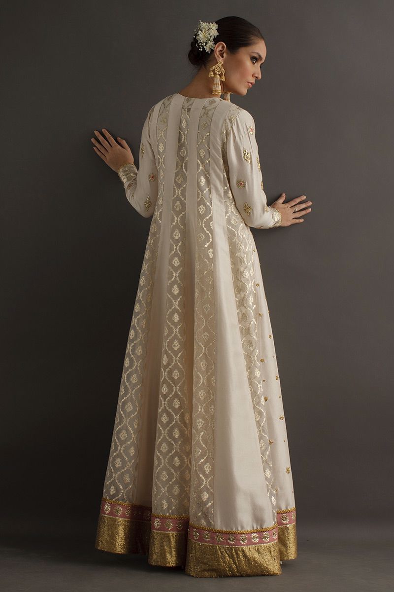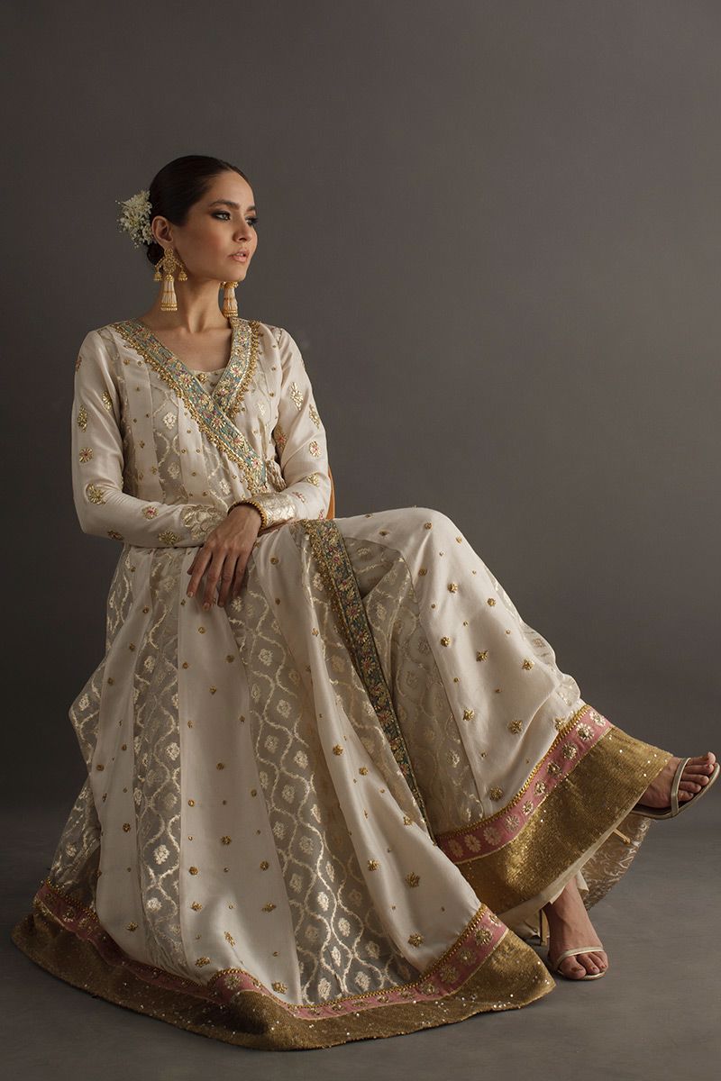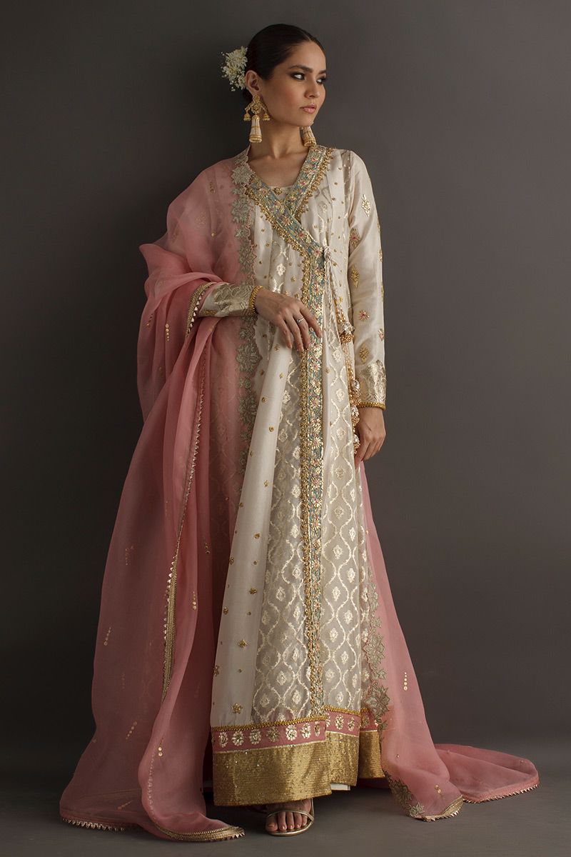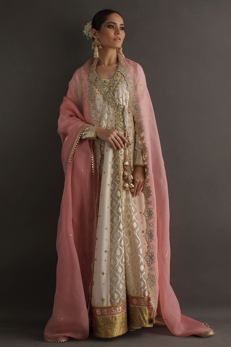 Esthetically crafted ivory angrakha.  A blend of gold weave and pure raw silk fabric. The kaliyan are enhanced with intricate work of zardozi, kora, sequin and pearl on all over the front. The sleeves comprises of gota and resham booti with the fancy fabric edging. This Mughal look is paired with same color semi pure churidar and pink, embroidered border organza dupatta