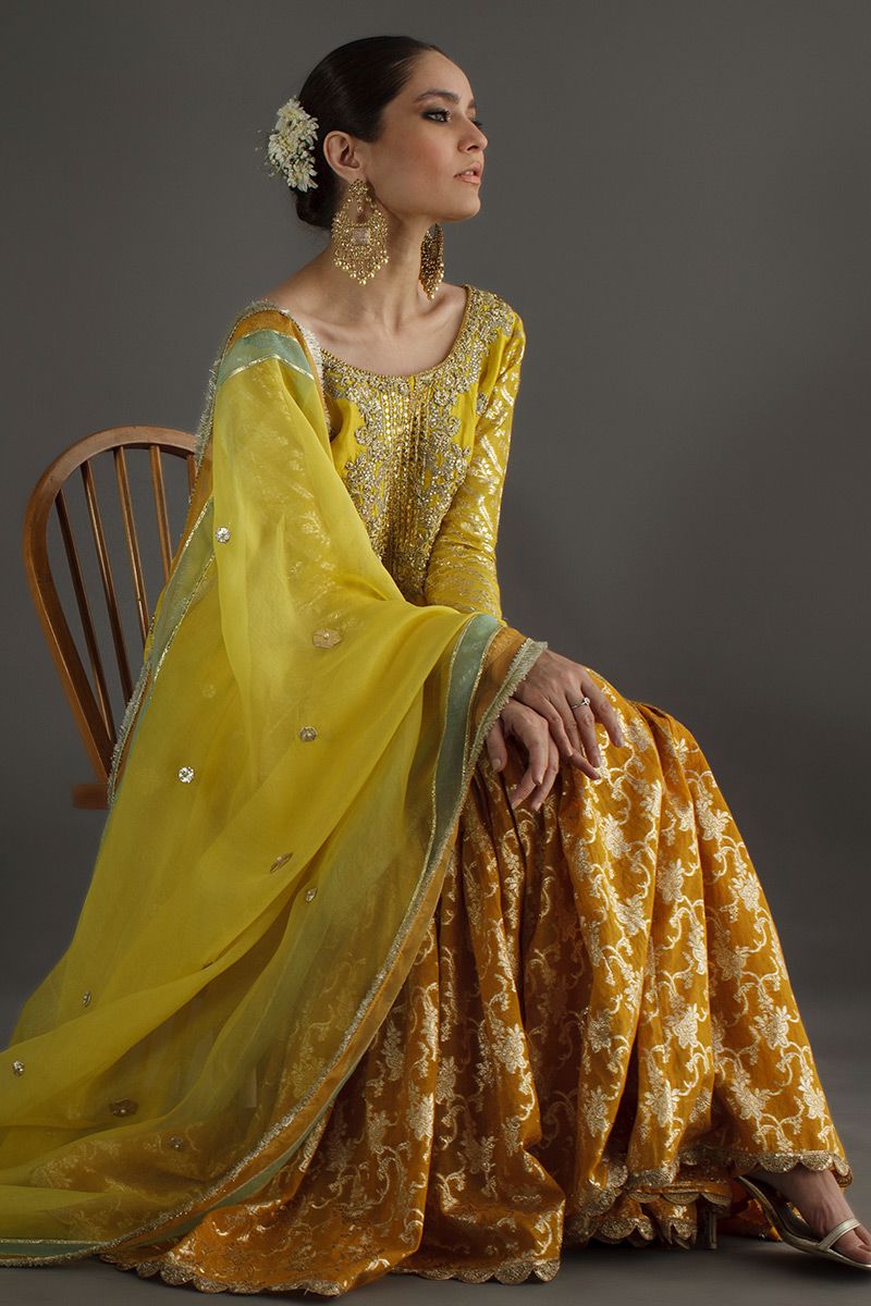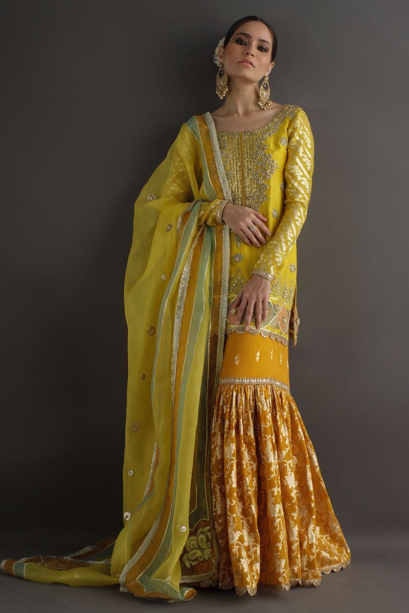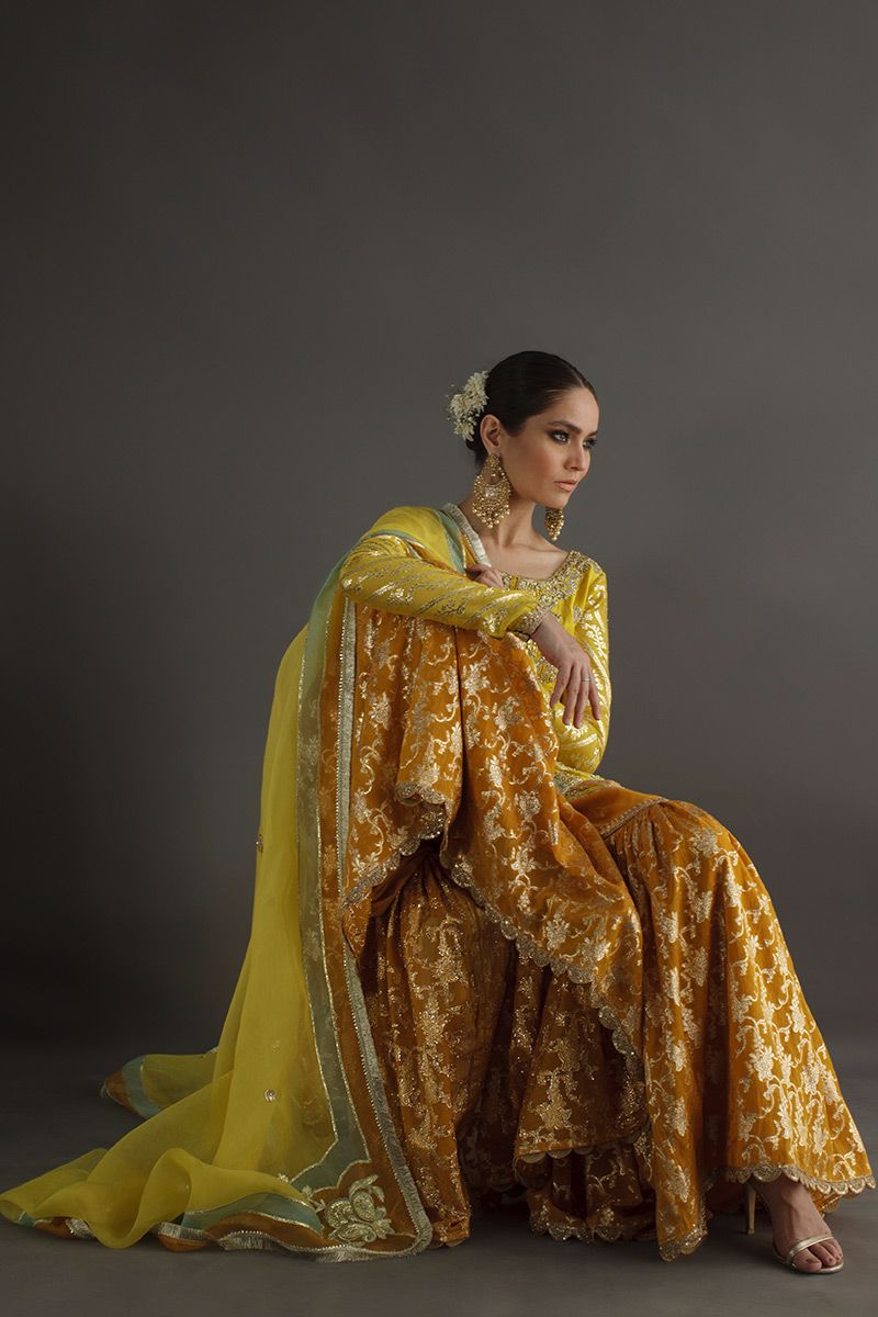 Unexceptionally beautiful, this primrose yellow short shirt is a true representation of our ancestral heritage. The dull gold resham work around the neckline depicts the Mughal architecture along with kamdani. The artwork like image is created in the borders towards the hem. Comprising of Mughal gateway arches and Persian flower placements on front and back along with miniature bootis. Lifting up the tones of primrose yellow shirt with beeswax gharara. Similar tone color pure gota work, to be purchased at additional cost.