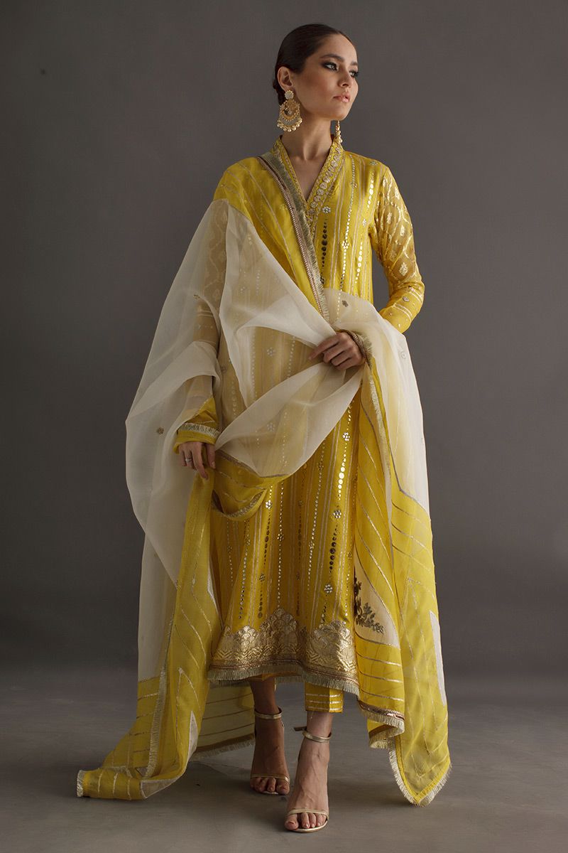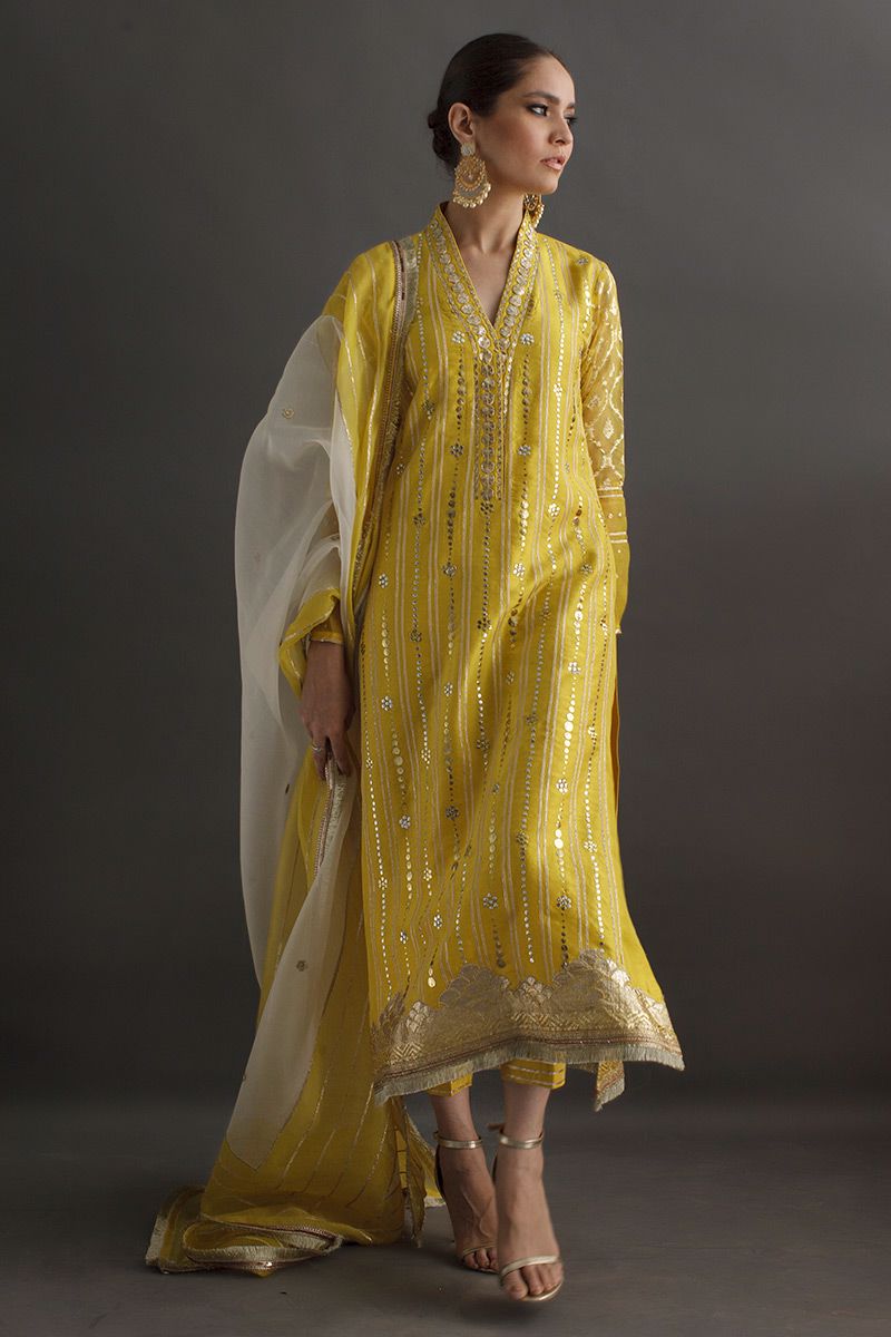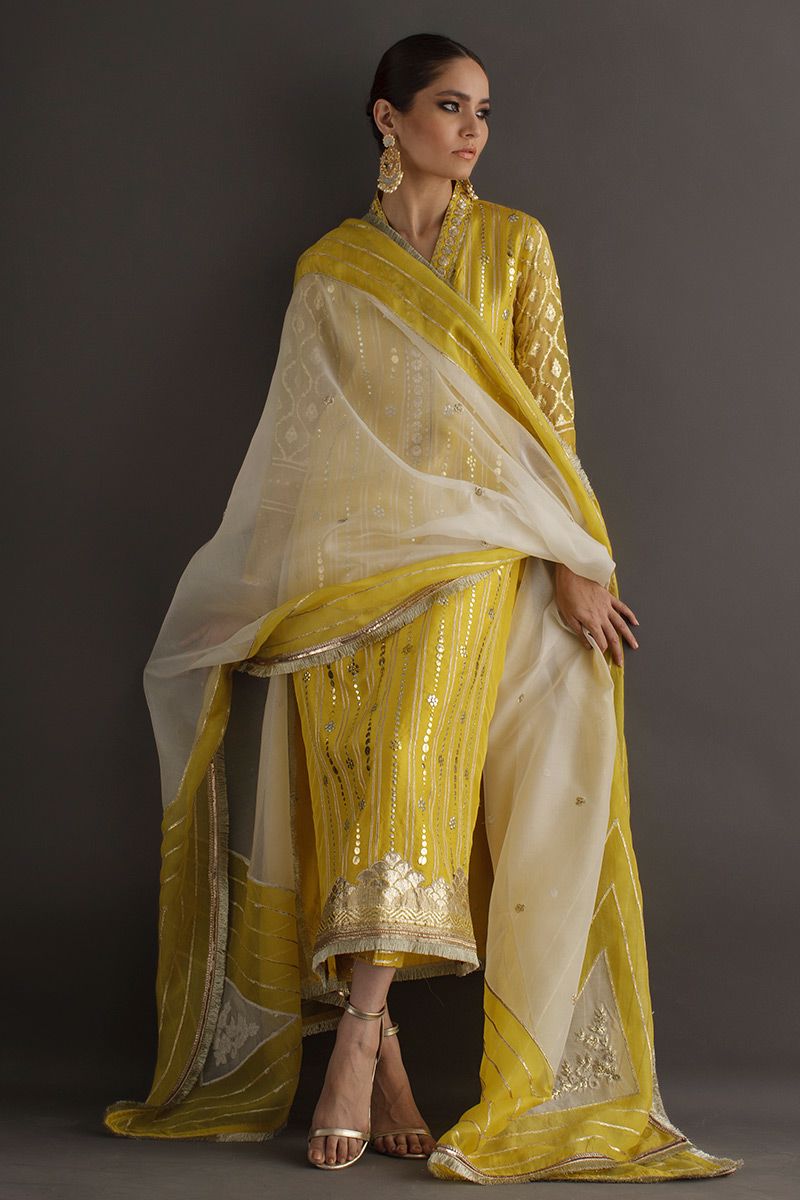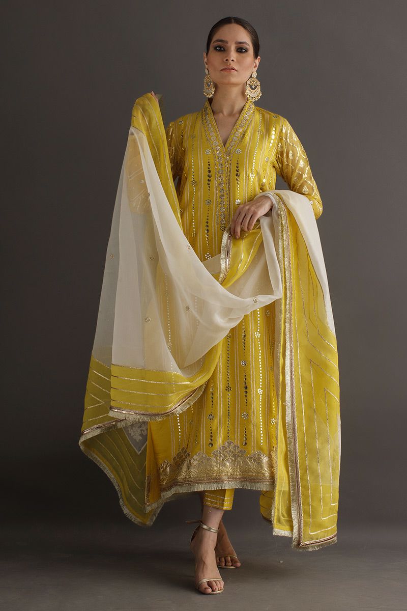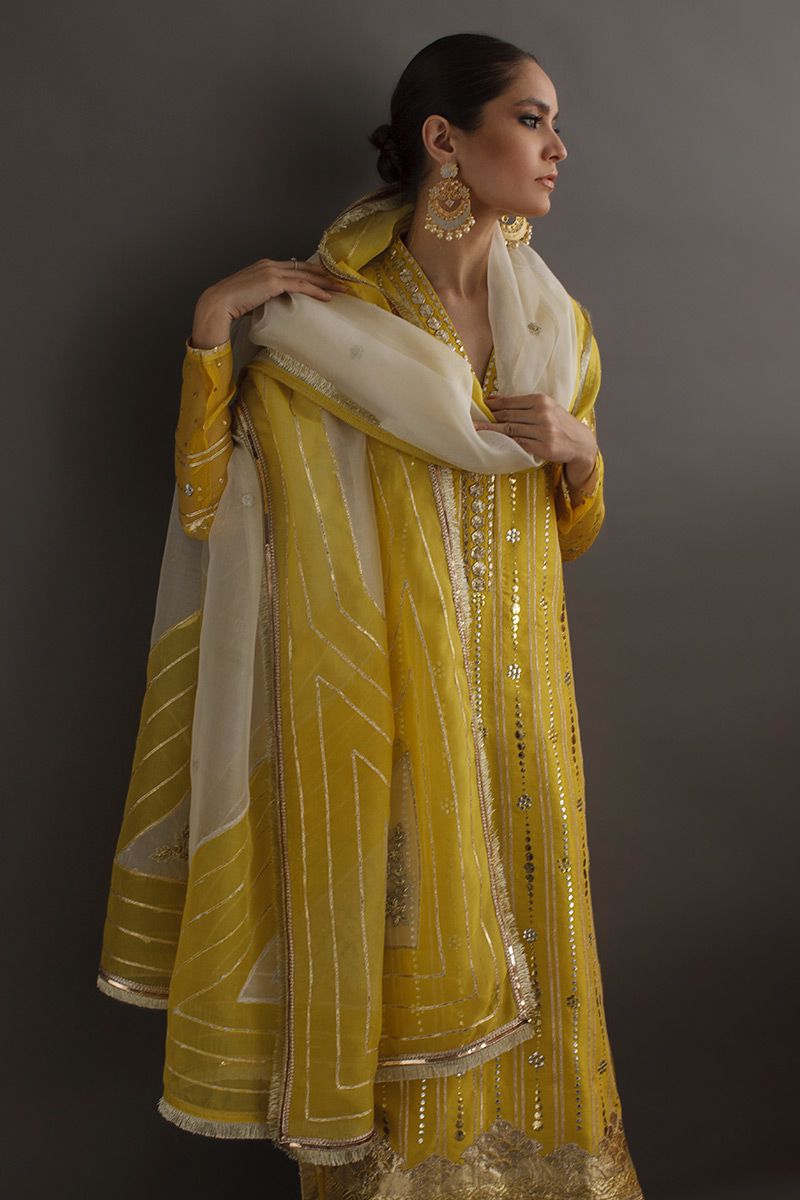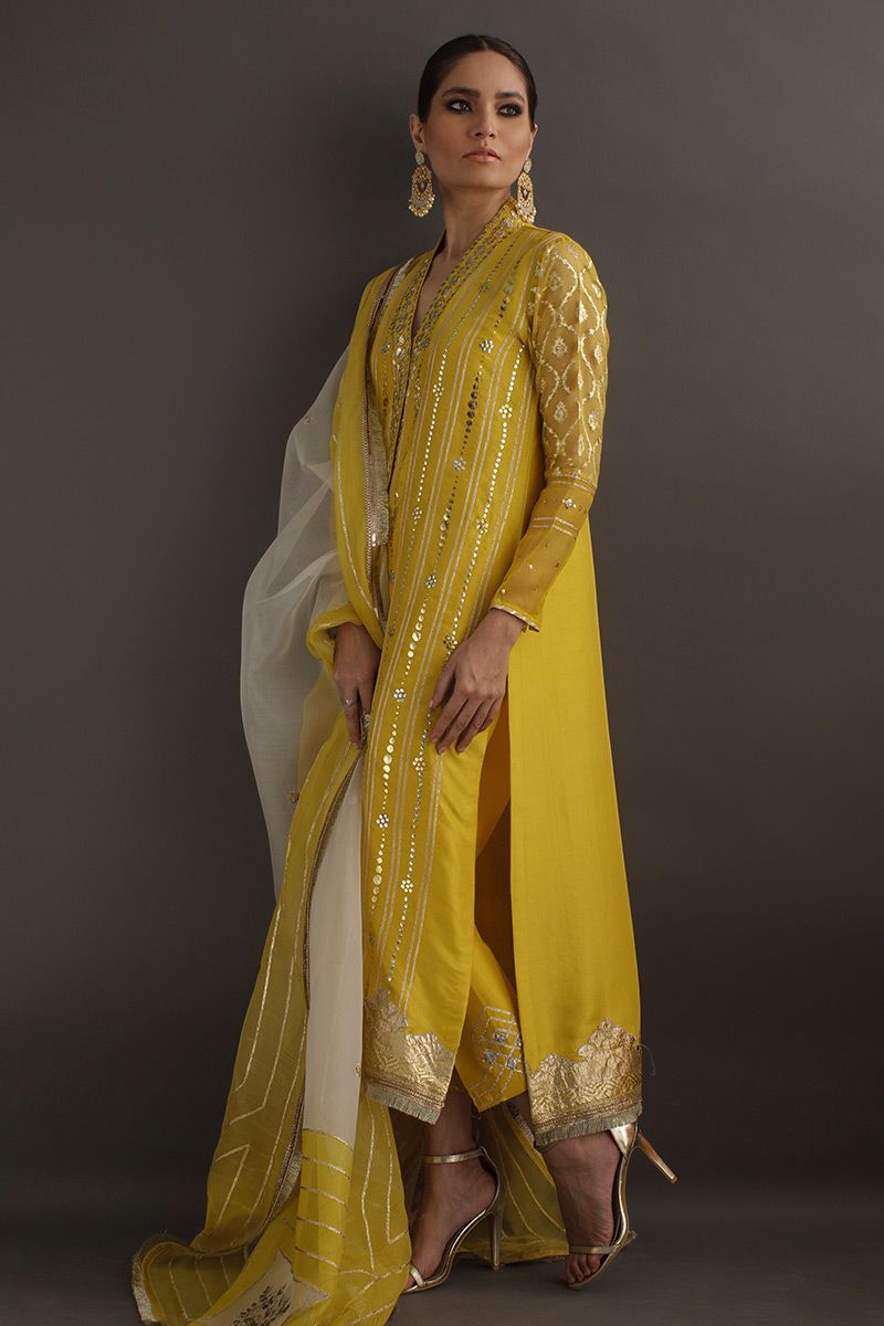 A heritage being passed on to generations, this turmeric pure raw silk shirt comprising of gold and silver kamdani handwork. The geometric alignments is well stitched with ogee motif on sleeves. Completing off the look same color pure raw silk pants and double color organza embroidered dupatta, can be purchased separately.