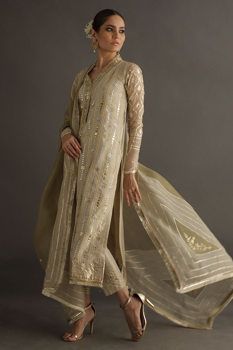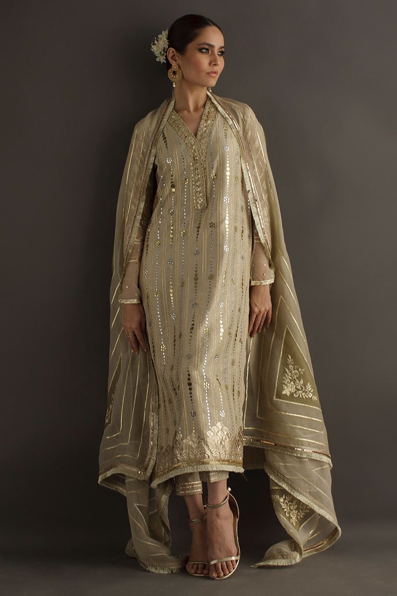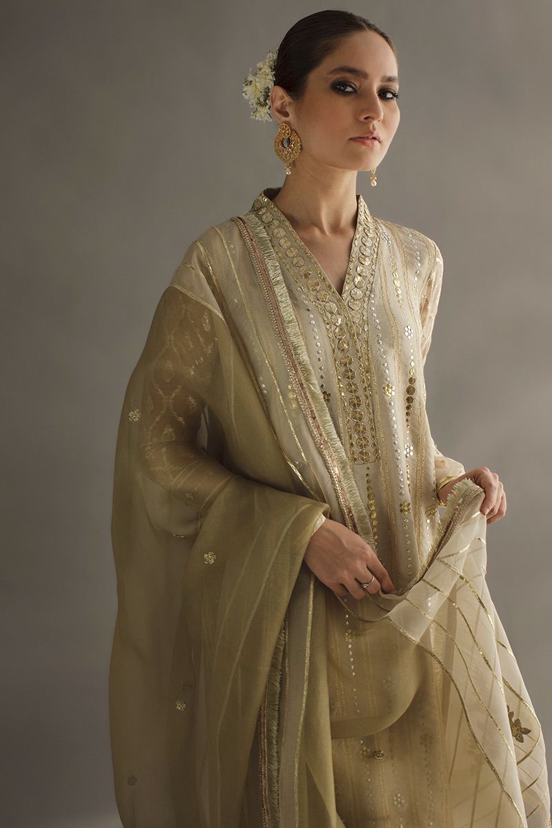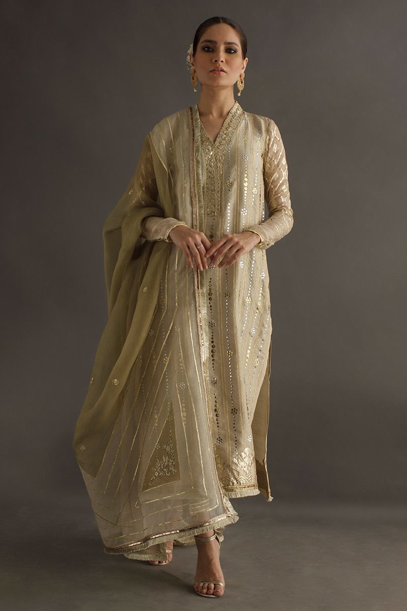 A heritage being passed on to generations, this turmeric pure raw silk shirt comprising of gold and silver kamdani handwork. The geometric alignments is well stitched with ogee motif in sleeves. Completing off the look same color pure raw silk pants and double color organza embroidered dupatta, can be purchased separately.