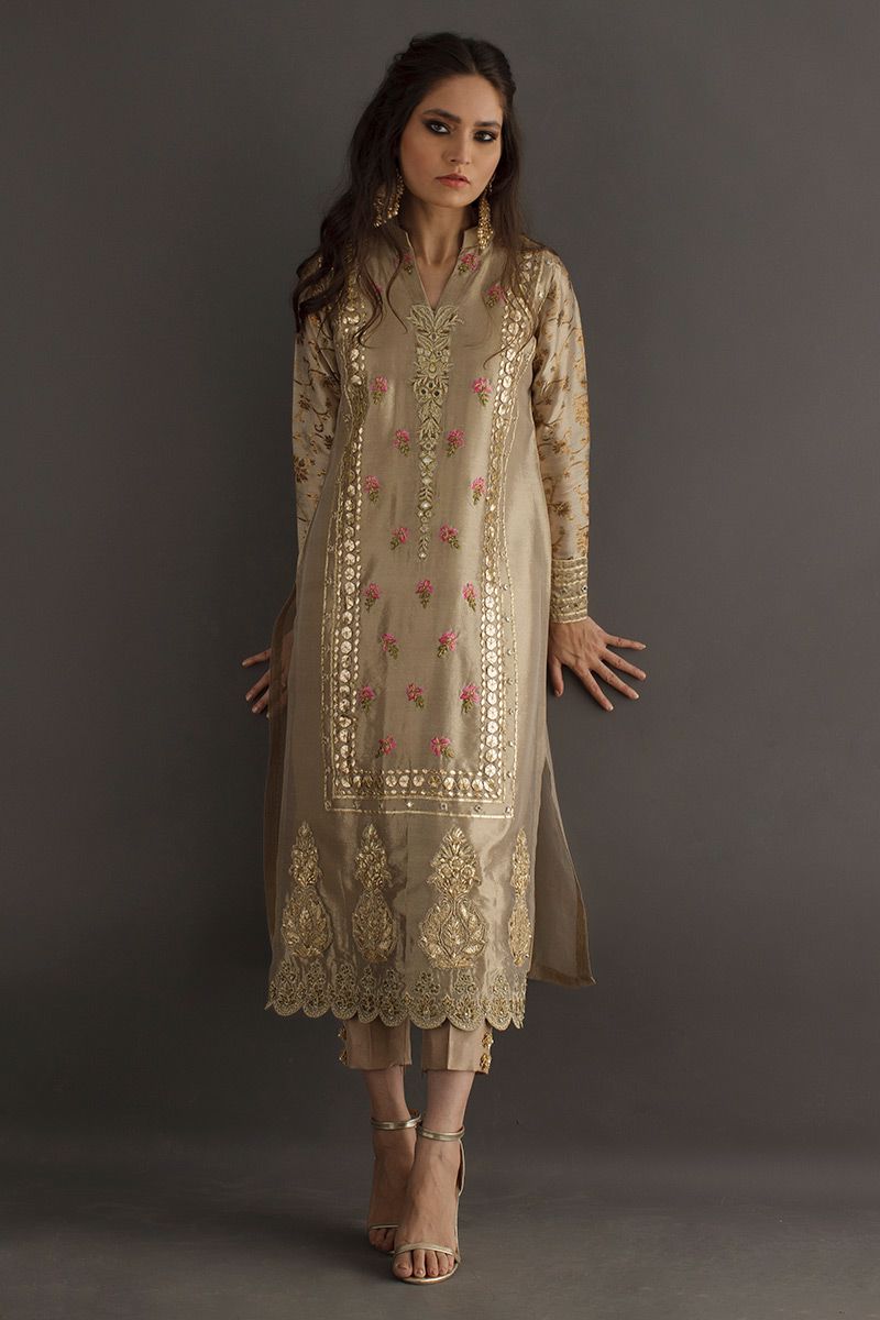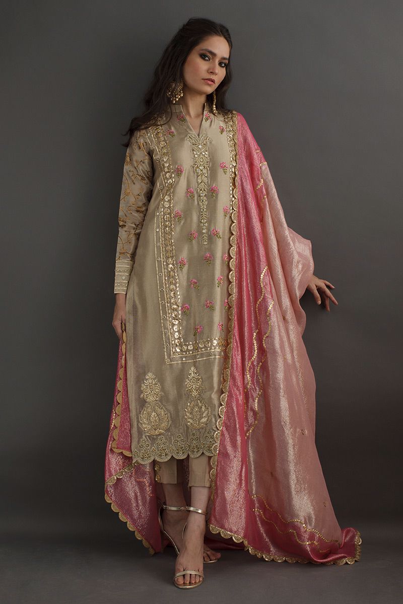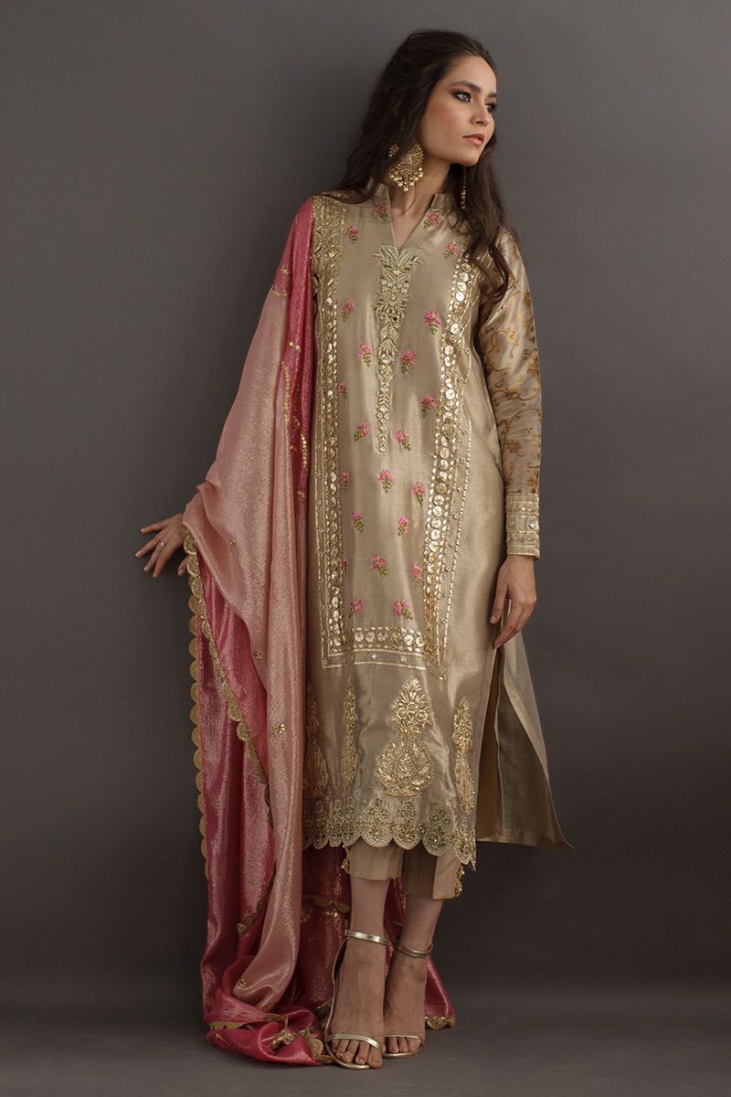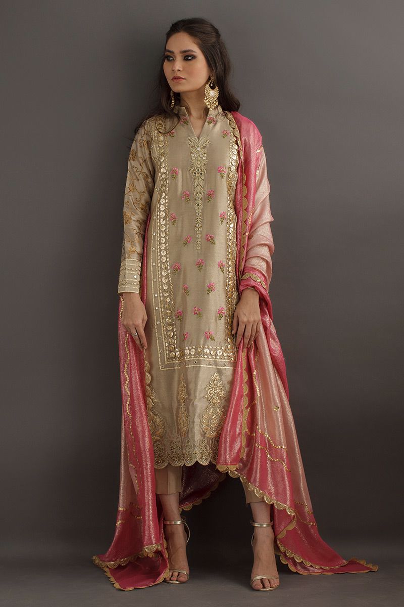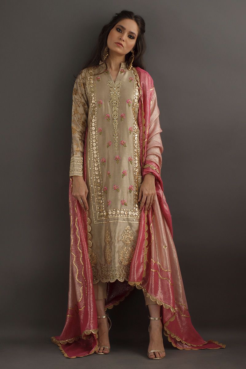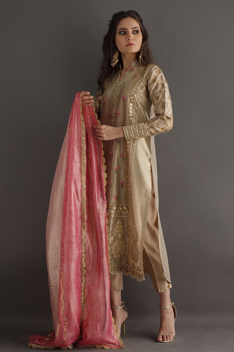 Gleaming like sand, this beige gold long shirt is hand crafted with delicate work of gota, zari, nakshi, dabka and mirror. The resham florals adds a vibrant color to the subtleness of the shirt. Same color prime raw silk pants is paired with contrast two tone pink dupatta.