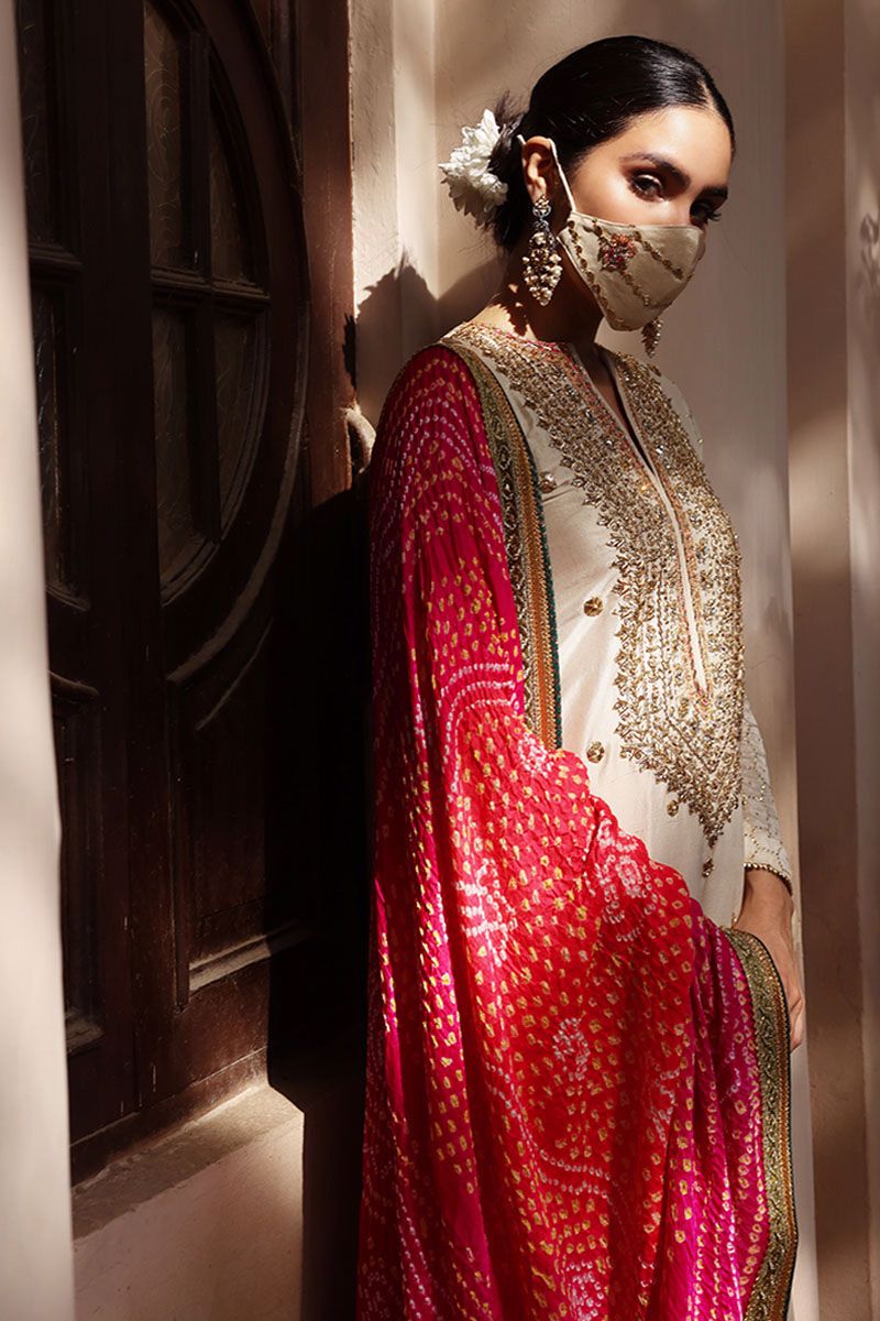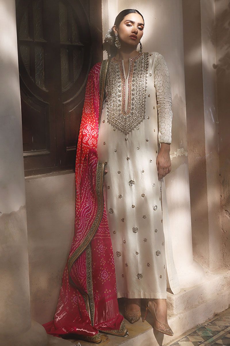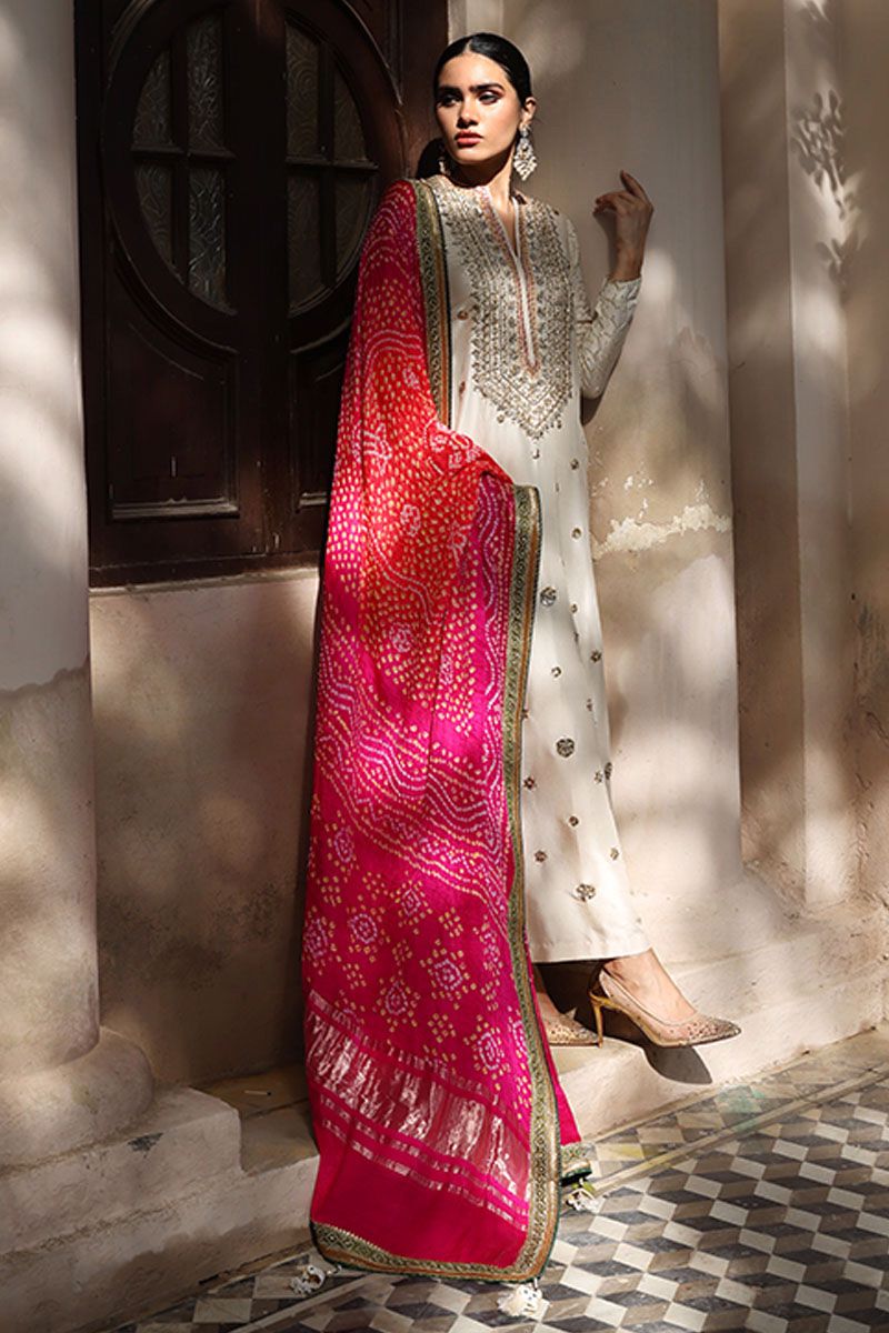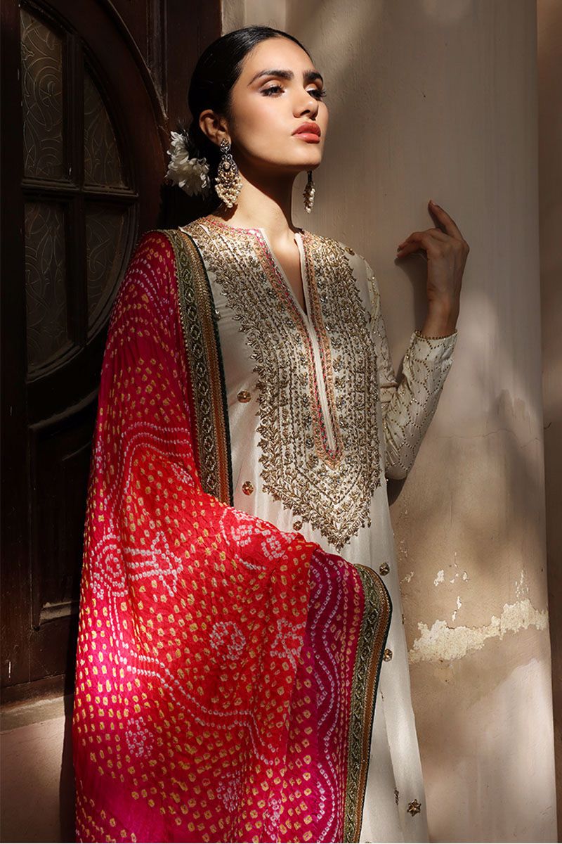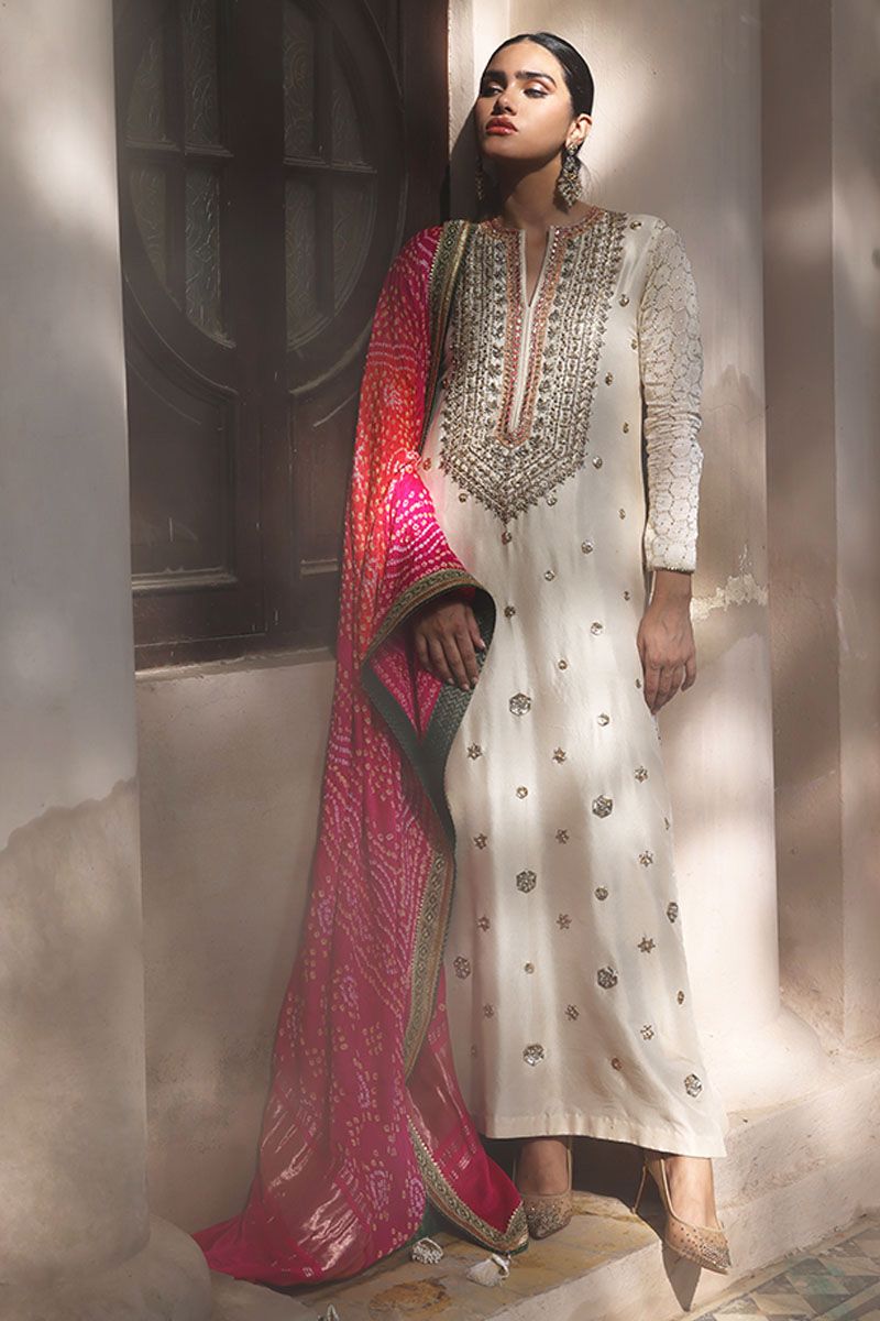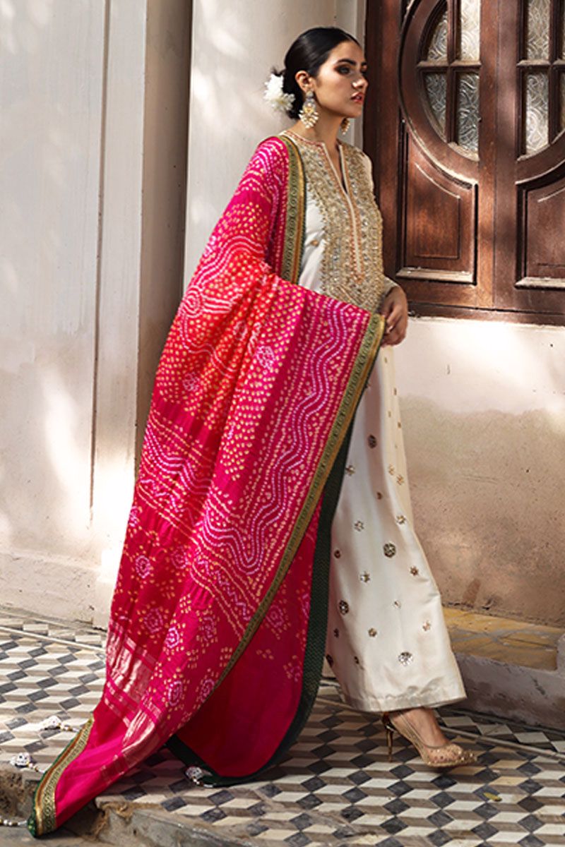 An ivory color pure raw silk long shirt with a combination of pastels color applique on neckline with delicate and intricate zardozi handwork on it with gota booti all over the shirt. It is paired with the same color pure raw silk high-waisted pants and pure silk bandhni dupatta can be purchased at an additional cost to elevate the look of the attire.