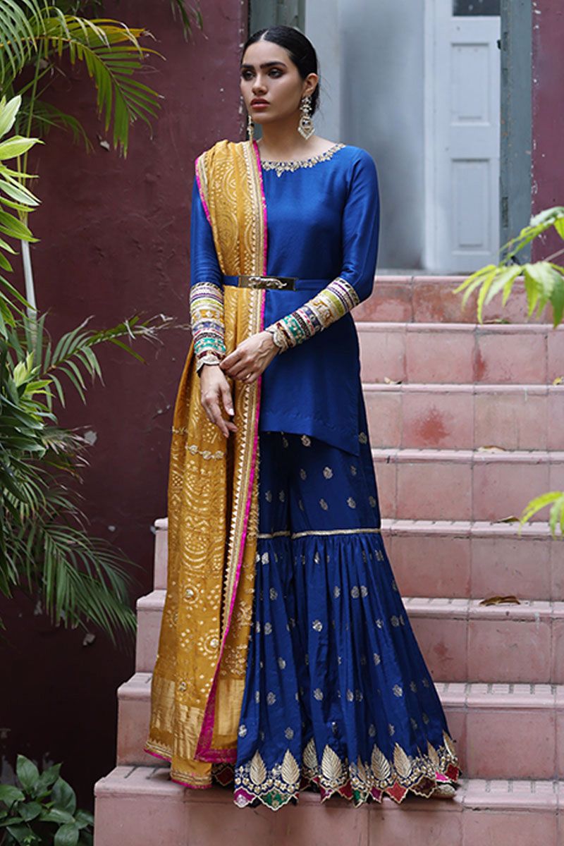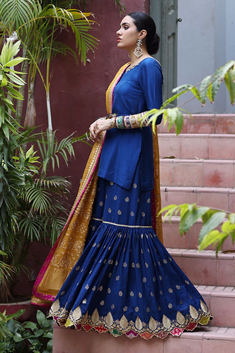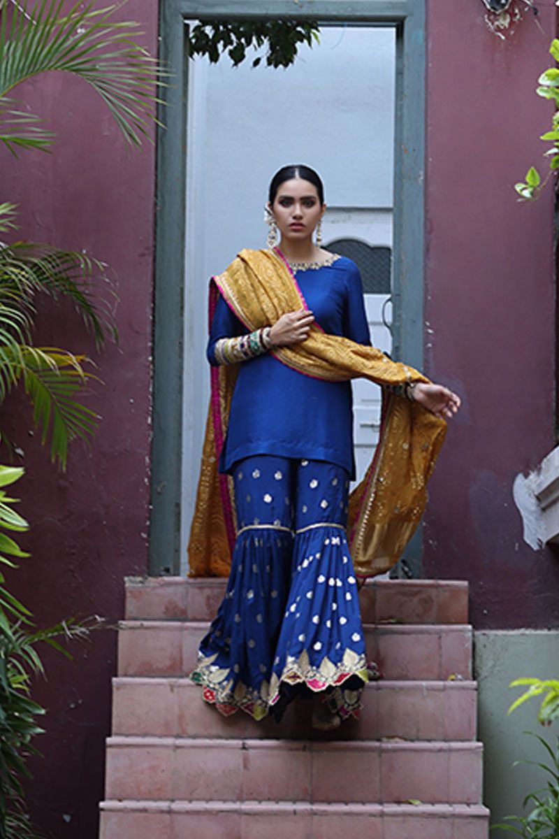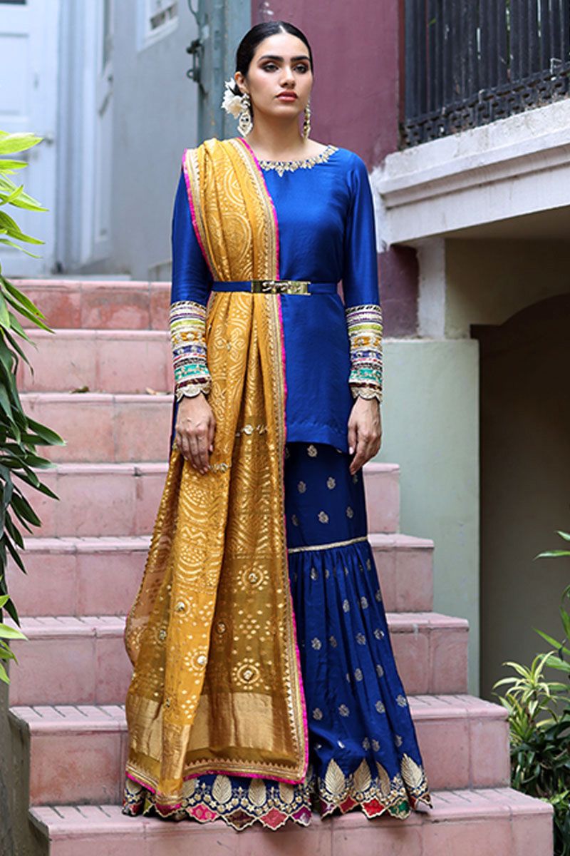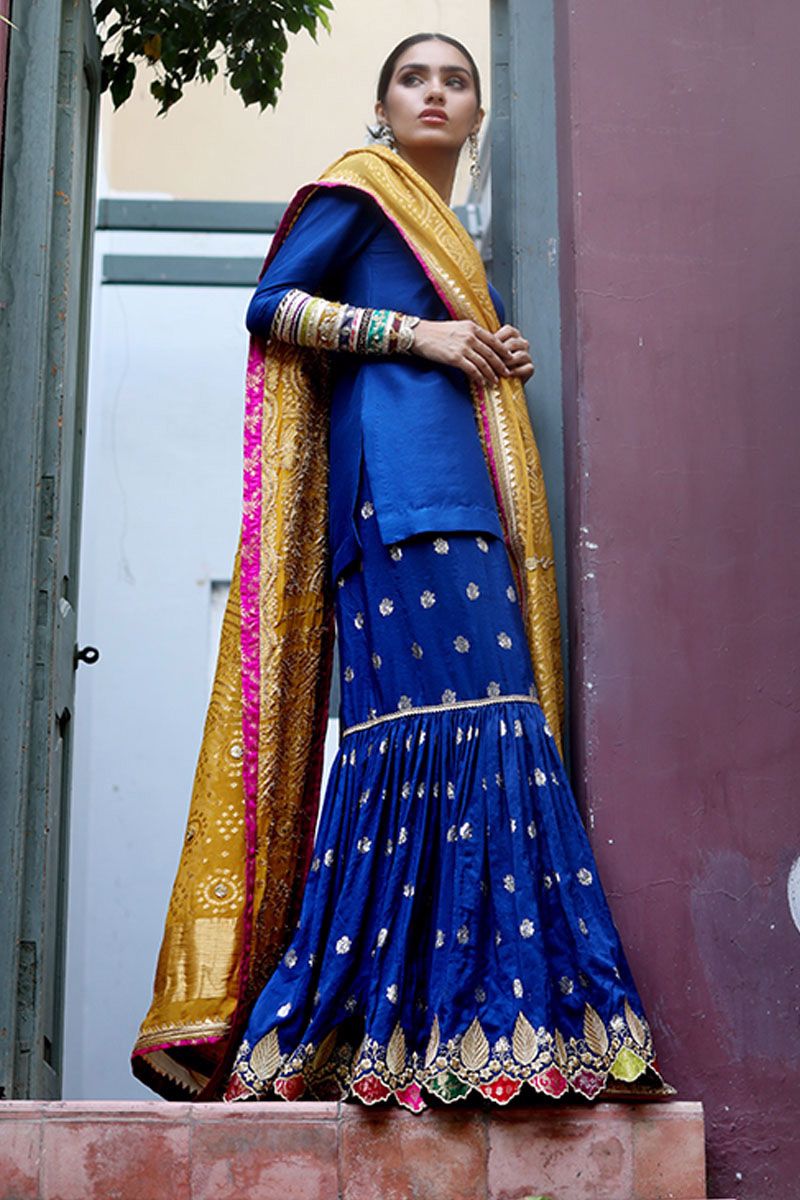 The royalty, this true blue pure raw silk short shirt is incorporated with applique of vibrant colors on the sleeves and enhanced with resham and zardozi embroidery on it. The front and back neck with golden embroidery and gold metallic leopard belt is uplifting the overall look. Pairing the shirt with the matching color lorex gharara with the detailing of multicolor jamawar patches and zari embroidery on it is paired with pure chiffon banarsi dupatta in mustard color.