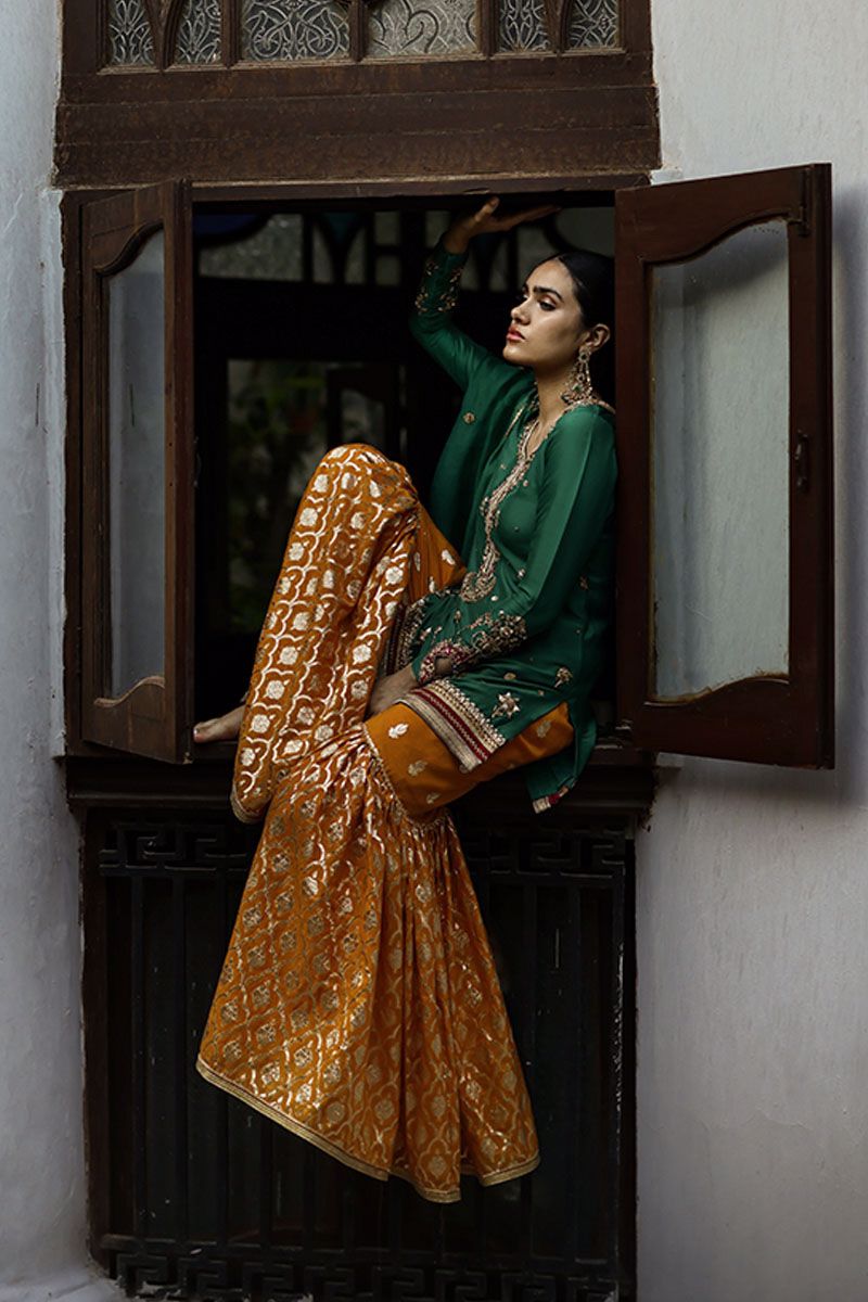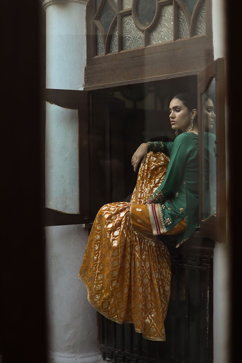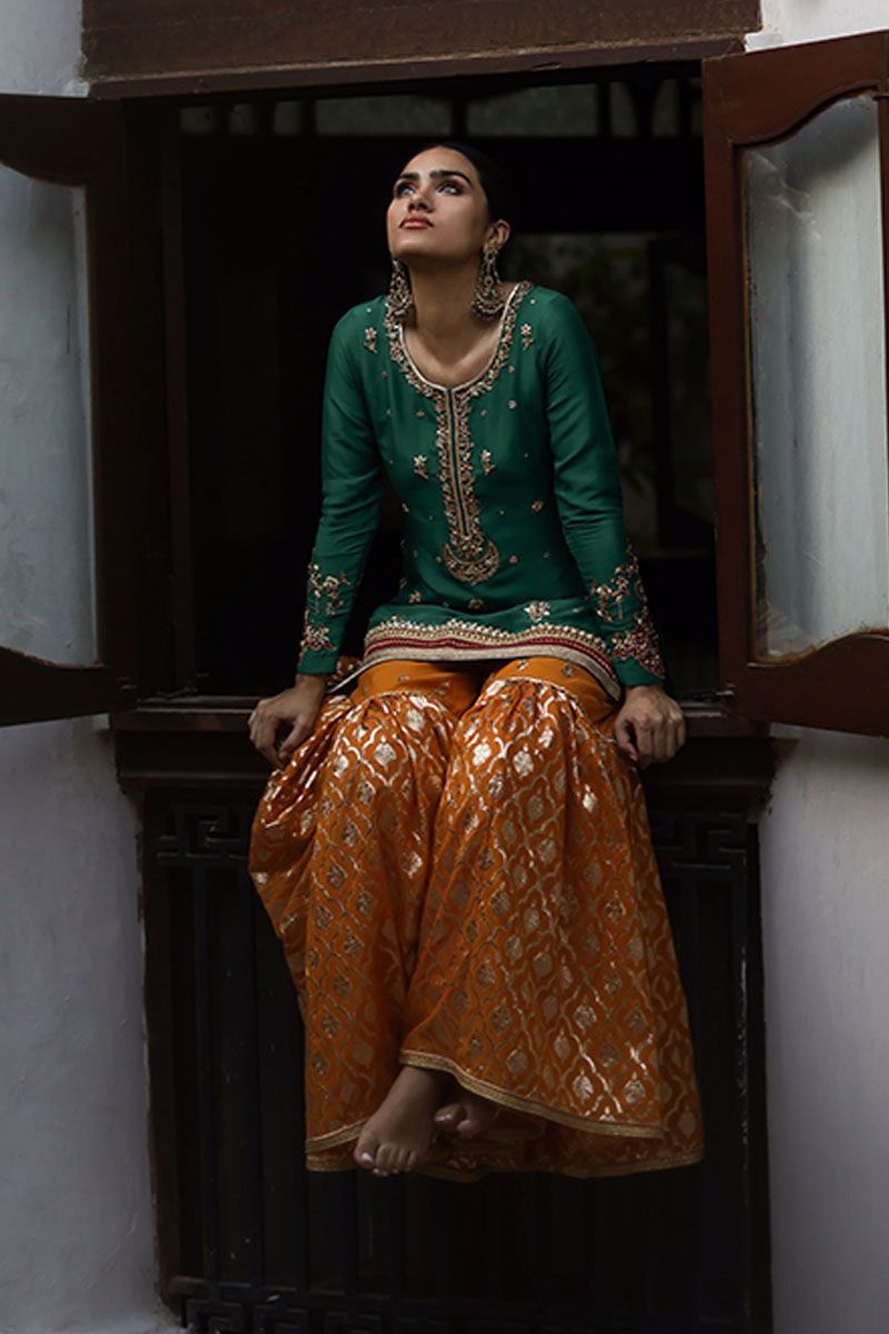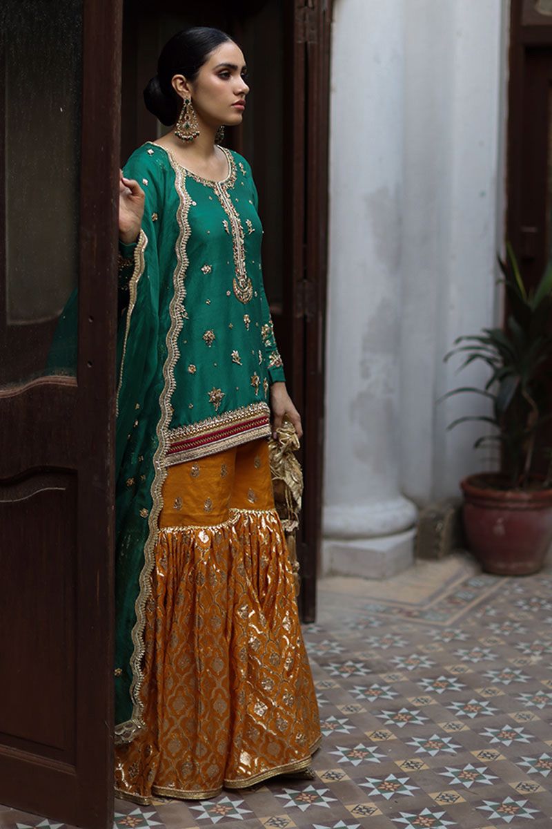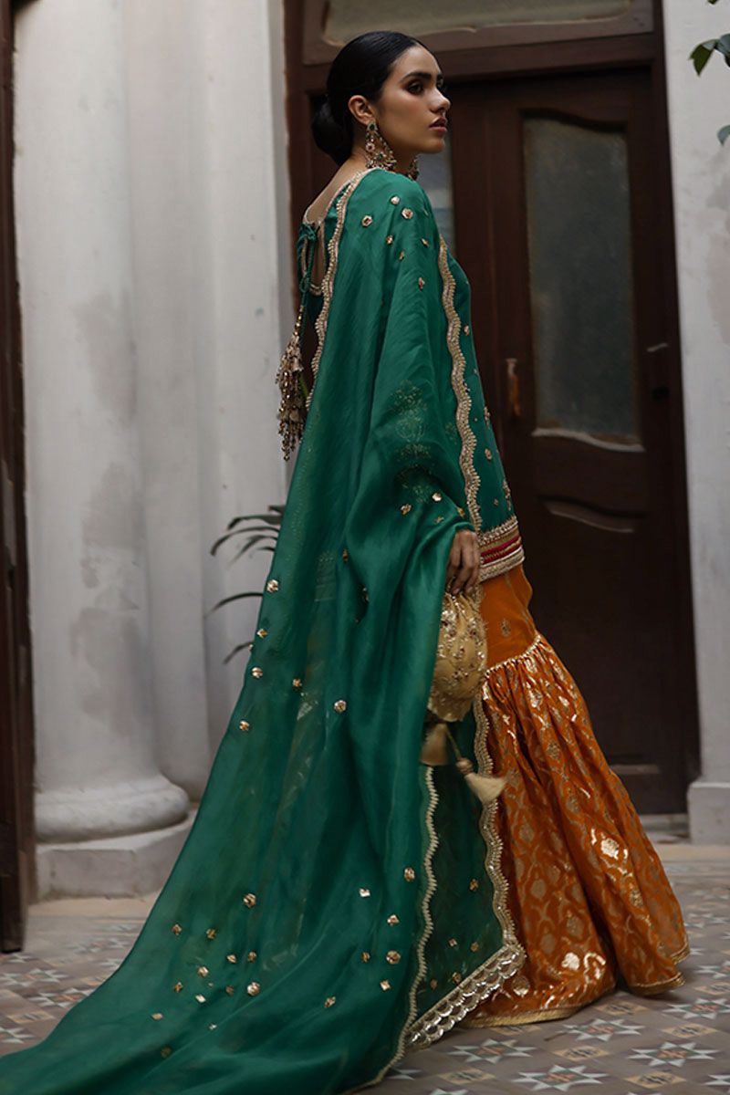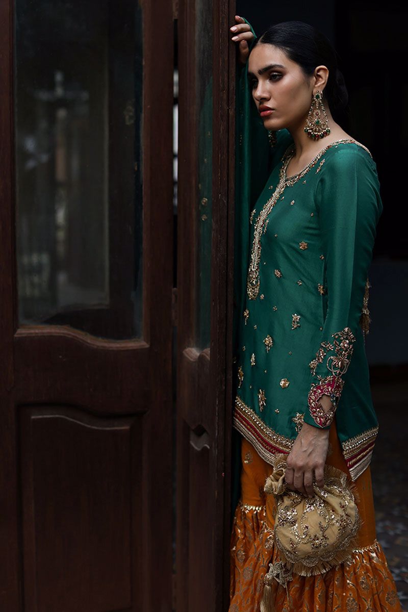 A classical, this emerald green short pure raw silk shirt is a true color of our festive tradition. The neckline has a combination of zardozi, zari and resham. The hemline is having intricate details of handwork and applique work with bootis all over the front and back. The back neck is beautified by gota work and tassels. The embroidery and cutwork on the hem of the sleeves enhance the overall look of the shirt. Elevating the look of emerald green shirt with beeswax gharara. Pure organza emerald green dupatta with gota work and beautiful beads scalloped border on four sides.