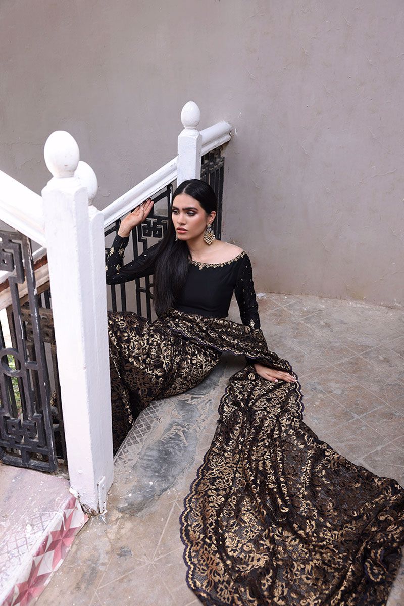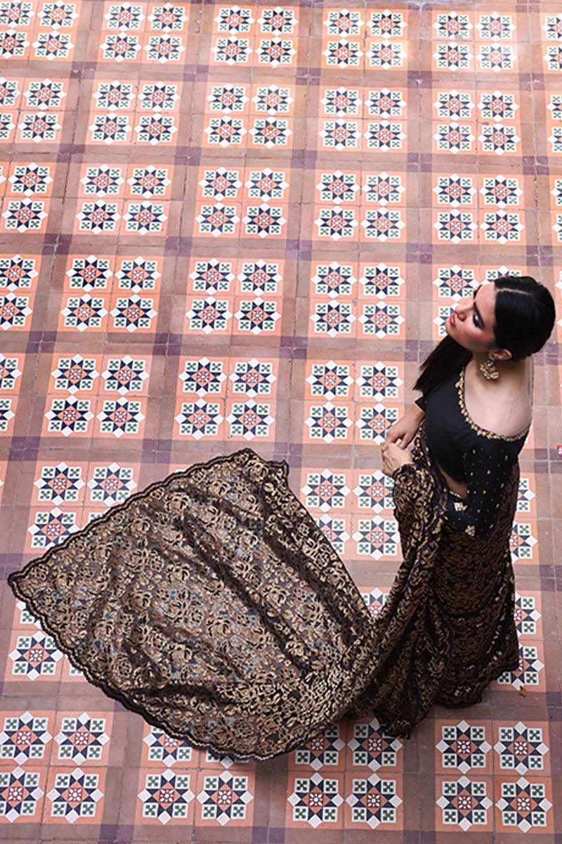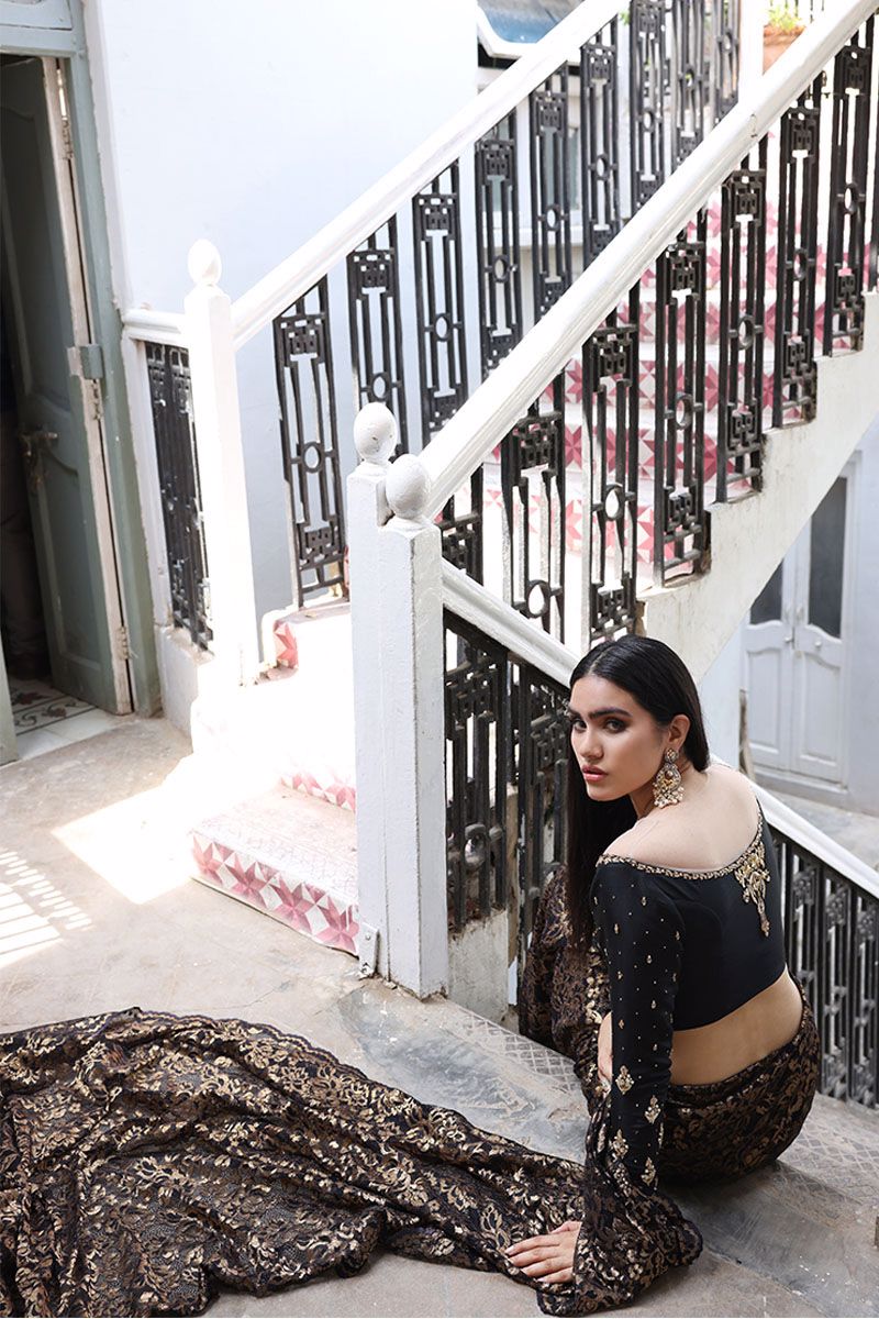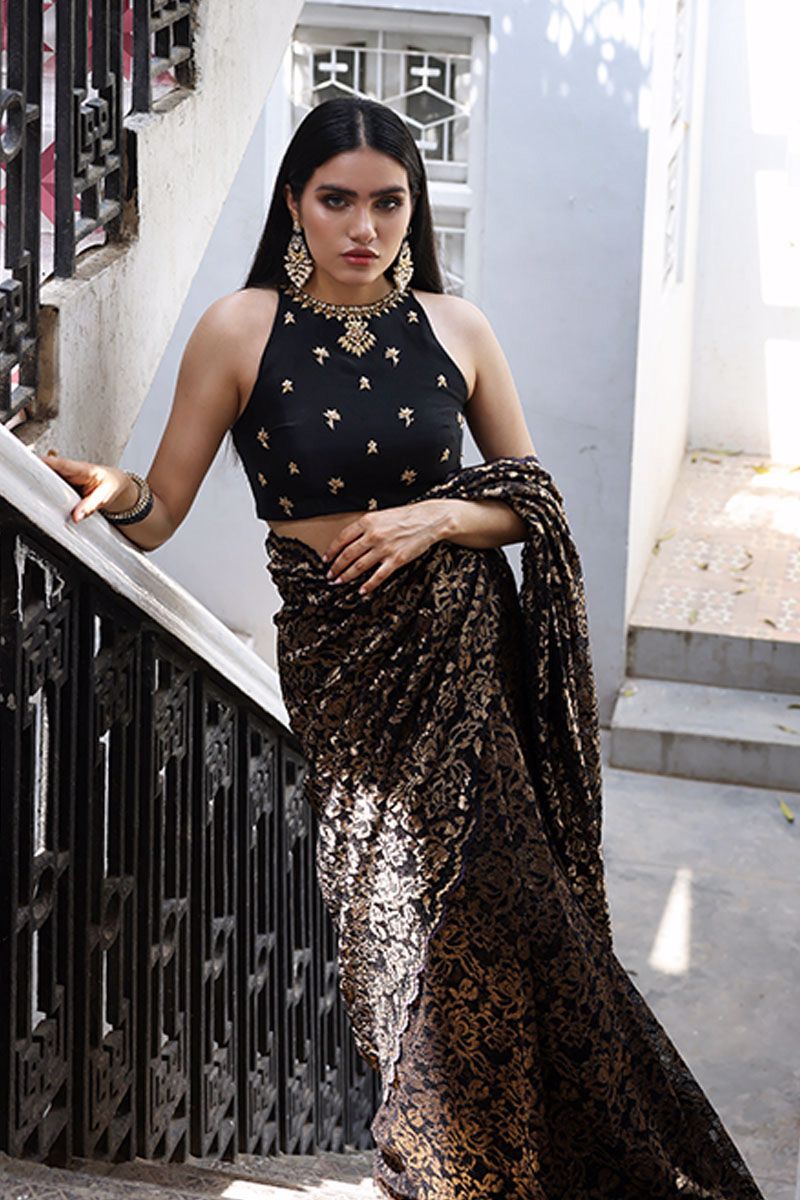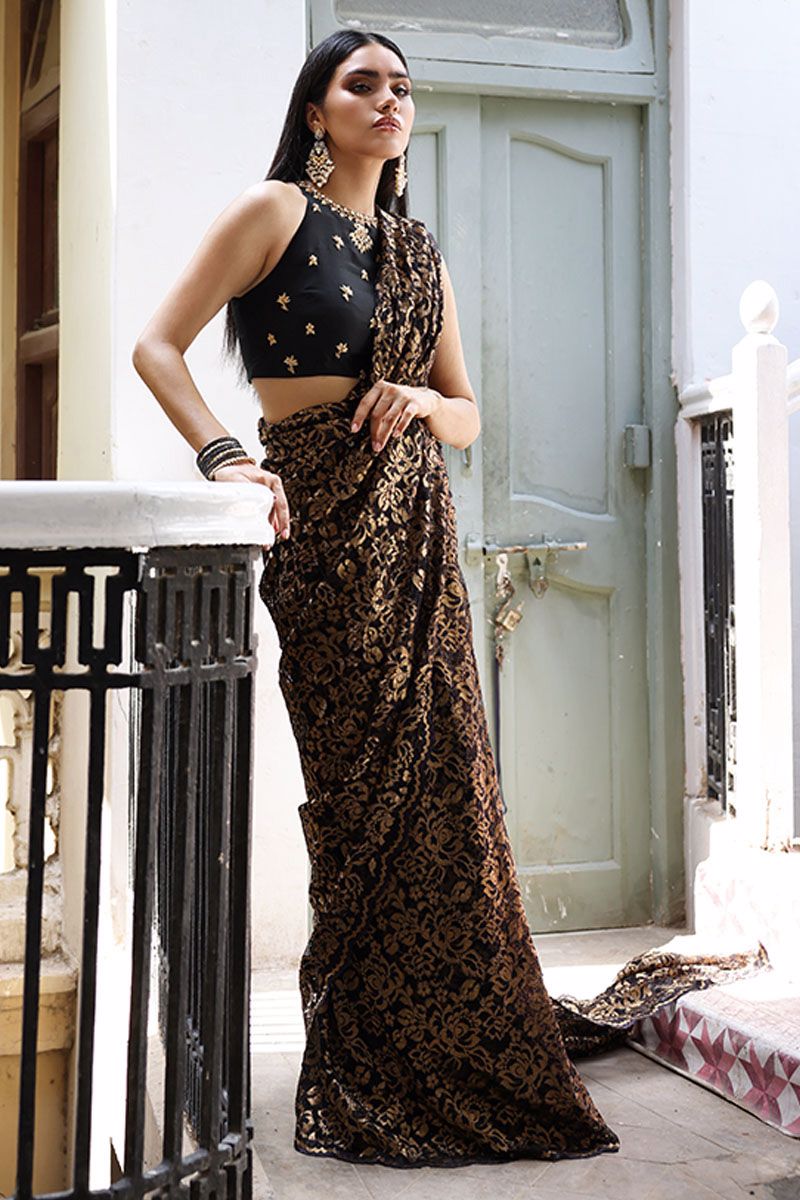 A sophisticated black Chantilly saree with a combination of golden color is paired with a Pure raw silk bodice, which is embellished with beautiful work of zardozi, pearls, crystals and cut dana on front and back necklines, and the overall bodice is enhanced by small bootis. Sleeves are beautified with bootis on the wrist till forearm and scattered sequins and zardozi on overall sleeves.