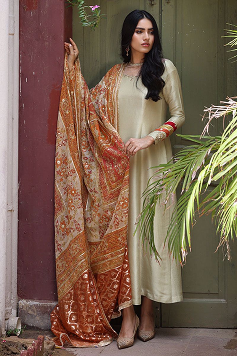 A symbol of urbanity, a mellow green princess cut long shirt in pure raw silk is aesthetically crafted with refined hand embroidery of zardozi, sequins and crystal beads. The three shaded applique work with hand embroidery of zardozi and gota is enhancing the look of overall attire. Same color Rotana silk pants and Maysuri screen printed dupatta with the variations of gota handwork can be purchased separately.