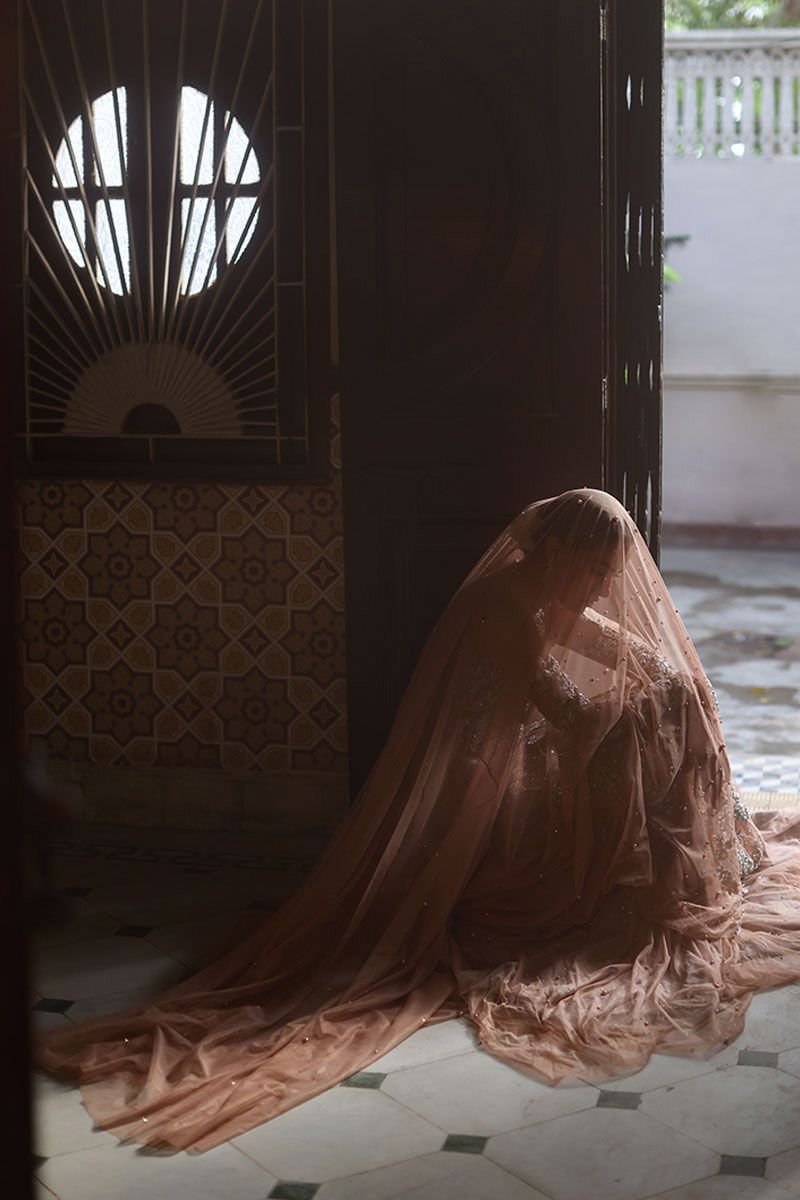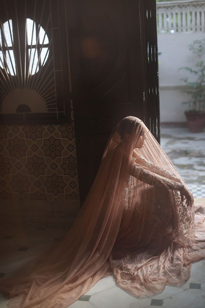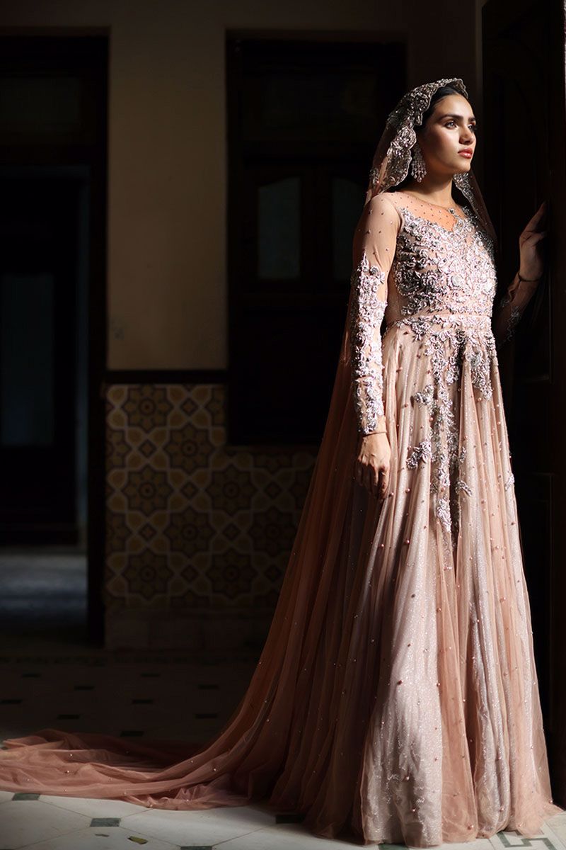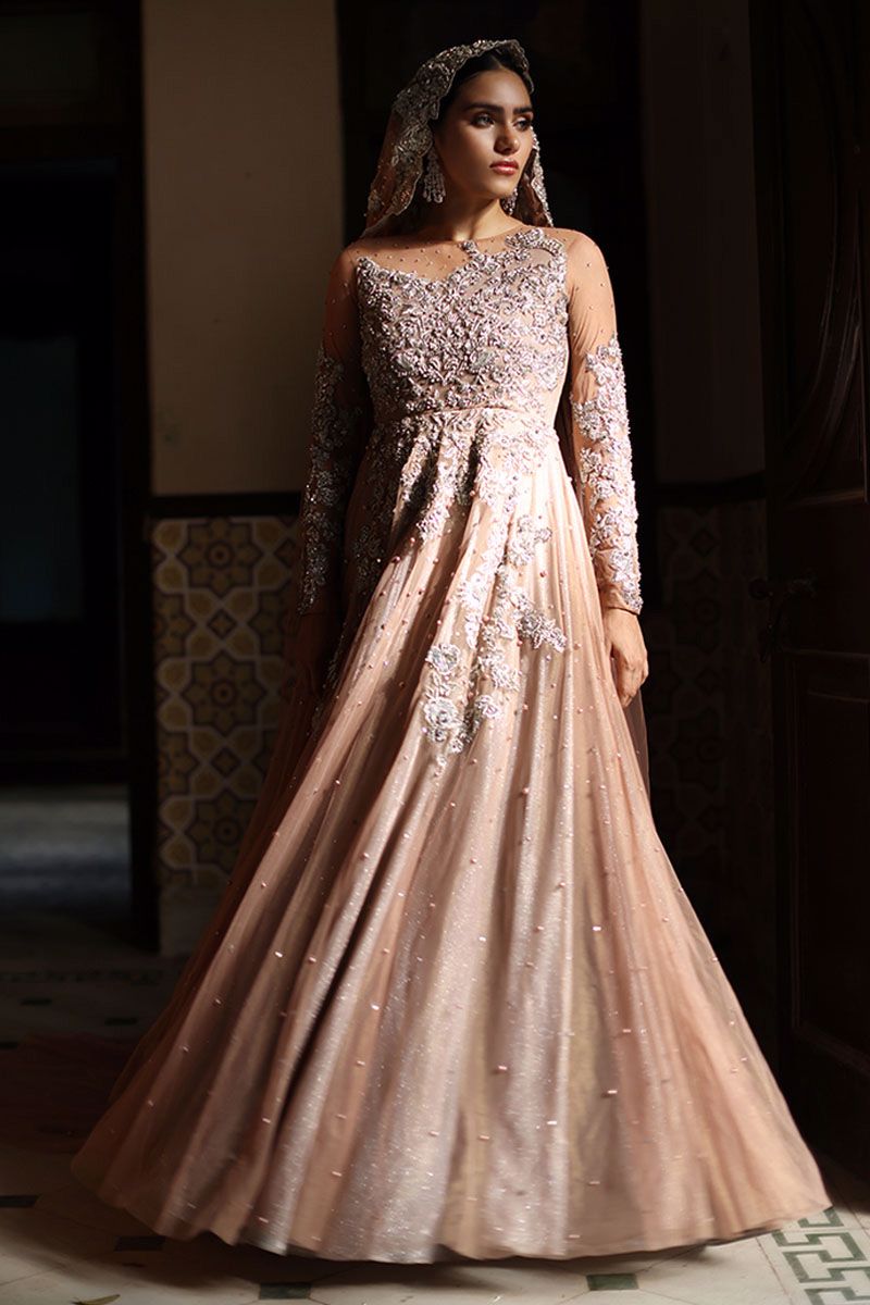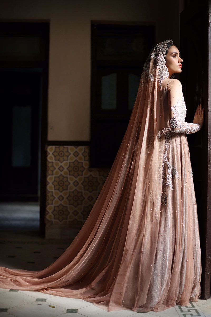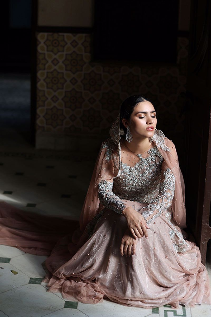 A canvas of nude pink net has gotten life in a beautiful bridal long gown with crystals, stones and heavy silver zardozi work providing a perfectly sparkling look. The gown is lined with a beautiful shimmer fabric which gives an extra spark to this outfit, while the paneled circular floor dragging dupatta (veil) with an eye scrunching handwork on the crown is giving flawless fineness to the whole attire.
