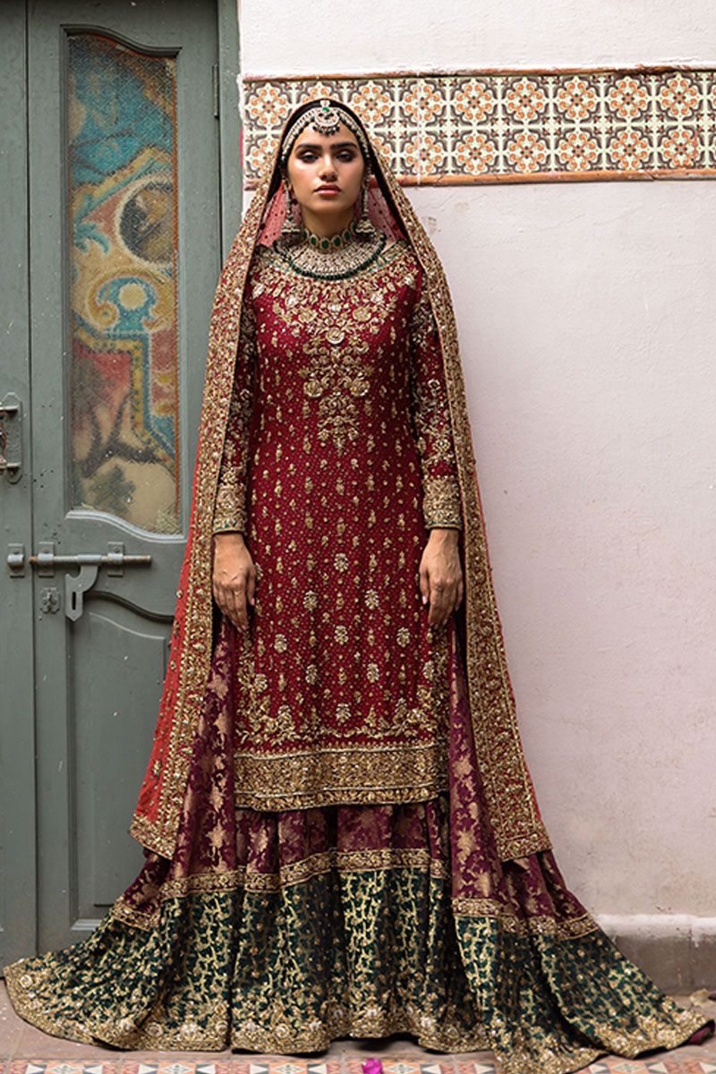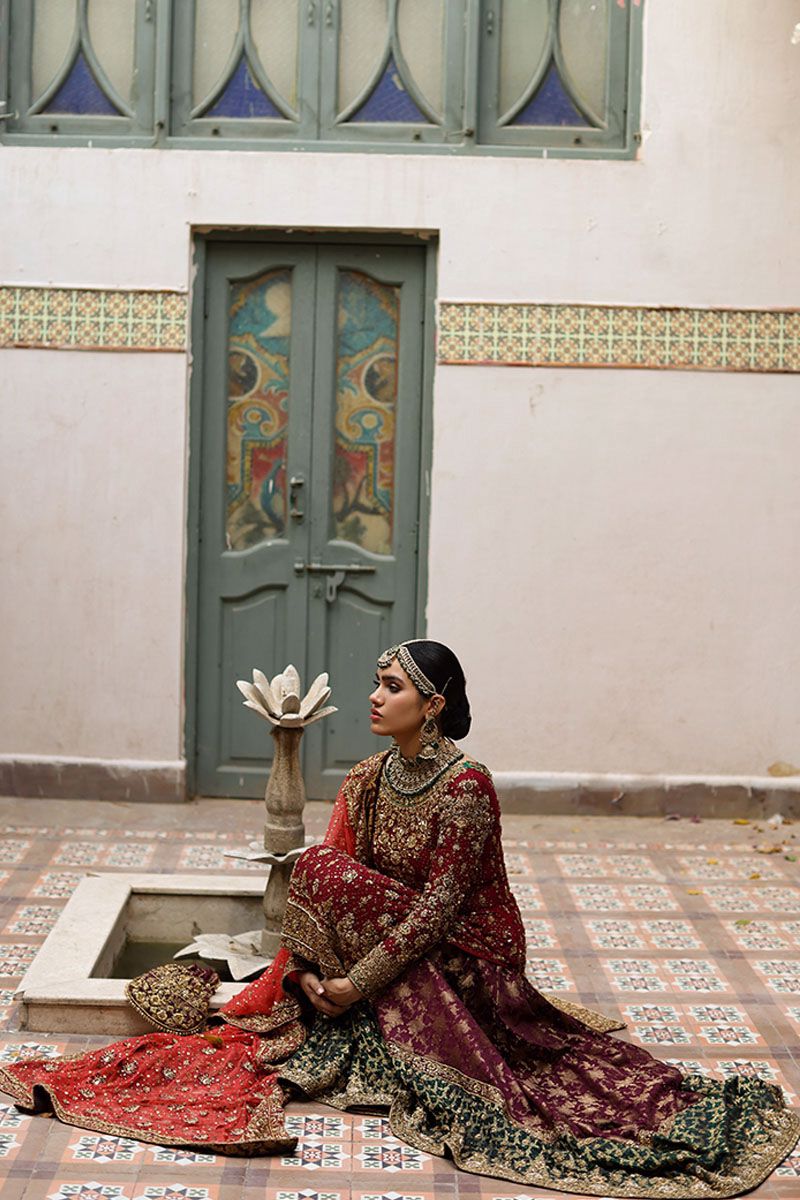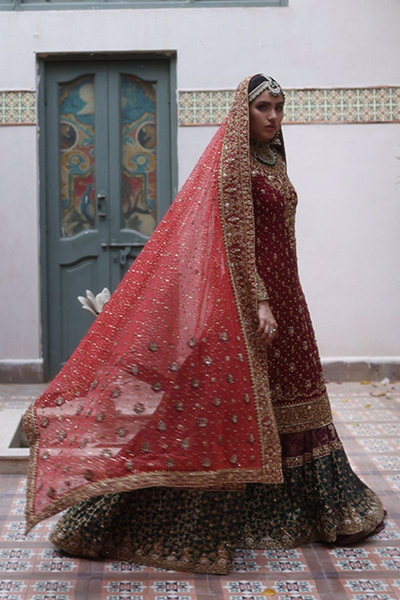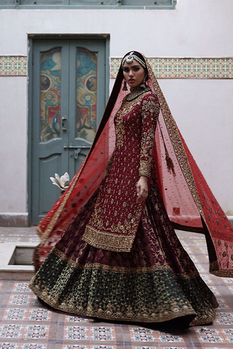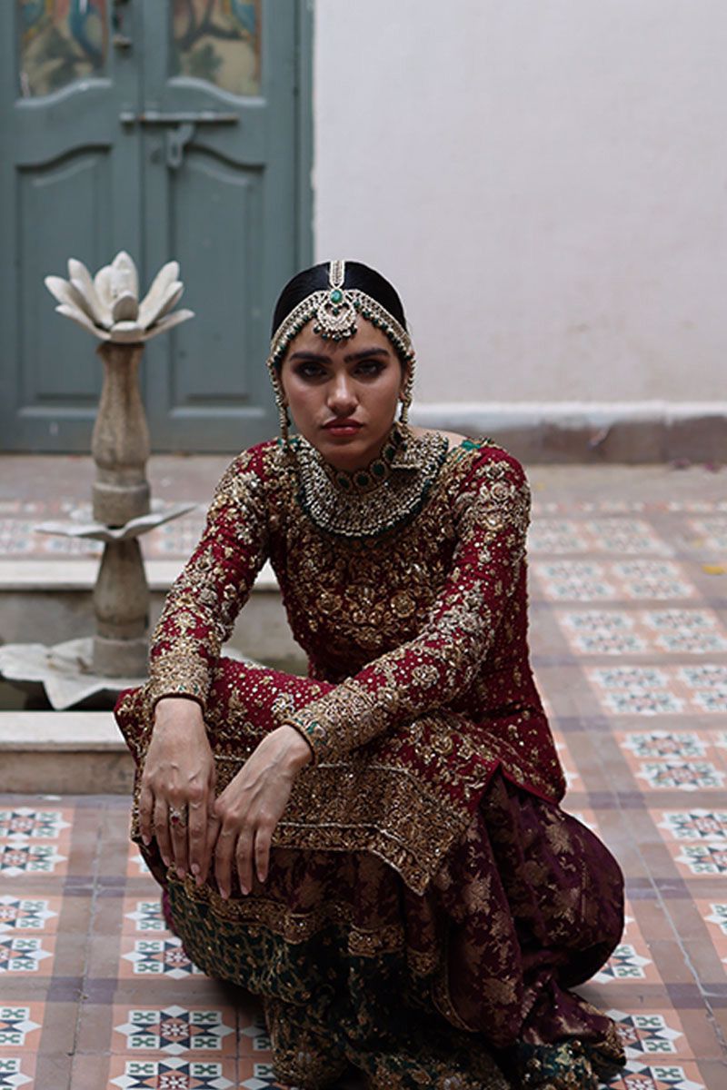 A classic choice of a beautiful maroon shade on pure khadi chaar taar is crafted with very intricate handwork of zardozi, dabka, naqshi, sequin, kamdani, mukesh and zari. This elegant beauty is complemented with purple farshi banarsi lehenga which is amalgamated with the applique of bottle green pure jamawar to create a traditional look, with very fine and elegant gold handwork. The melon-colored khadi net dupatta has a thick and heavily embellished border of zardozi and chan of kamdani, mukesh and booties give this bridal attire a graceful look.