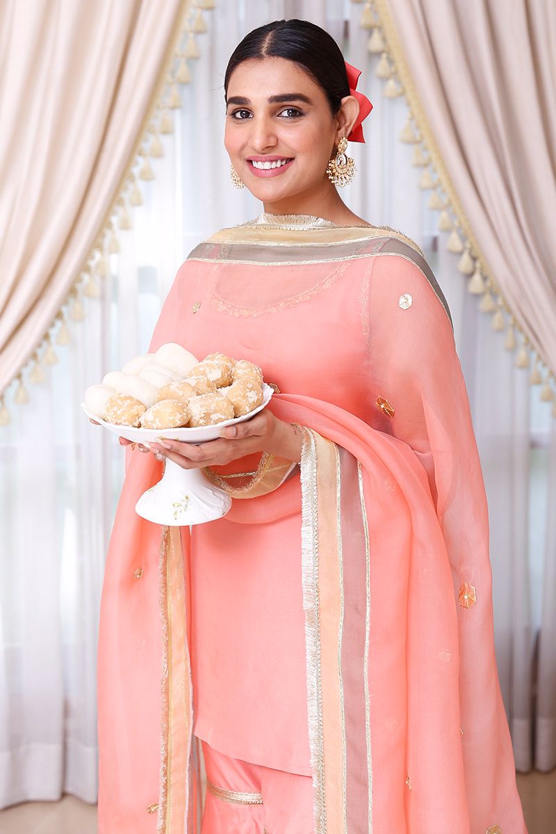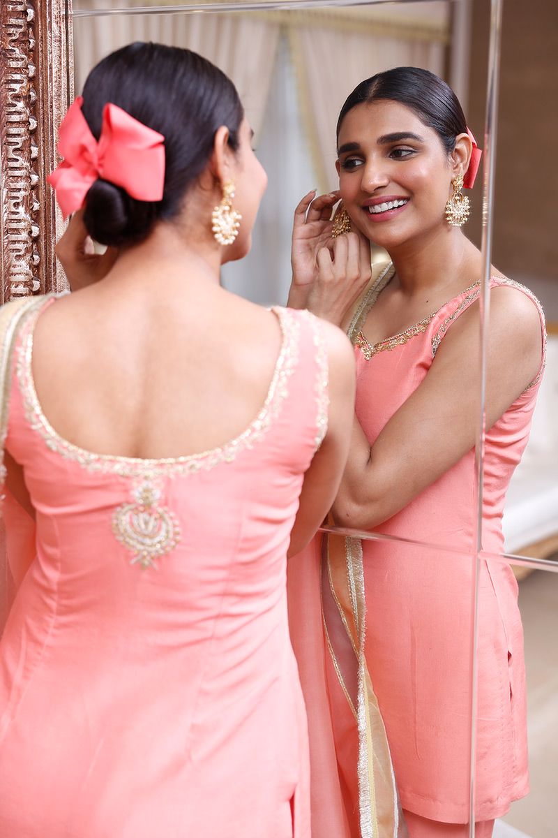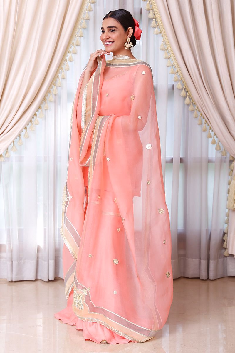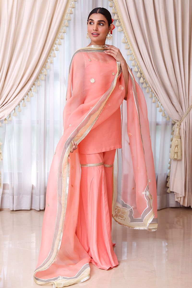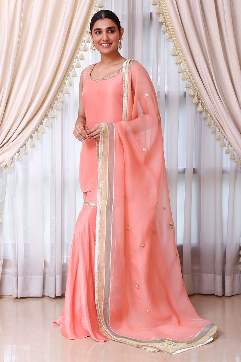 The marvelous, this coral peach pure raw silk short shirt is a true color of elegance. The front and back of the shirt have delicate work of zari, zardozi, sequins and gota, the shirt is paired with the same color pure raw silk gharara with detailings of gota on it. Dupatta is of pure organza with four-sided contrasted patchwork embellished with gota work all over,a beautiful attire for a number of festivities.